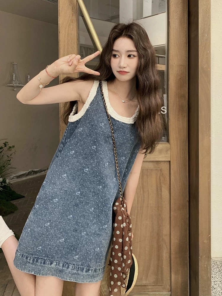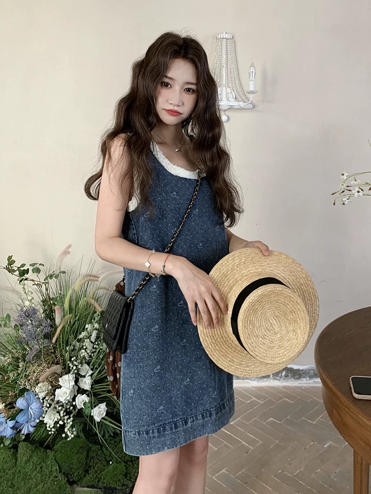BY17543# 复古休闲气质提花牛仔连衣裙女夏新款小个子木耳边圆领背心裙 服裝批發女裝批發服飾貨源