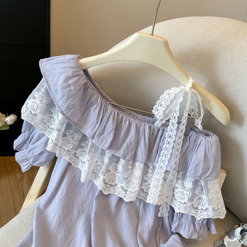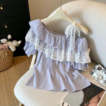 BY17547# 夏季新款时尚百搭一字肩荷叶边蕾丝拼接短袖衬衫上衣女 服裝批發女裝批發服飾貨源
