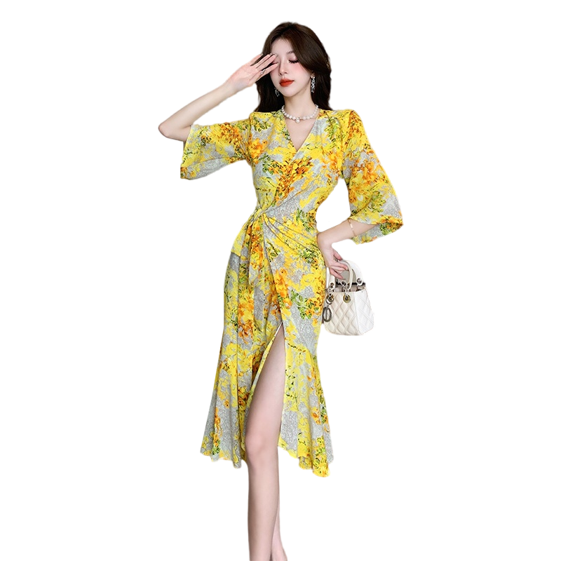 BY17567# 名媛性感印花修身度假风长裙法式连衣裙有里布版型正退货少 服裝批發女裝批發服飾貨源
