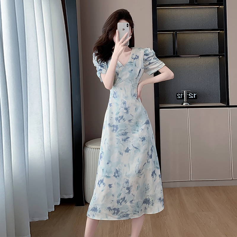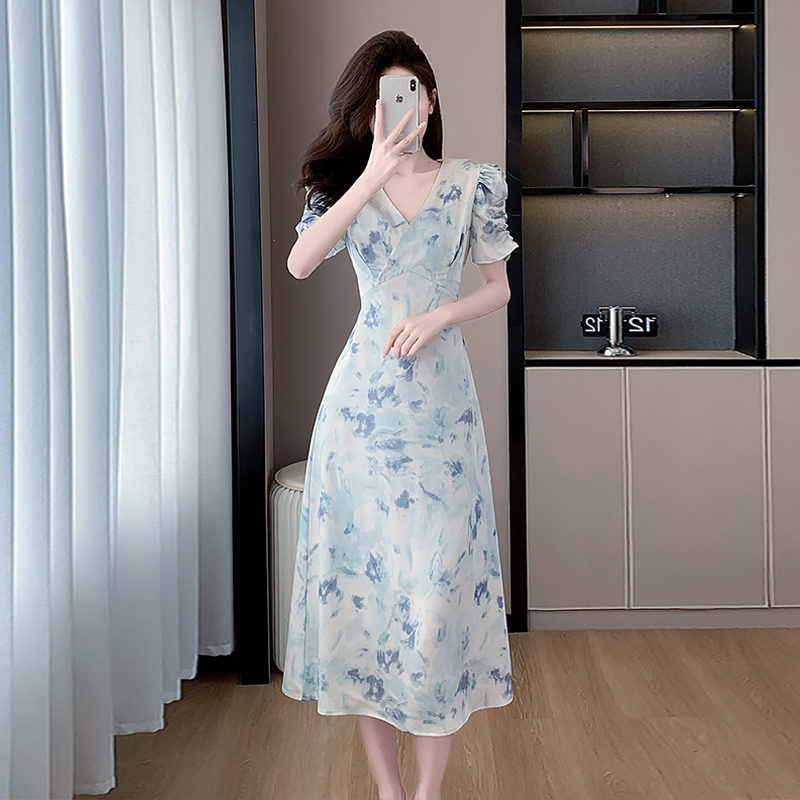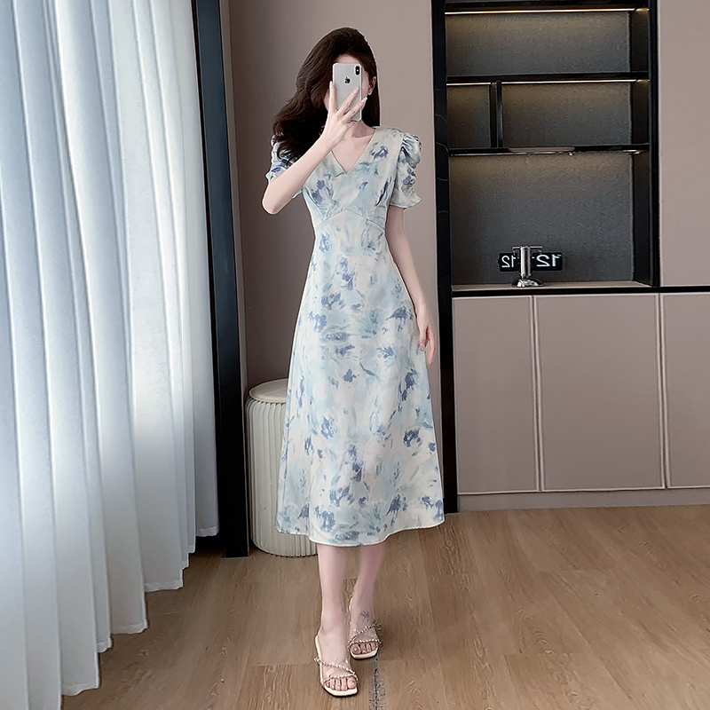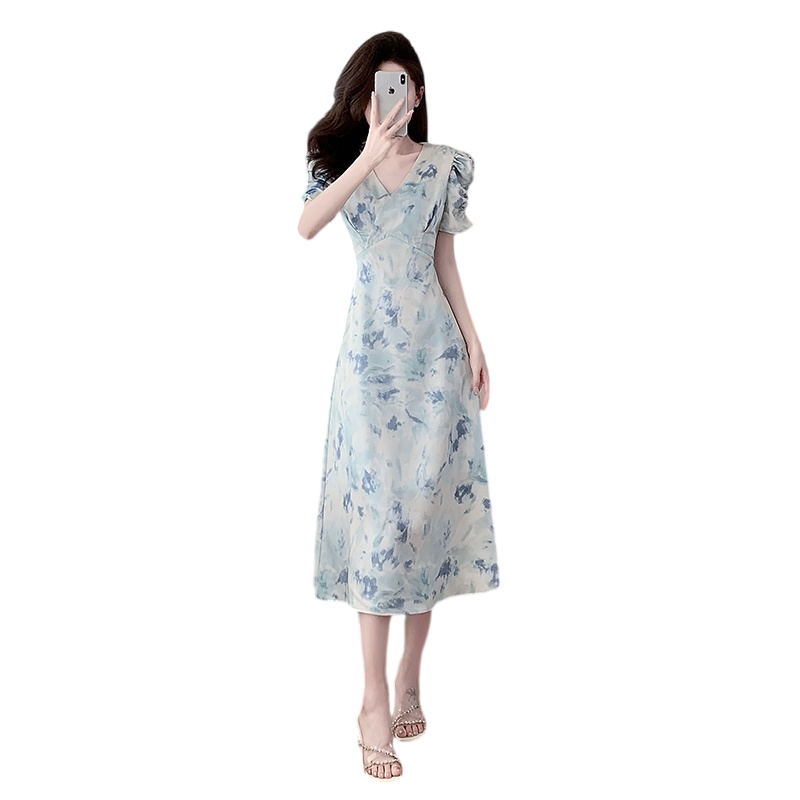 BY17571# 梅子熟了月下白提花泡泡袖a字连衣裙夏季新款V领花色长裙 服裝批發女裝批發服飾貨源