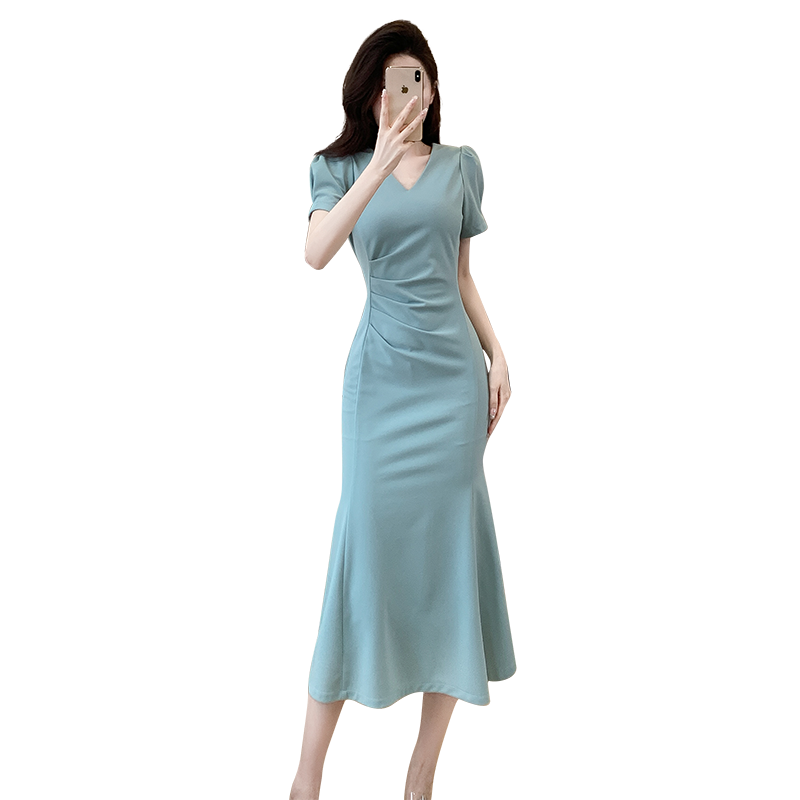 BY17575# 网红爆款时尚连衣裙夏季新款高级感V领泡泡袖显瘦鱼尾裙 服裝批發女裝批發服飾貨源