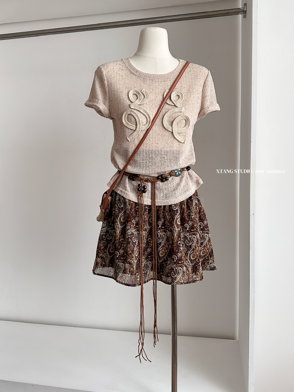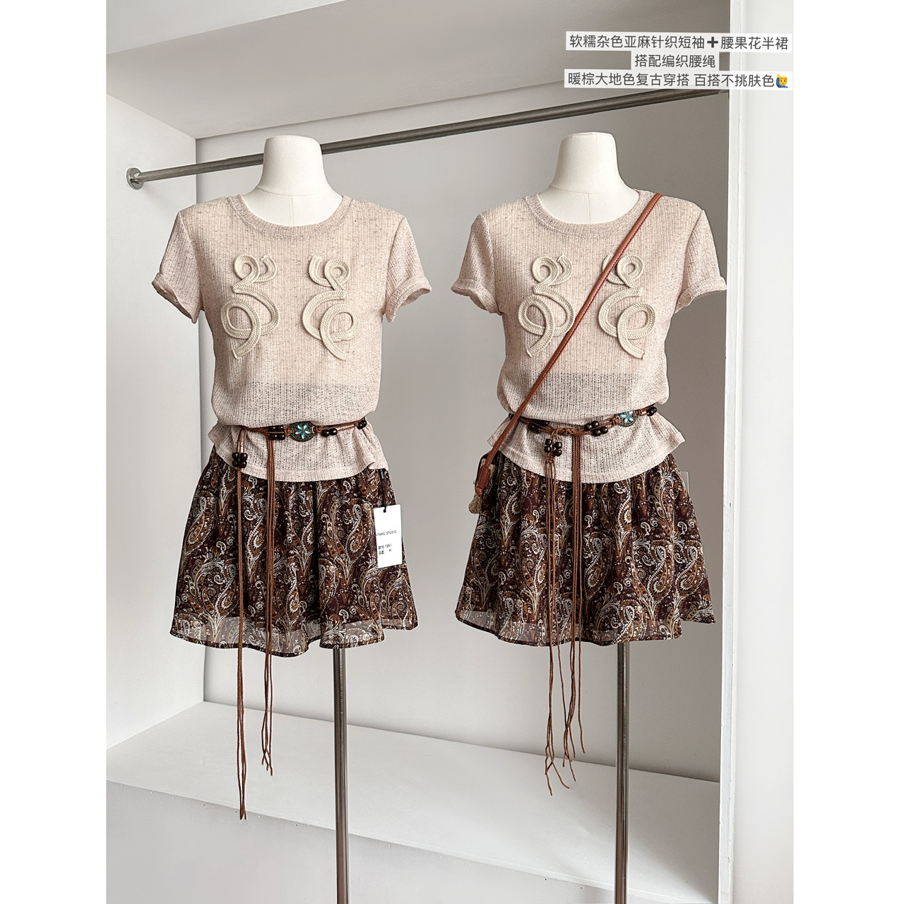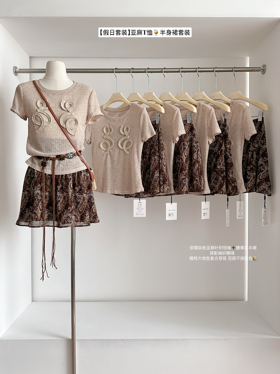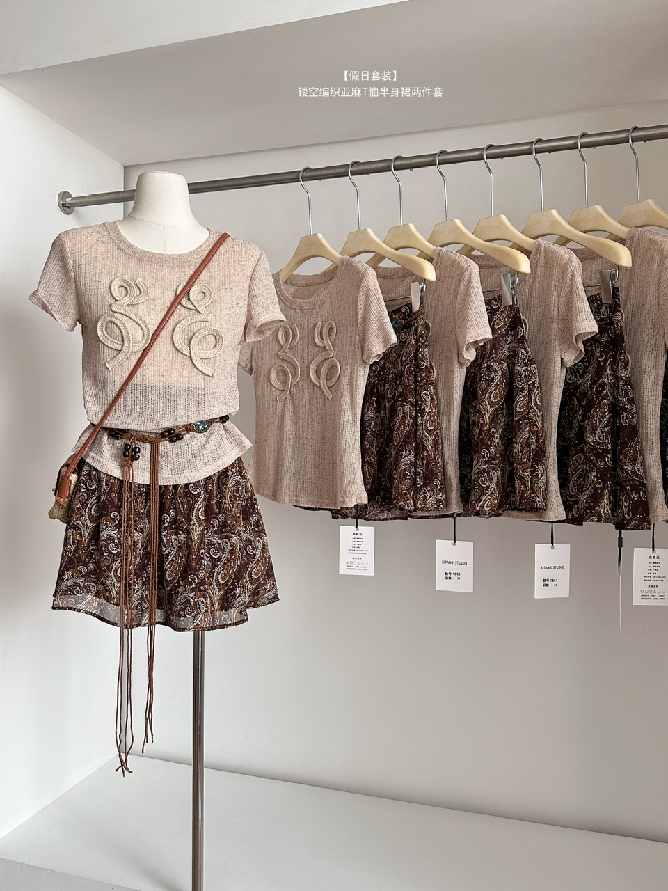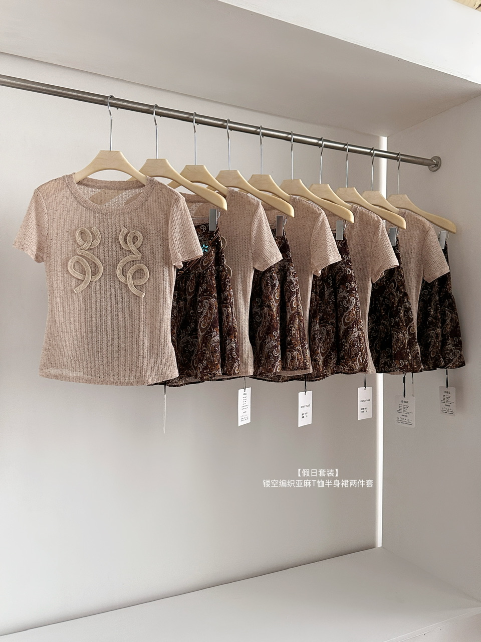 君君junjun假日套装设计感气质镂空编织亚麻T恤半身裙两件套 服裝批發女裝批發服飾貨源