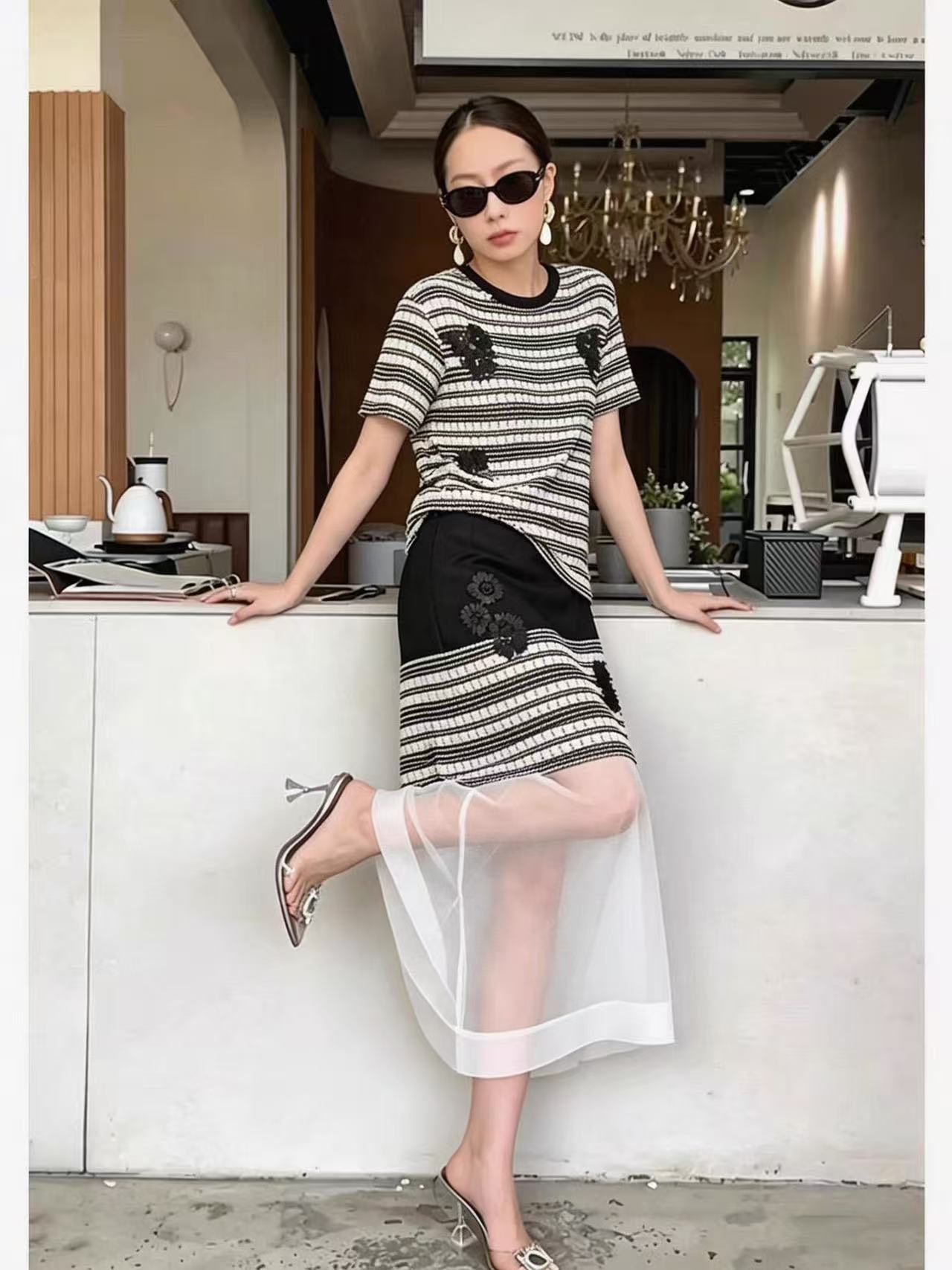 夏天套装女款新款休闲黑色条纹立体花朵短袖t恤半身裙两件套 服裝批發女裝批發服飾貨源