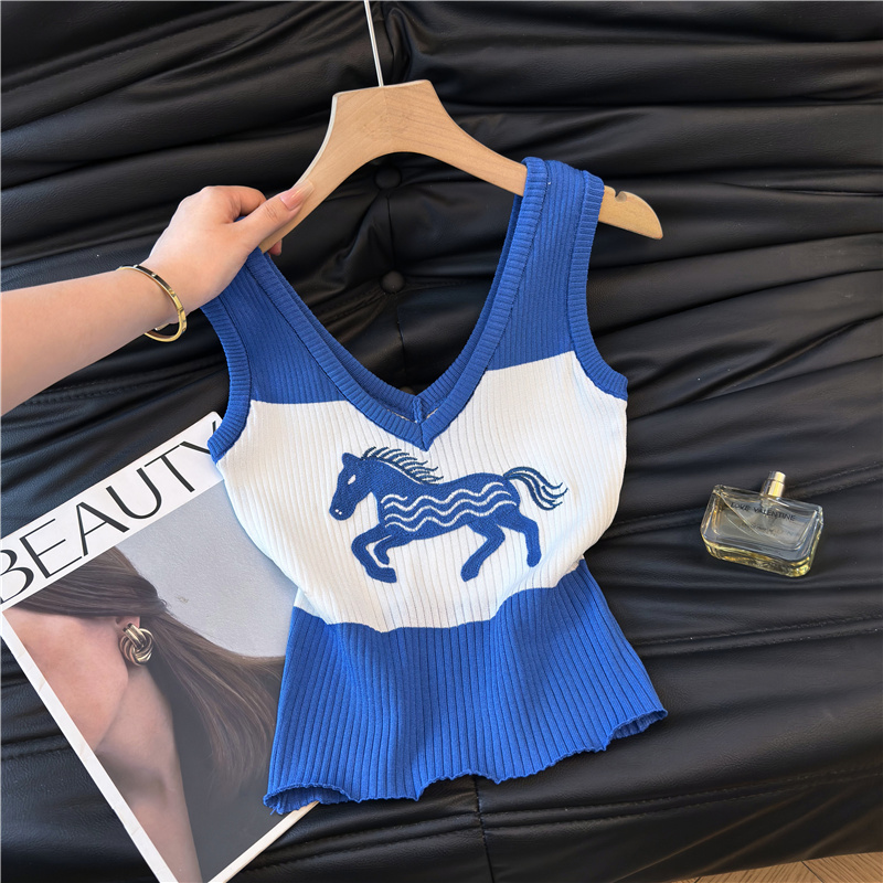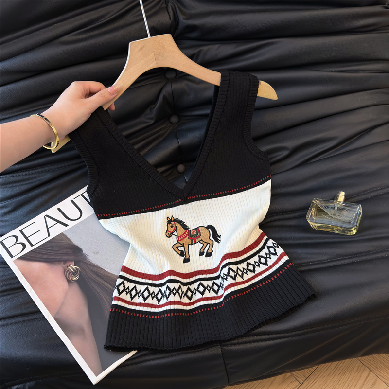 小马刺绣针织吊带背心女外穿夏季美式复古无袖抹胸上衣绝美 服裝批發女裝批發服飾貨源