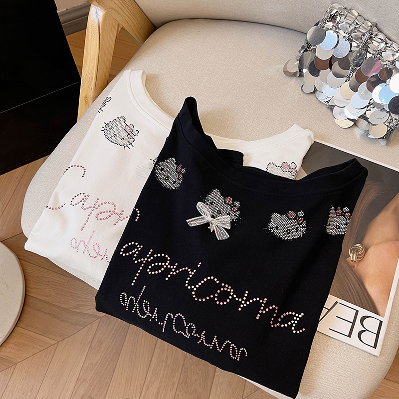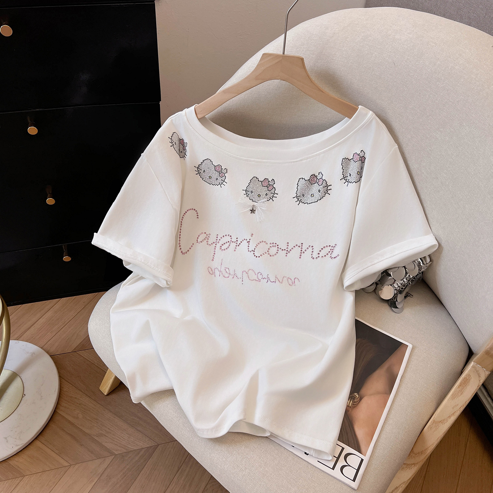 BY17747# 大码女装200斤螺纹短袖t恤夏新款潮宽松烫钻斜领上衣 服裝批發女裝批發服飾貨源