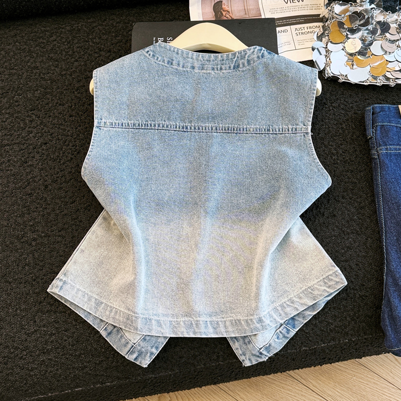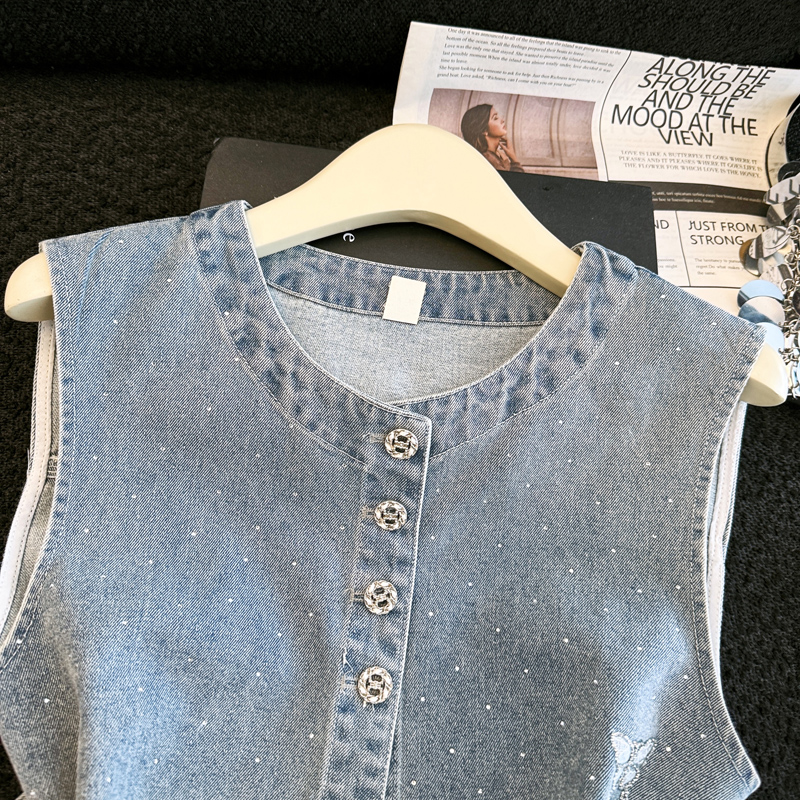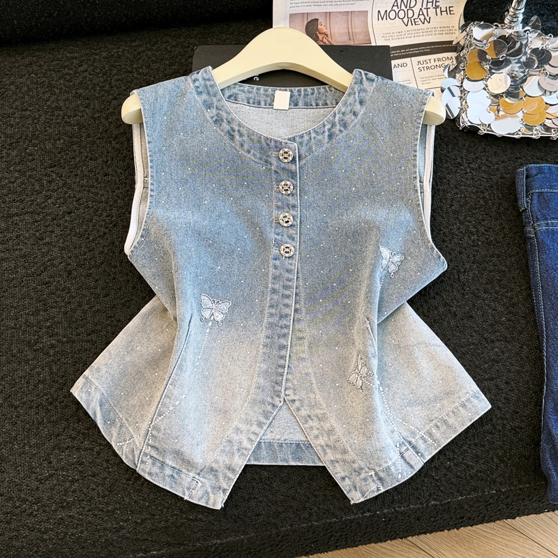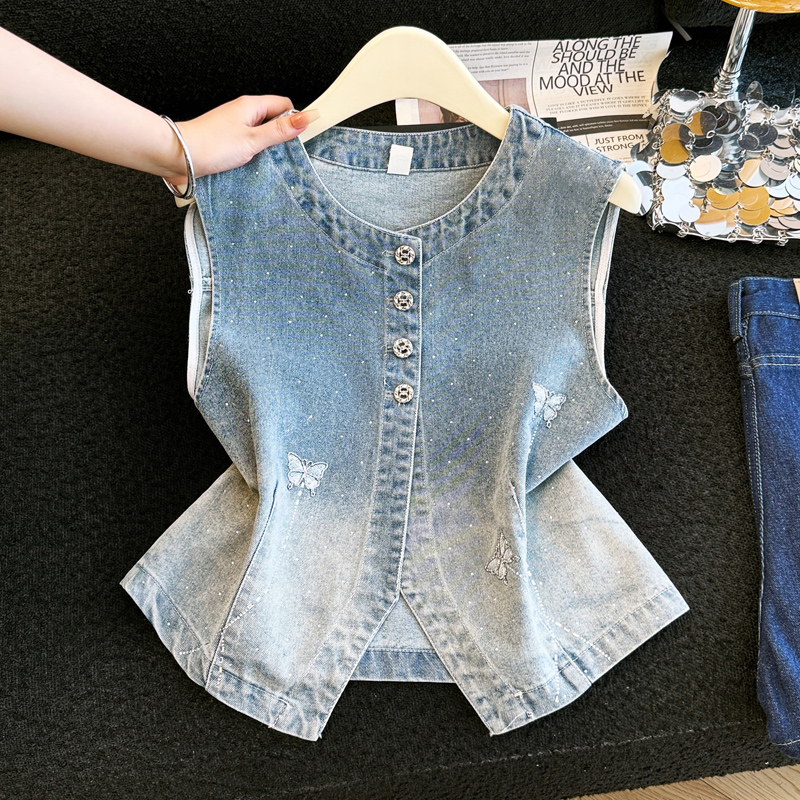 复古做旧闪钻蝴蝶牛仔马甲女春夏款圆领无袖叠穿背心外套 服裝批發女裝批發服飾貨源