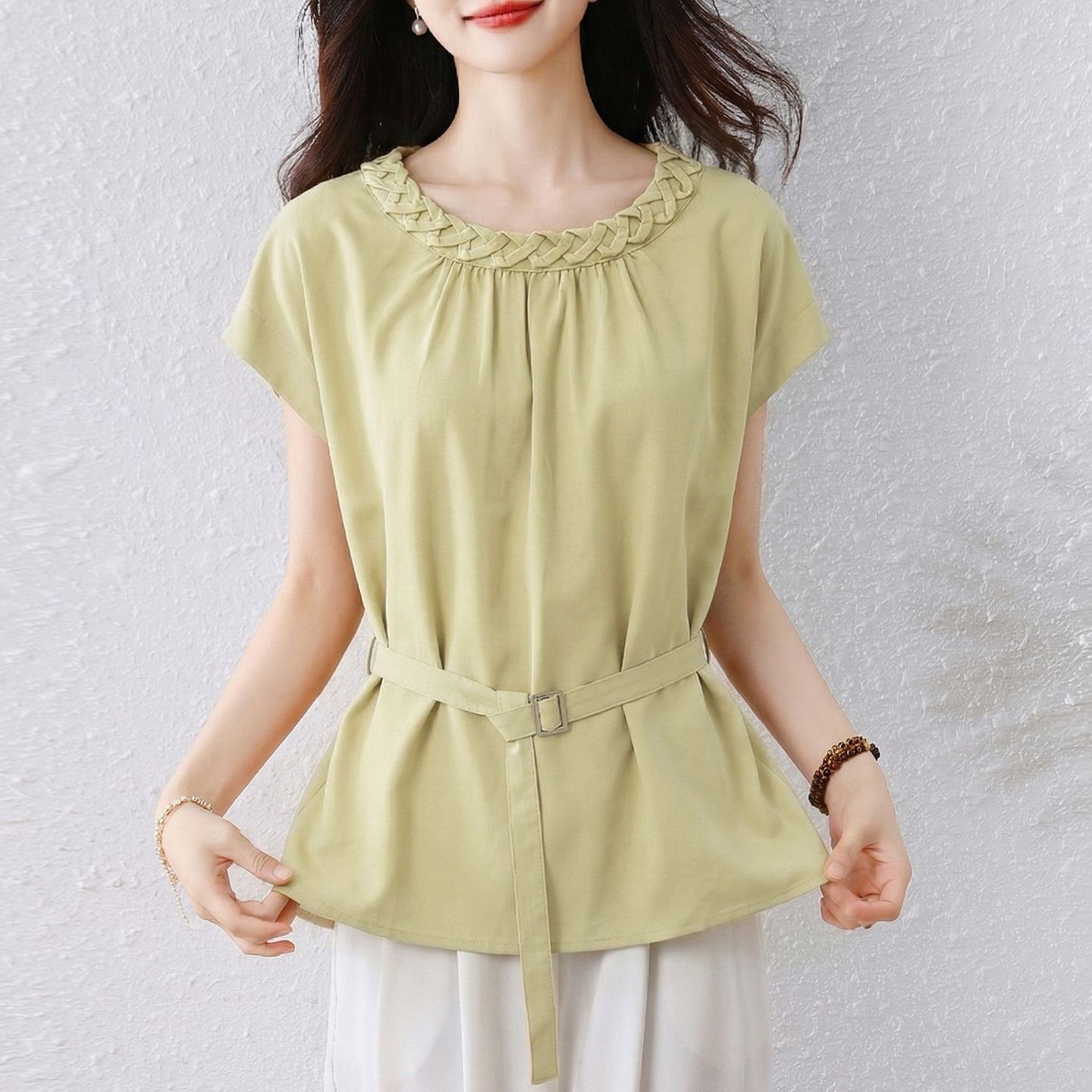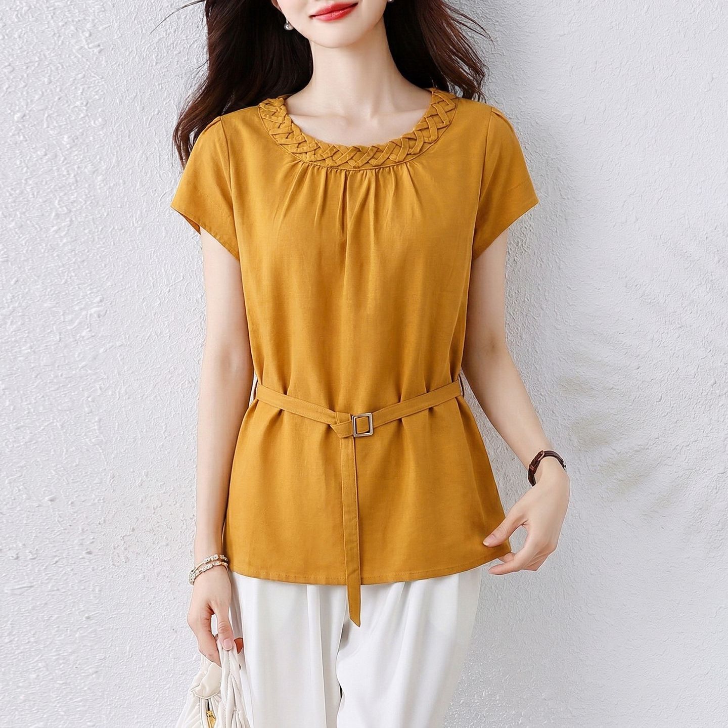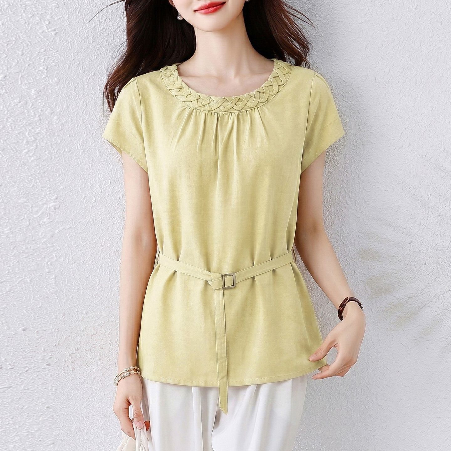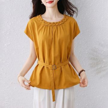 夏季新款胖MM简约圆领短袖上衣女收腰显瘦气质大码内搭衬衫 服裝批發女裝批發服飾貨源