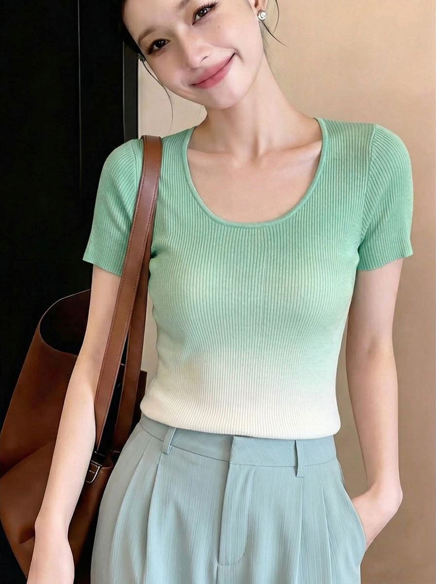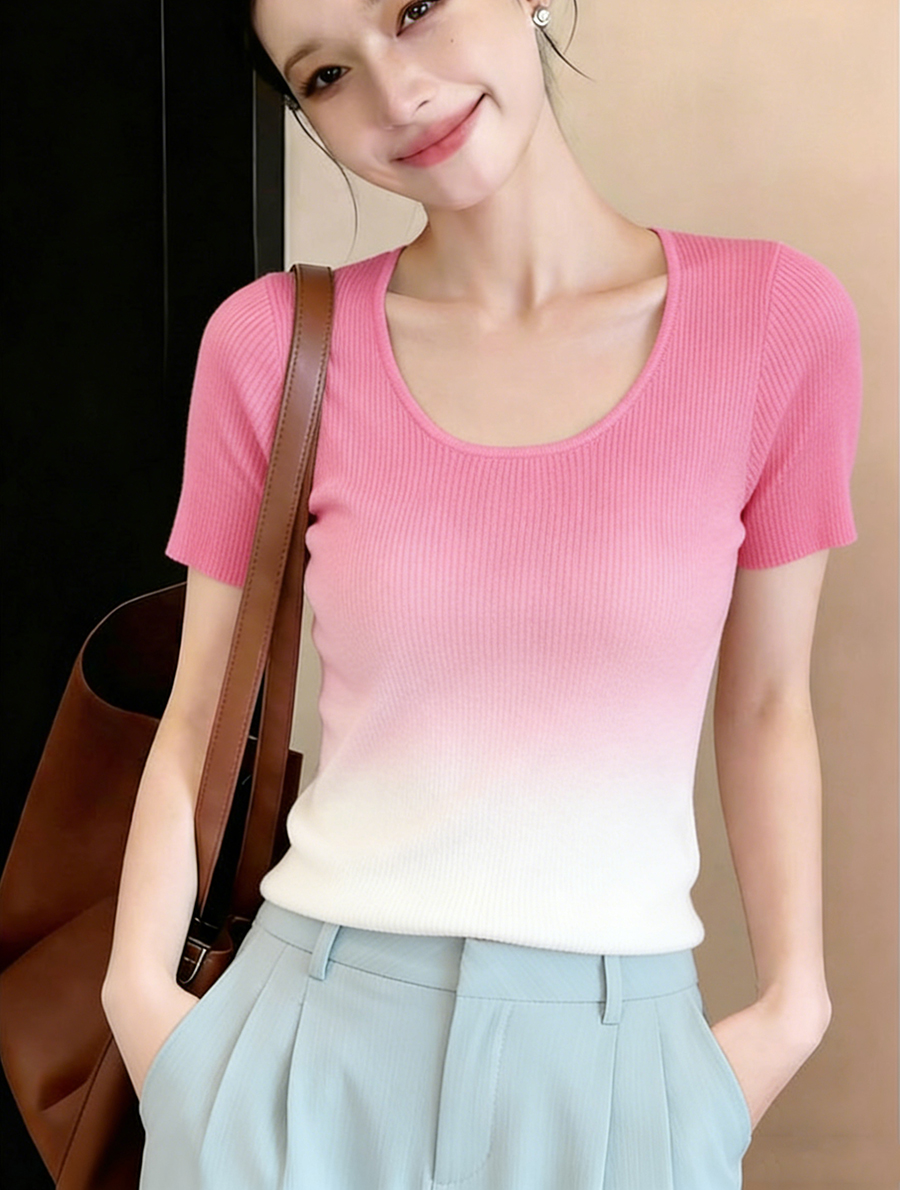 BY18045# 渐变色u领冰丝针织正肩短袖t恤女夏设计感小众法式别致粉色上衣薄 服裝批發女裝批發服飾貨源