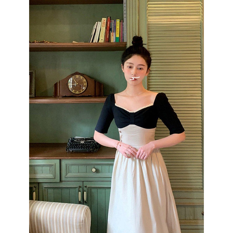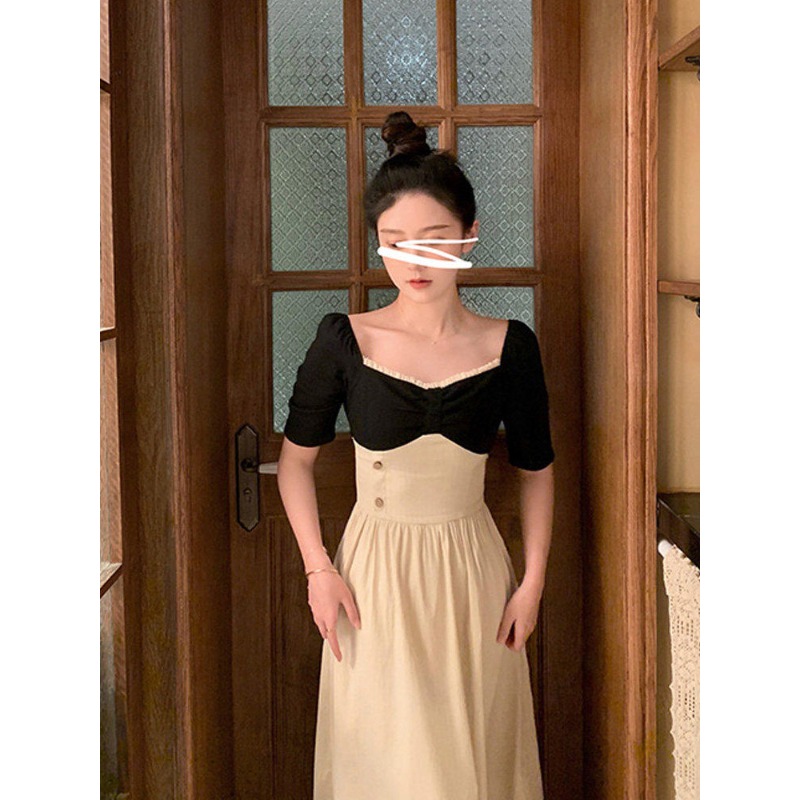 BY18396# 茶歇法式方领芭蕾风连衣裙方领拼接设计感小众显瘦撞色长裙女夏季 服裝批發女裝批發服飾貨源