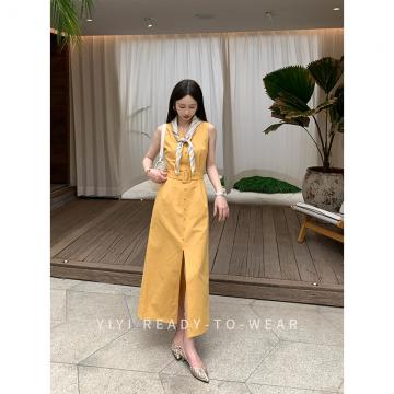 BY18418# 小个子黄色无袖连衣裙女夏季新款收腰V领开叉长裙 服裝批發女裝批發服飾貨源