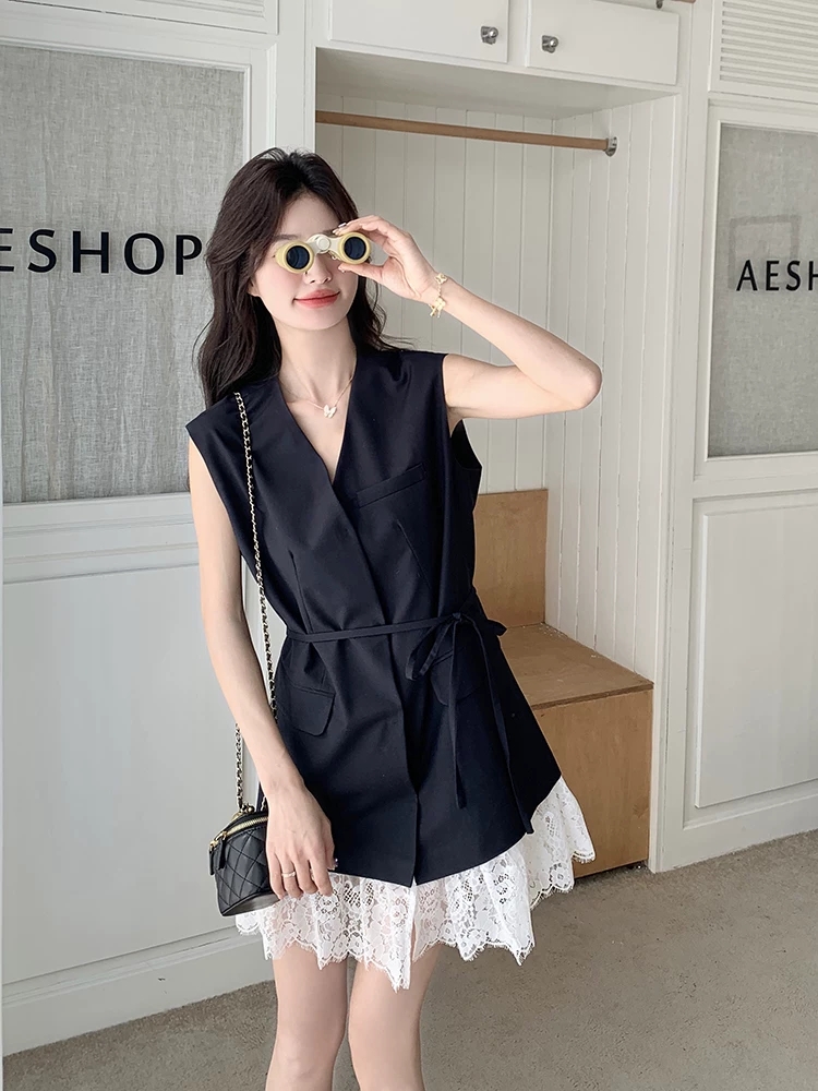 BY18424# 设计感蕾丝拼接无袖连衣裙女夏季新款气质高级感西装短裙 服裝批發女裝批發服飾貨源