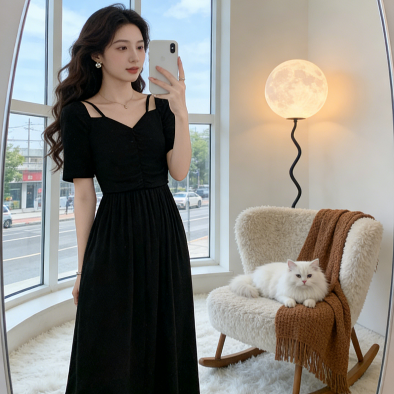 BY18468# 法式甜辣露肩长裙子女夏季气质设计感显瘦短袖别致连衣裙潮 服裝批發女裝批發服飾貨源