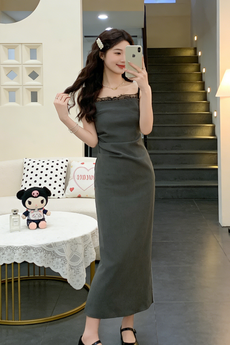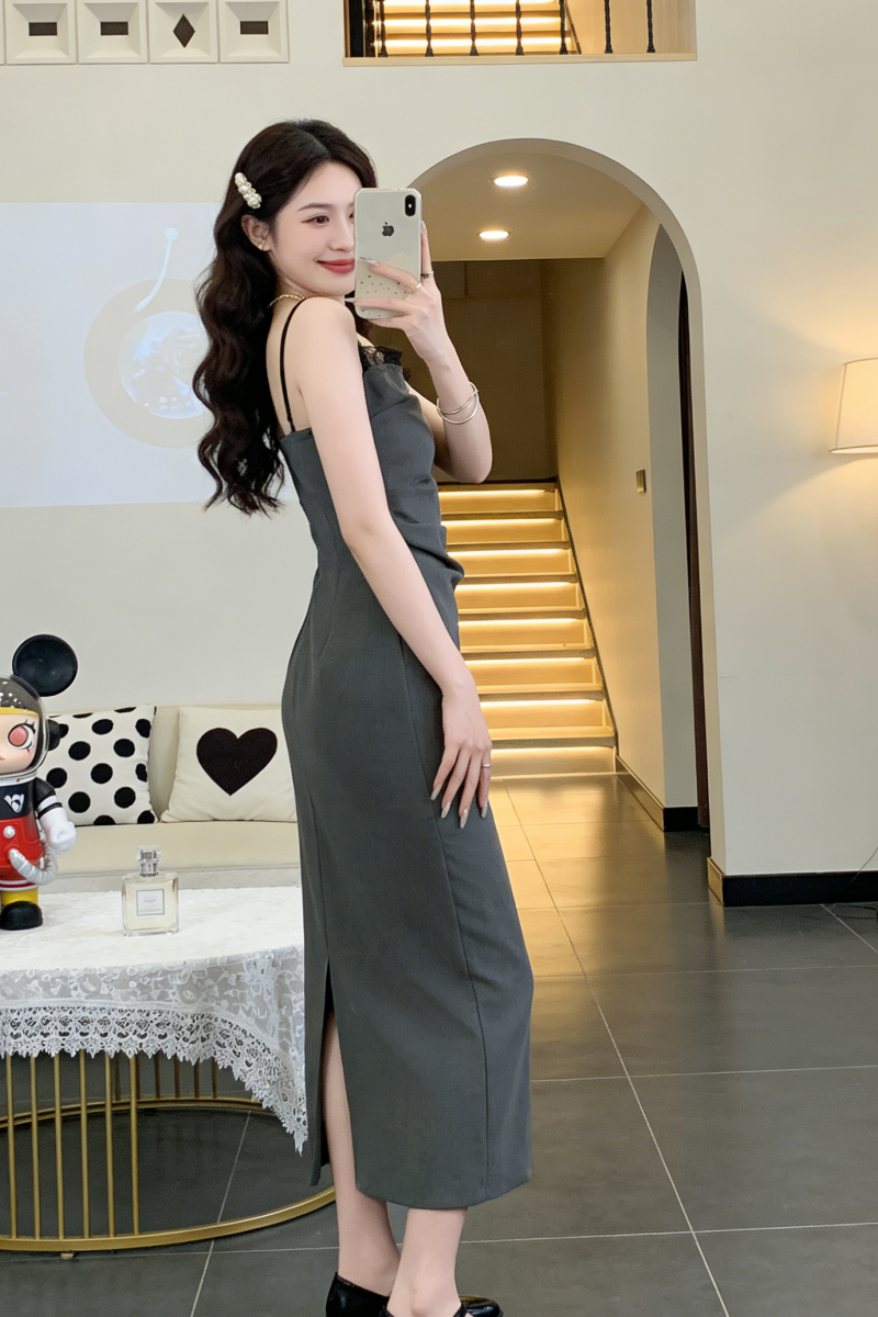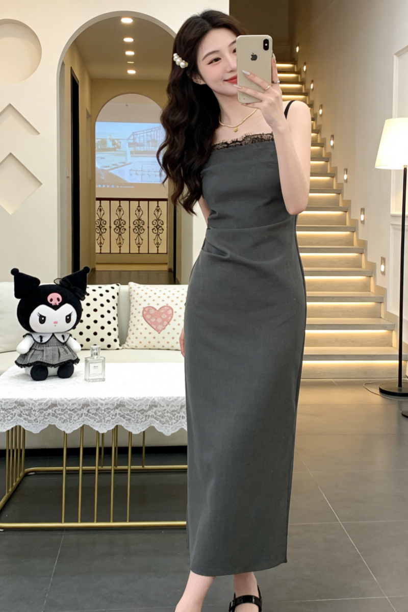 BY18473# 法式灰色蕾丝拼接吊带连衣裙子女夏季新款气质包臀长裙 服裝批發女裝批發服飾貨源