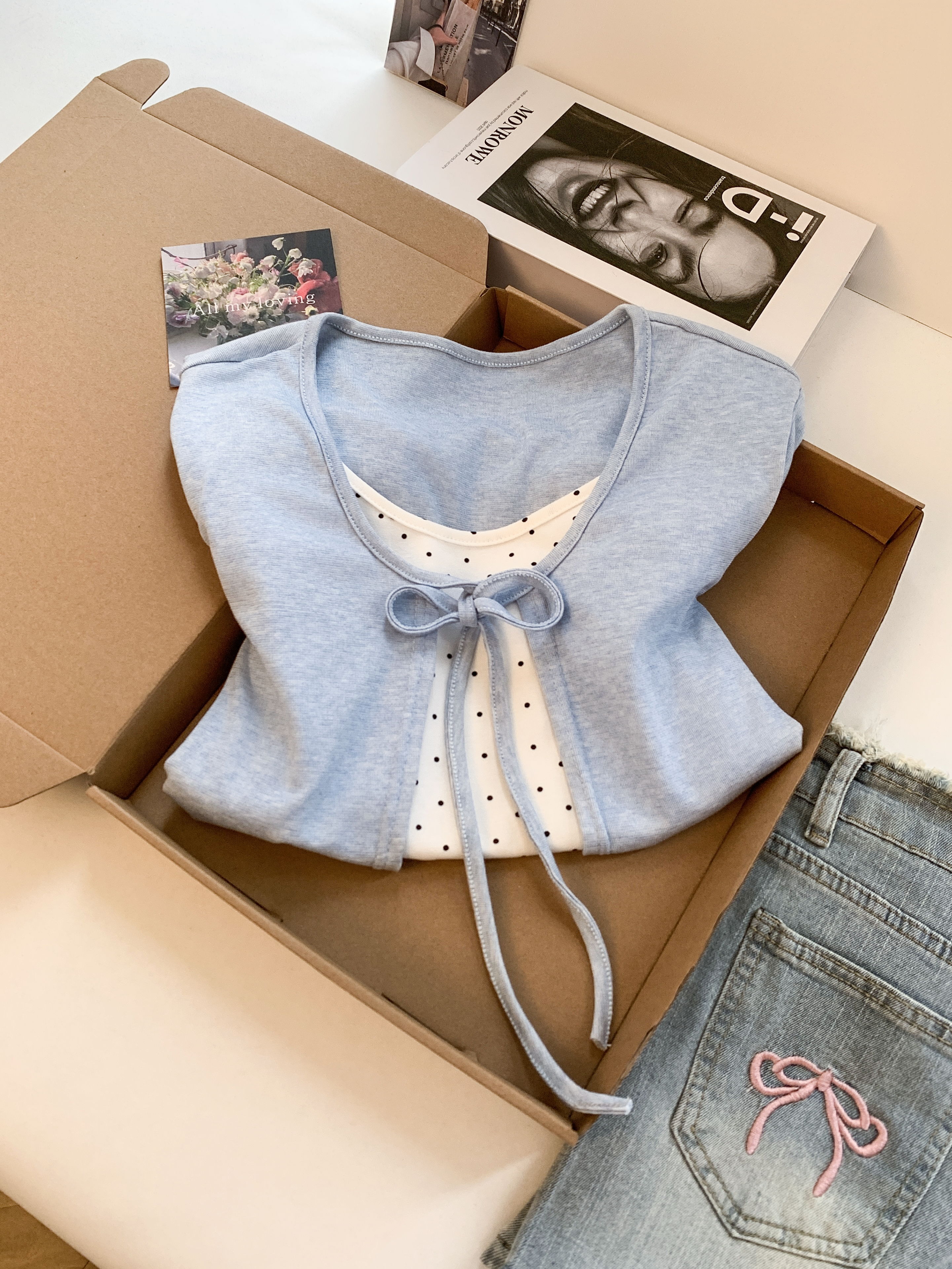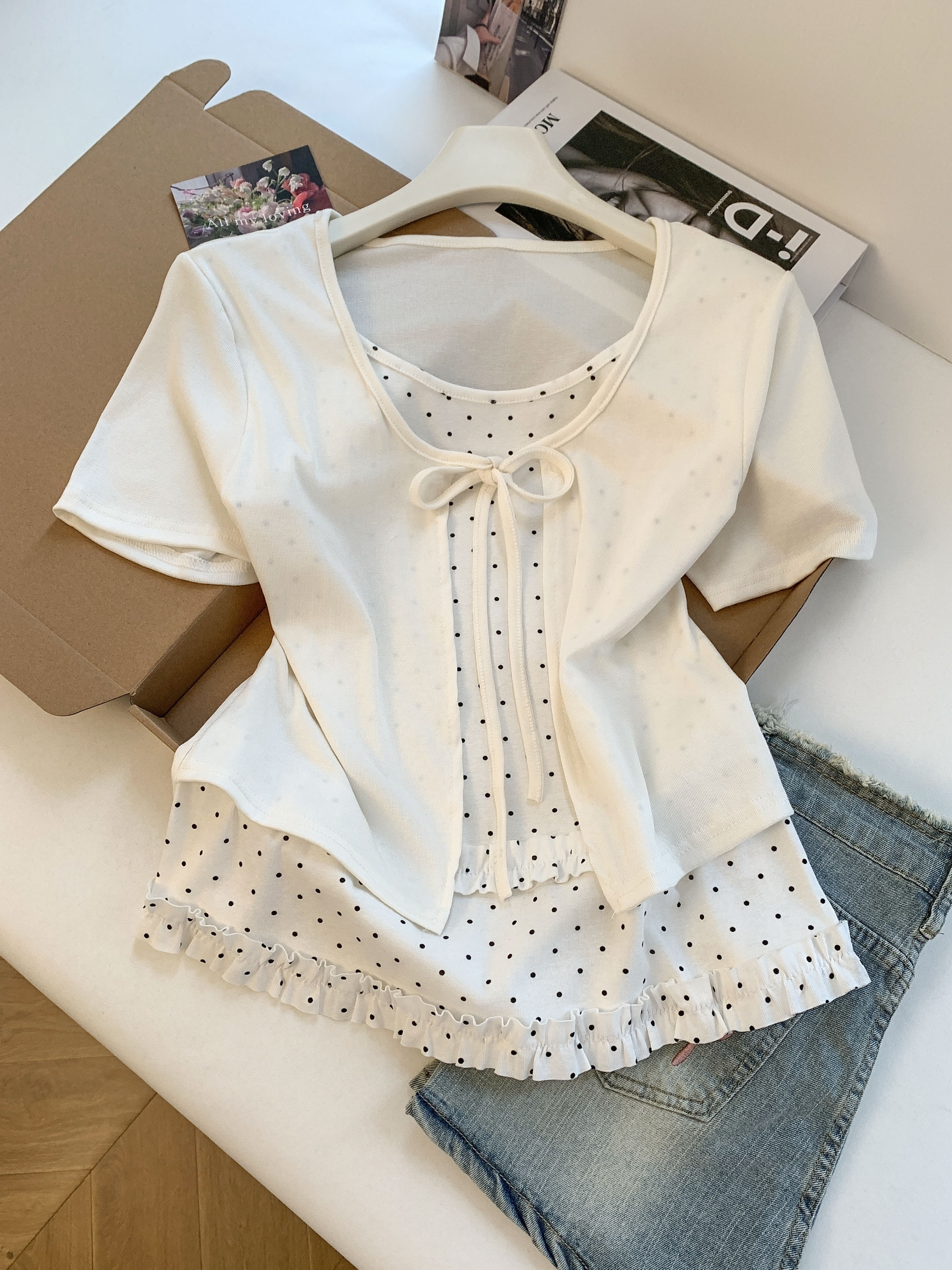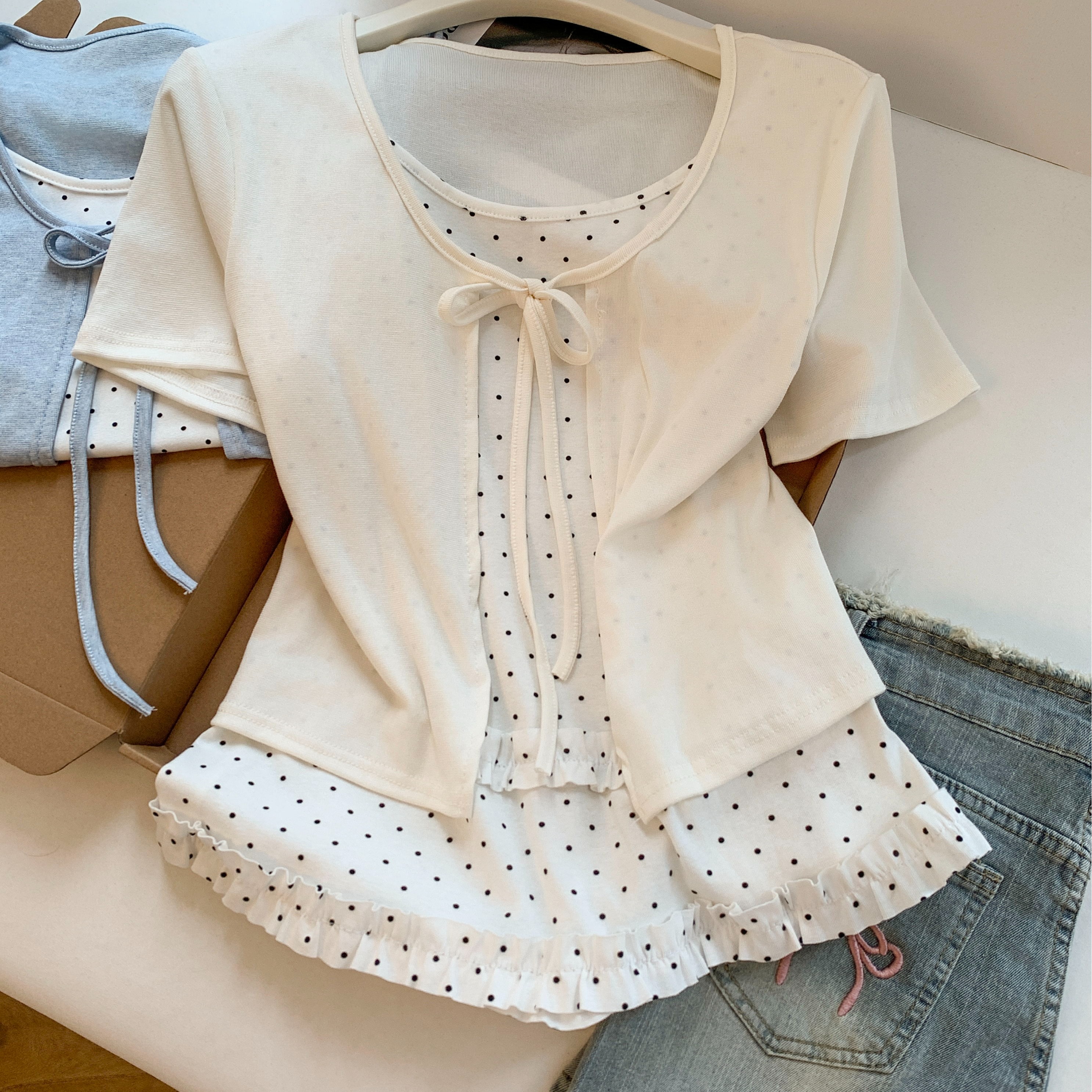 BY18498# 夏季撞色波点系带假两件短袖T恤女夏季新款甜美风小众上衣 服裝批發女裝批發服飾貨源