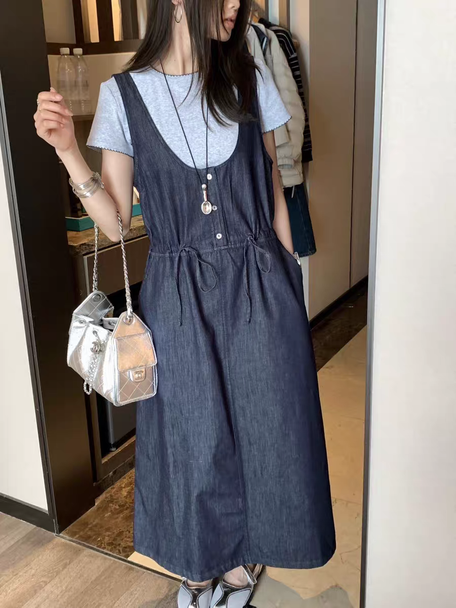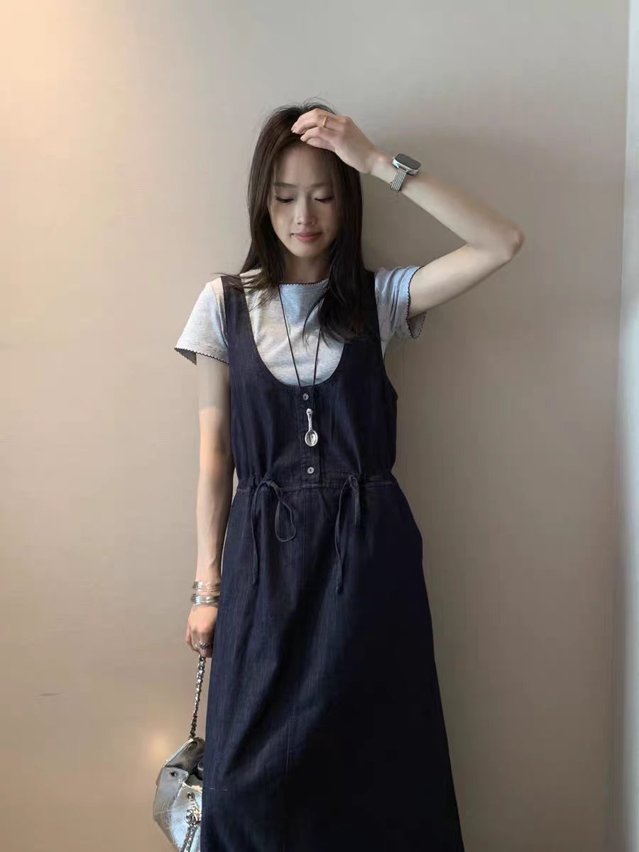 BY18881# 深蓝色抽绳收腰牛仔背带裙套装新款女春夏季韩版miu系连衣裙 服裝批發女裝批發服飾貨源