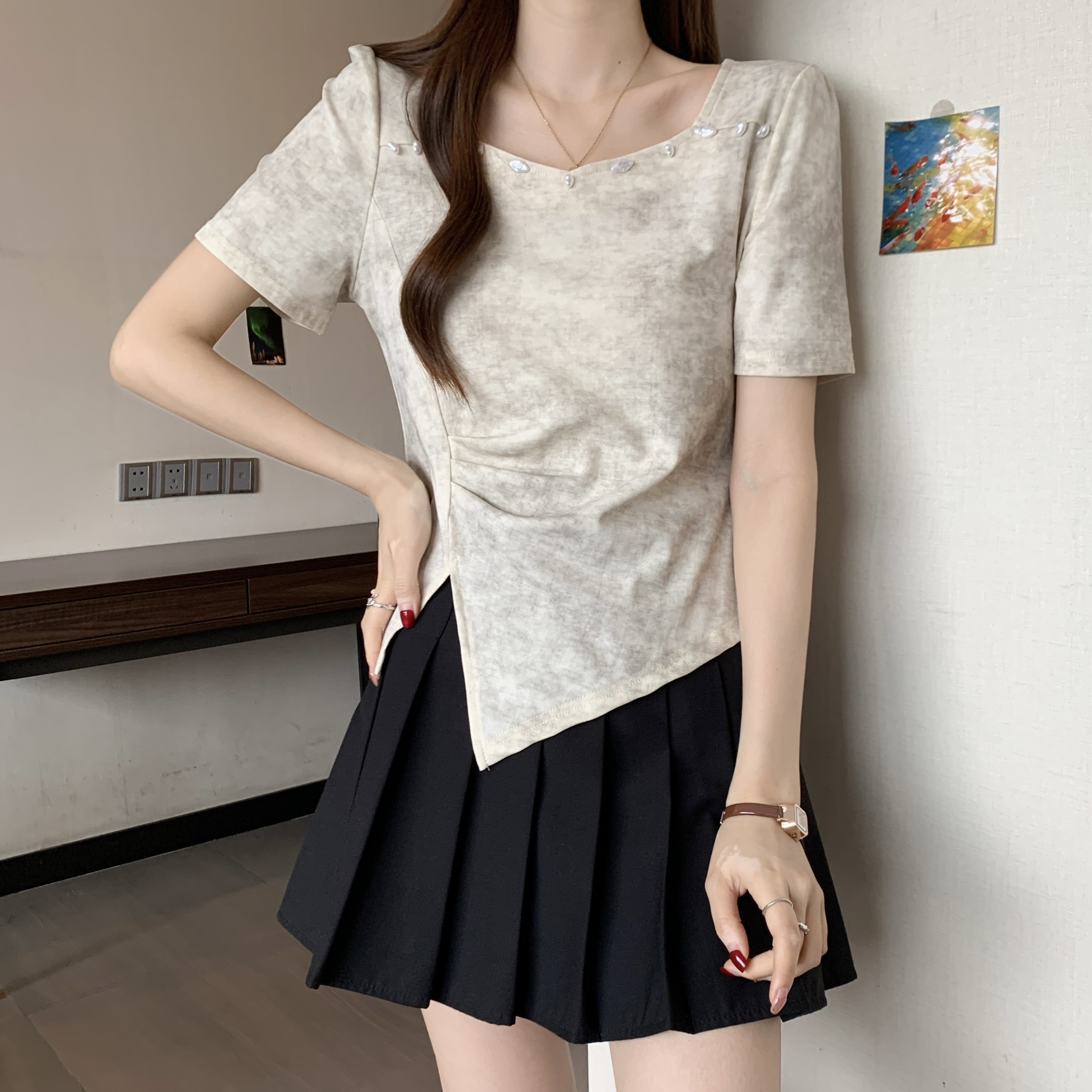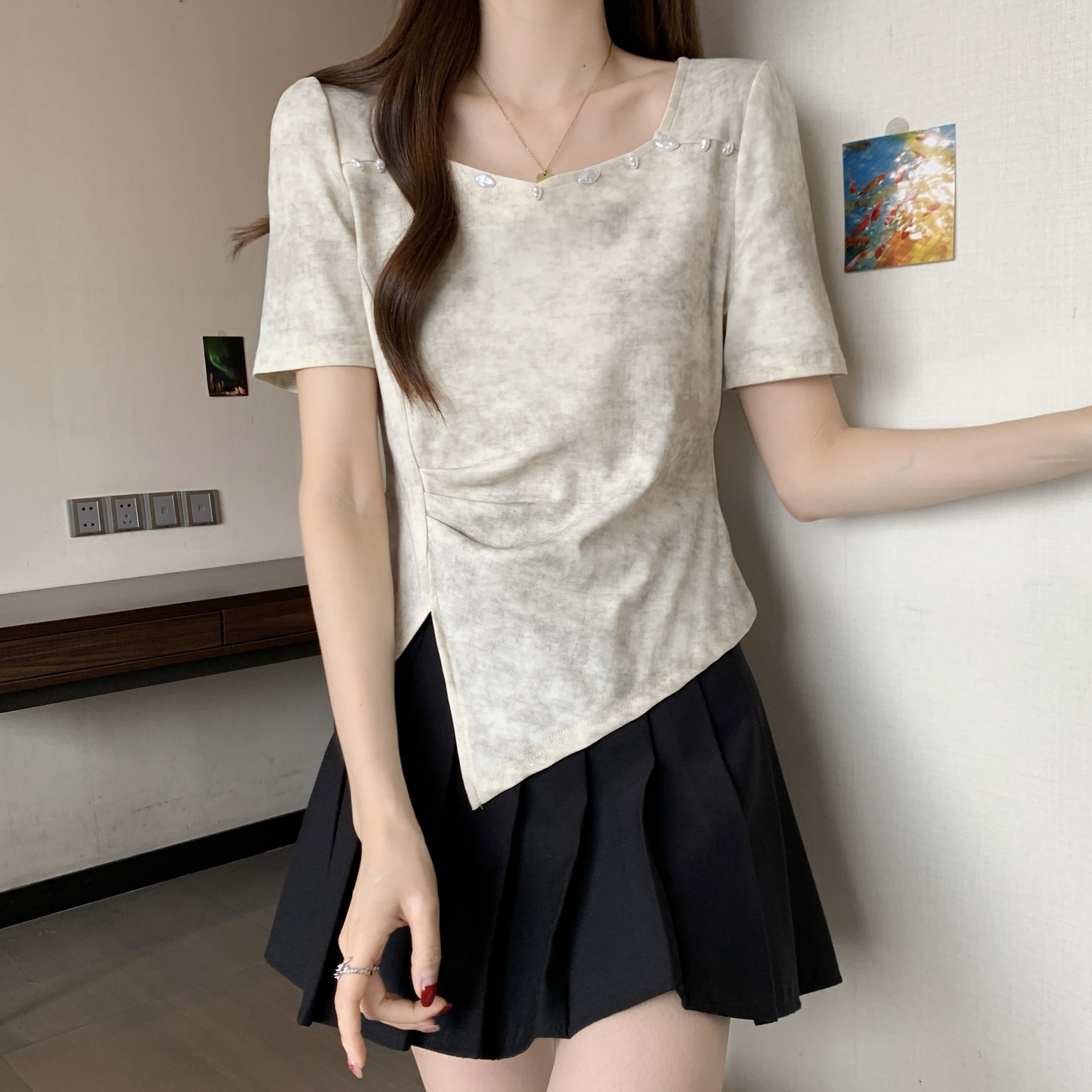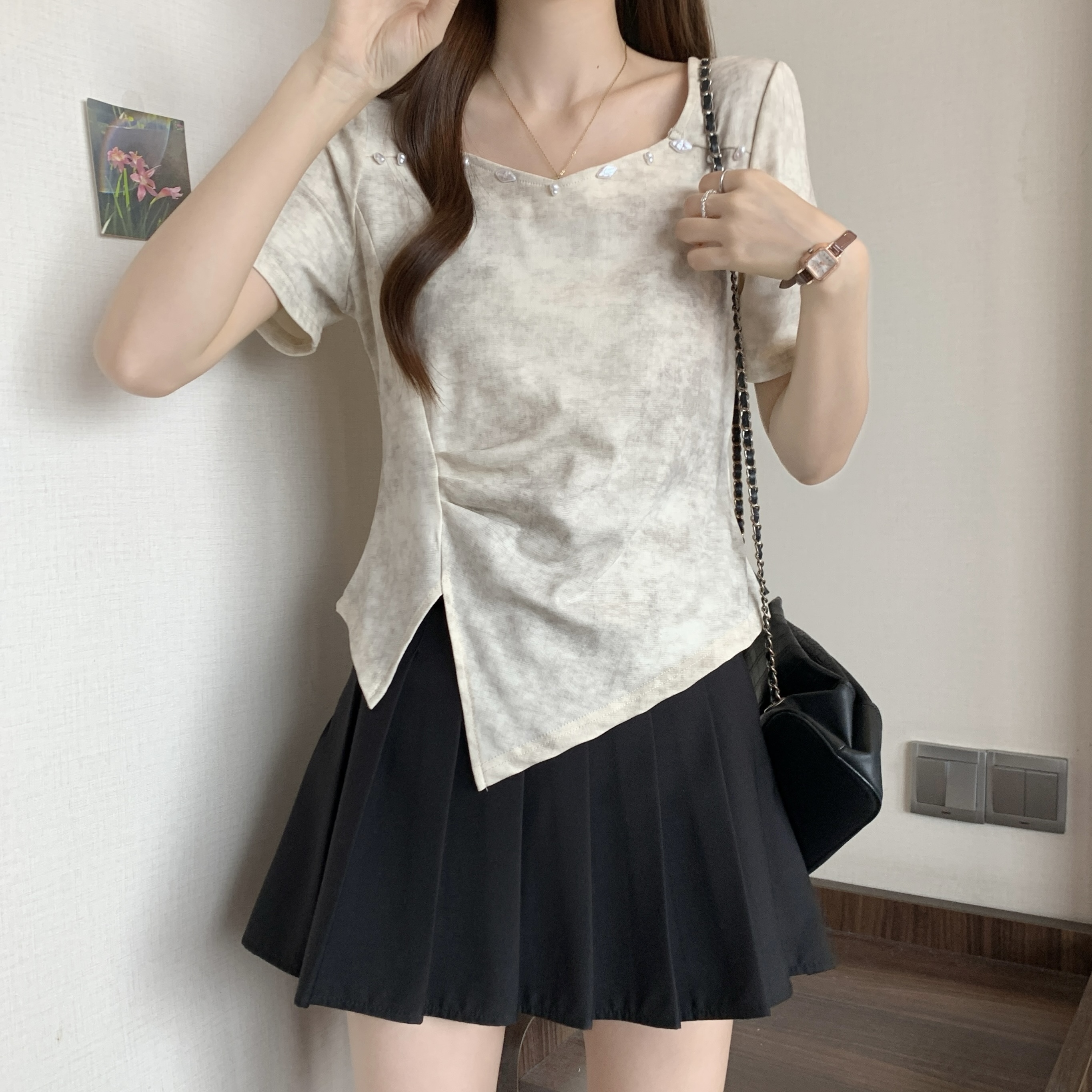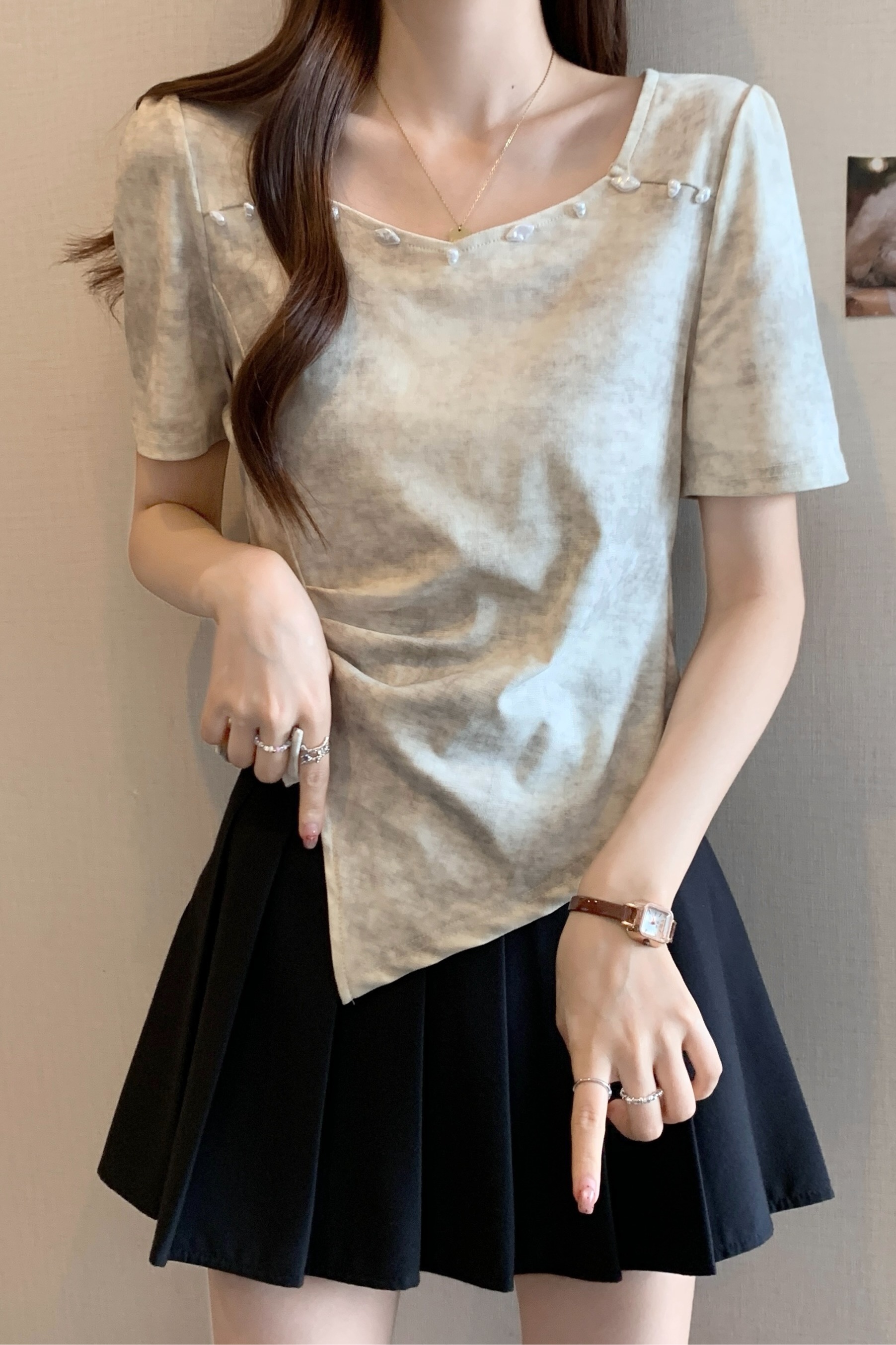 FA34398# 大码女装染色短袖T恤女夏季新款设计感钉珠百搭上衣 服裝批發女裝批發服飾貨源
