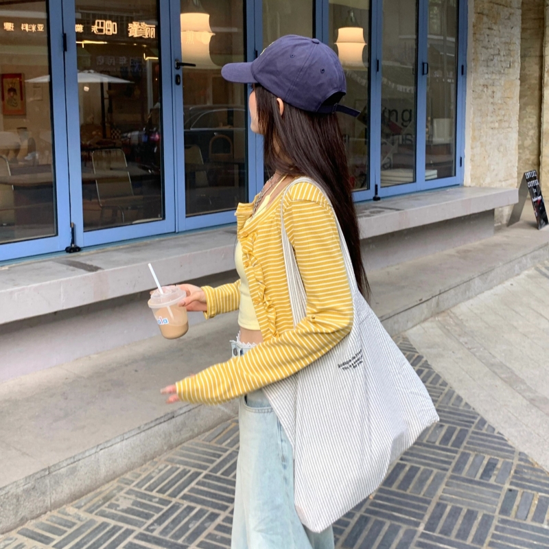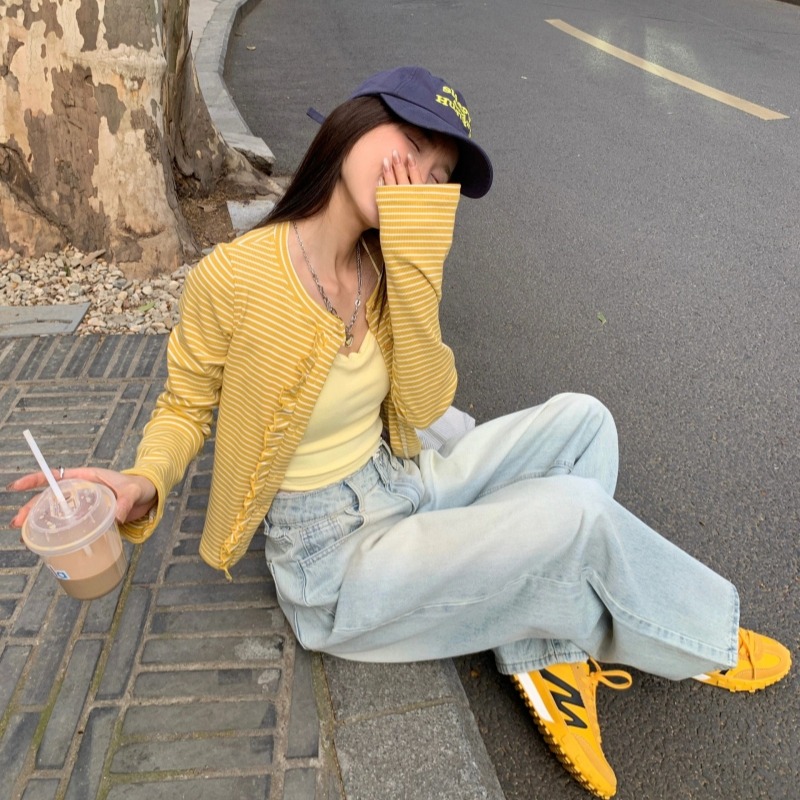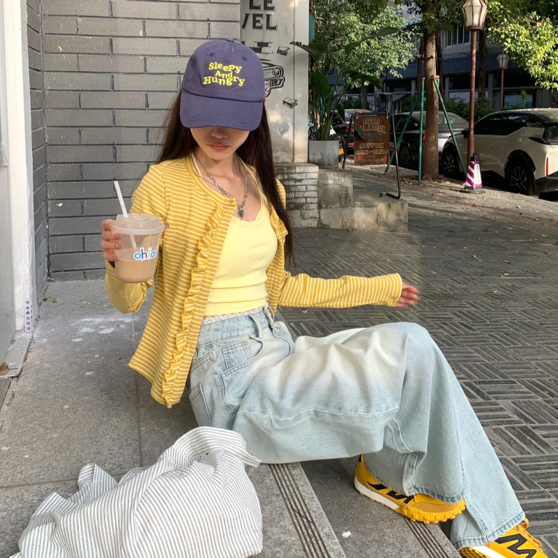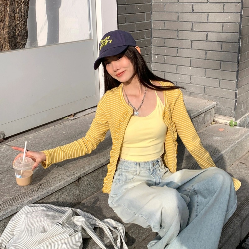 FA35453# 条纹木耳花边针织衫秋冬季新款多巴胺亮色修身减龄开衫外套女 服裝批發女裝批發服飾貨源