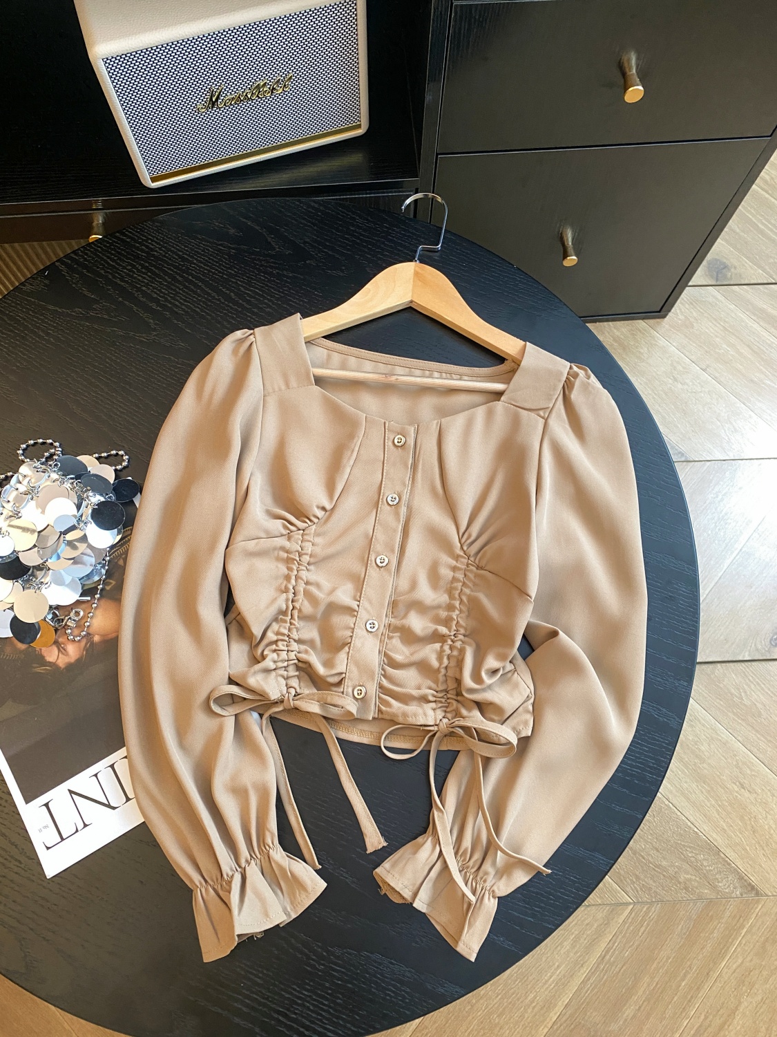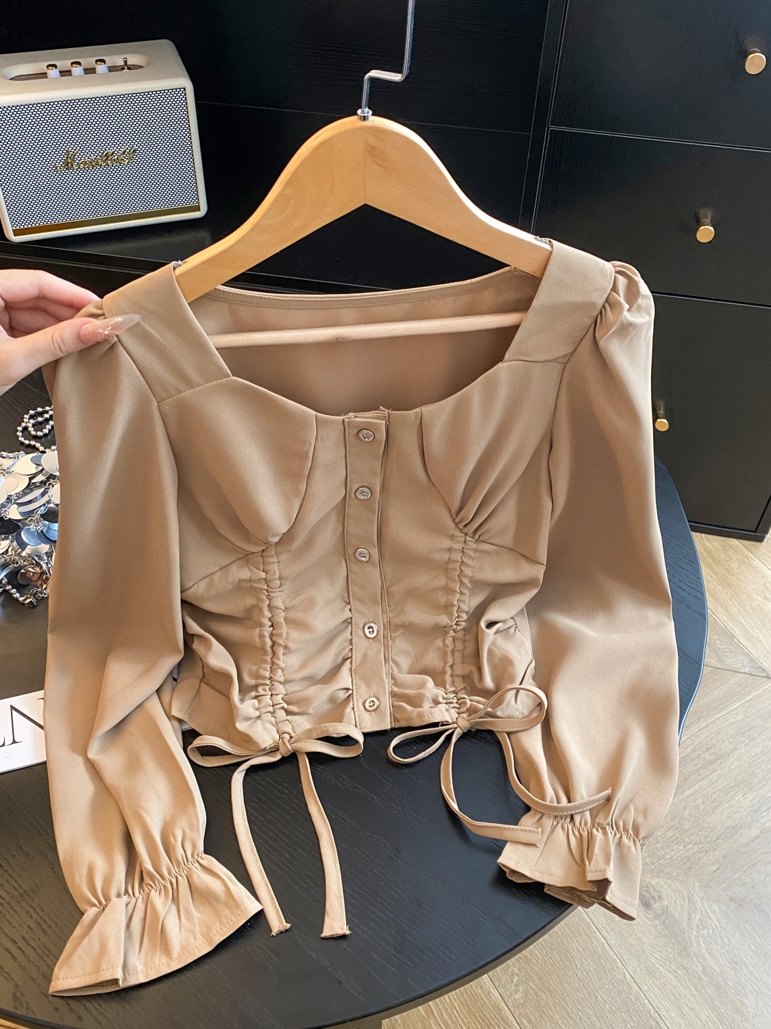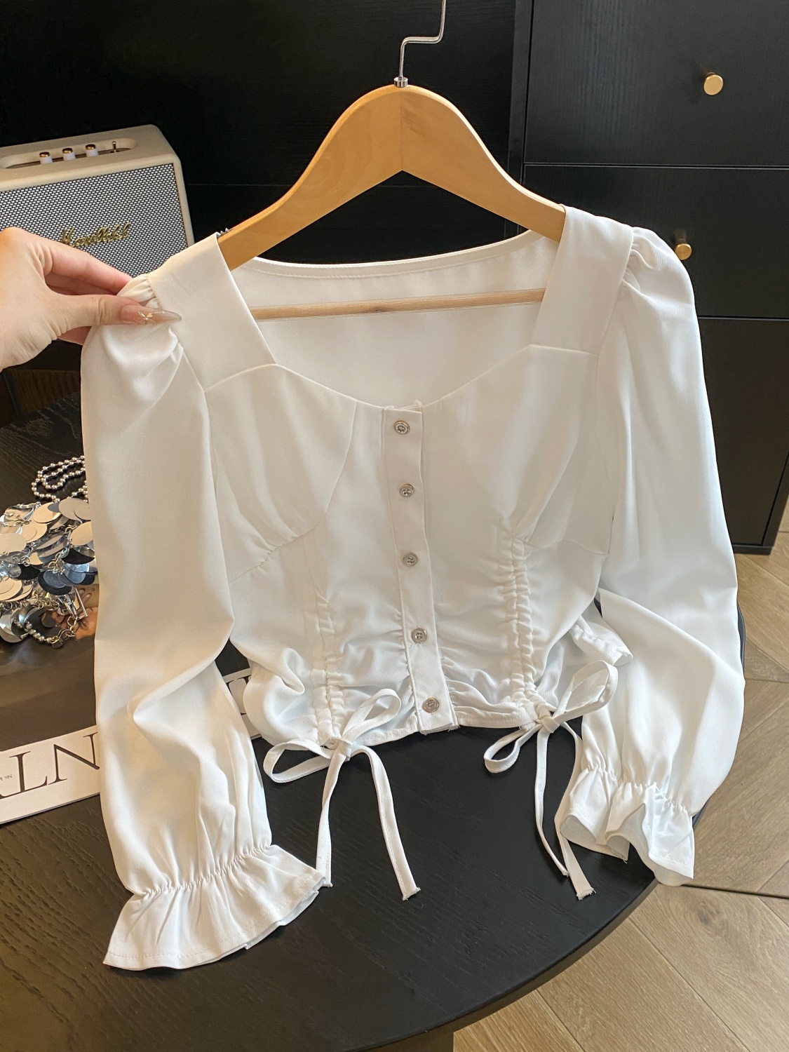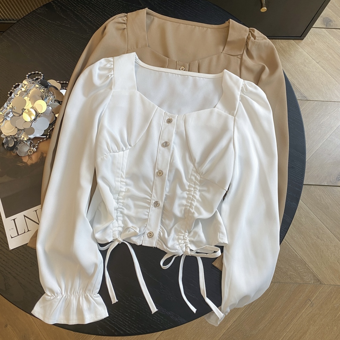 FA36535# 法式方领抽褶短款衬衫女春季设计感小众上衣长袖纯欲小衫 服裝批發女裝批發服飾貨源