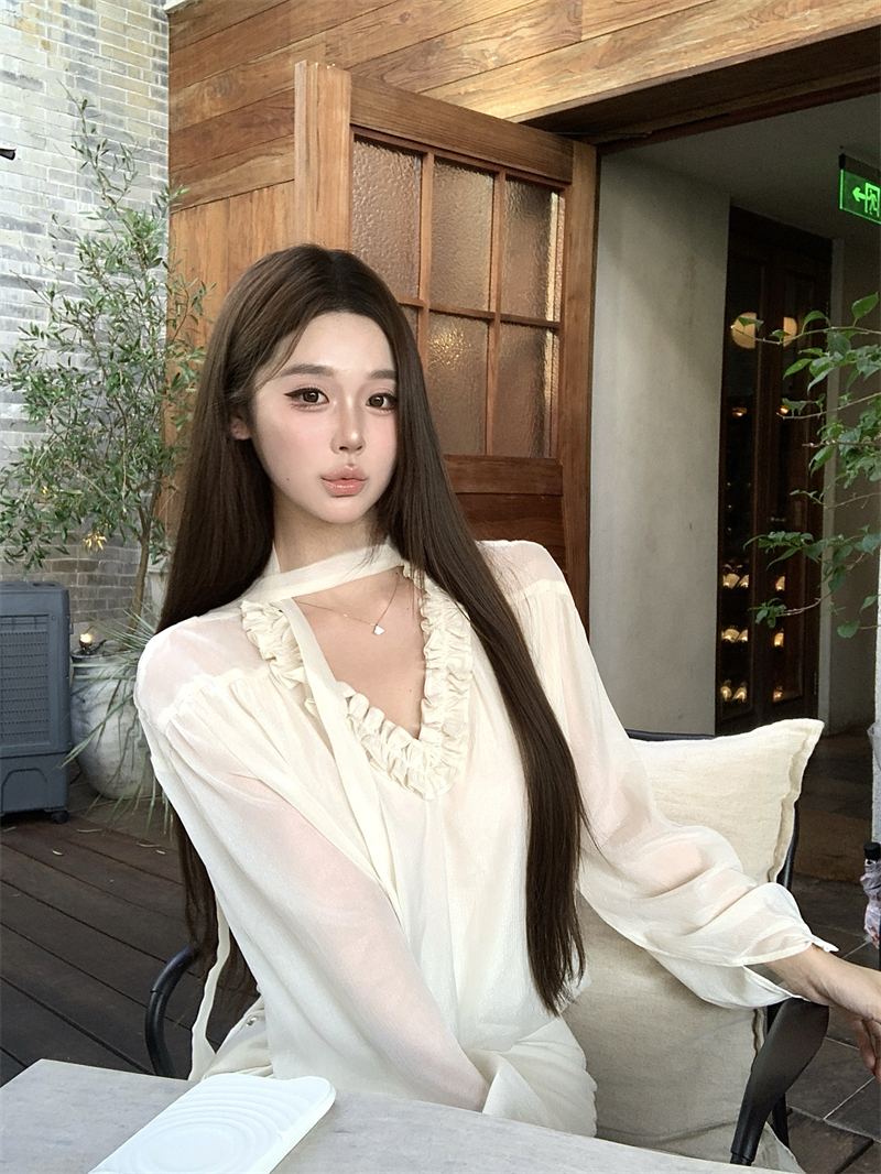 FA40011# 木耳边v领飘带衬衫宽松长袖内搭上衣衬衣女秋 服裝批發女裝批發服飾貨源