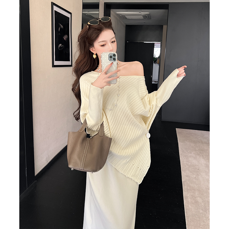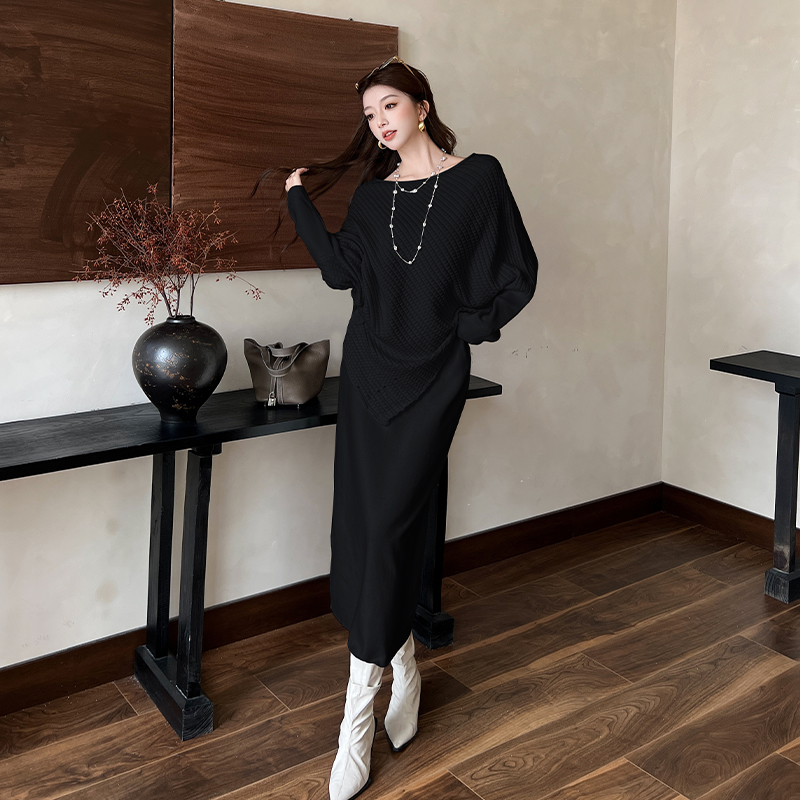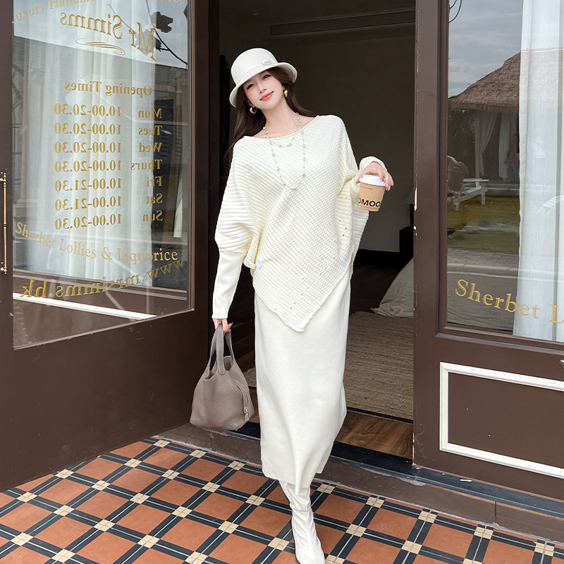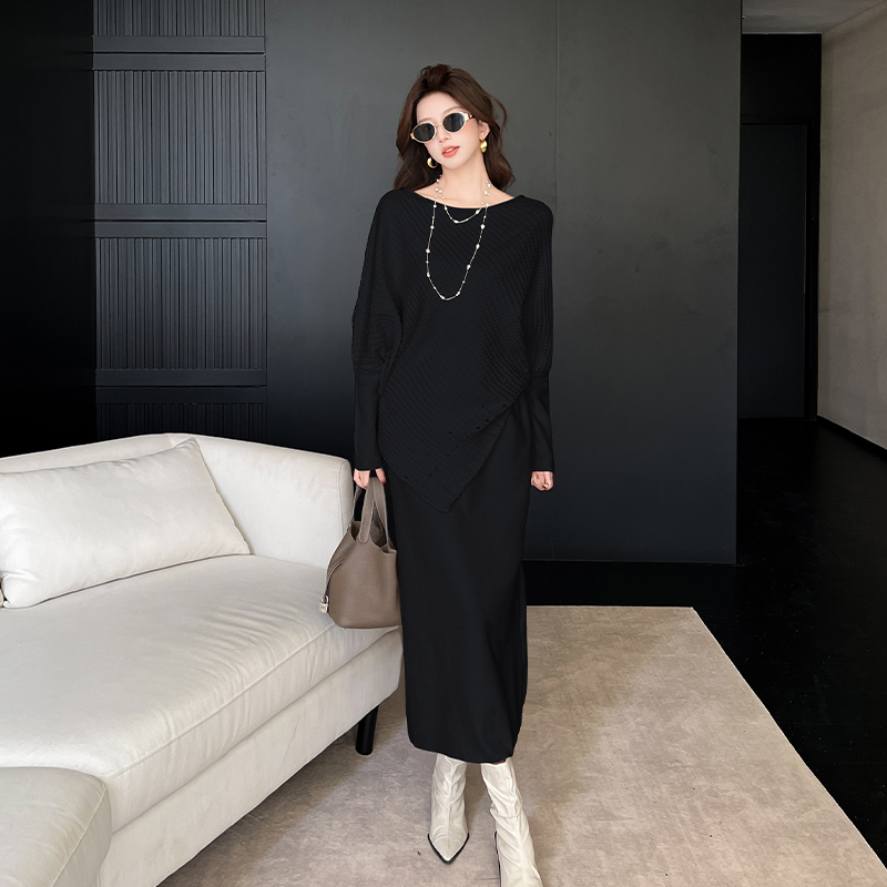 FA46614# 韩系慵懒风不规则宽松显瘦长袖针织衫上衣半身裙时尚毛衣两件套