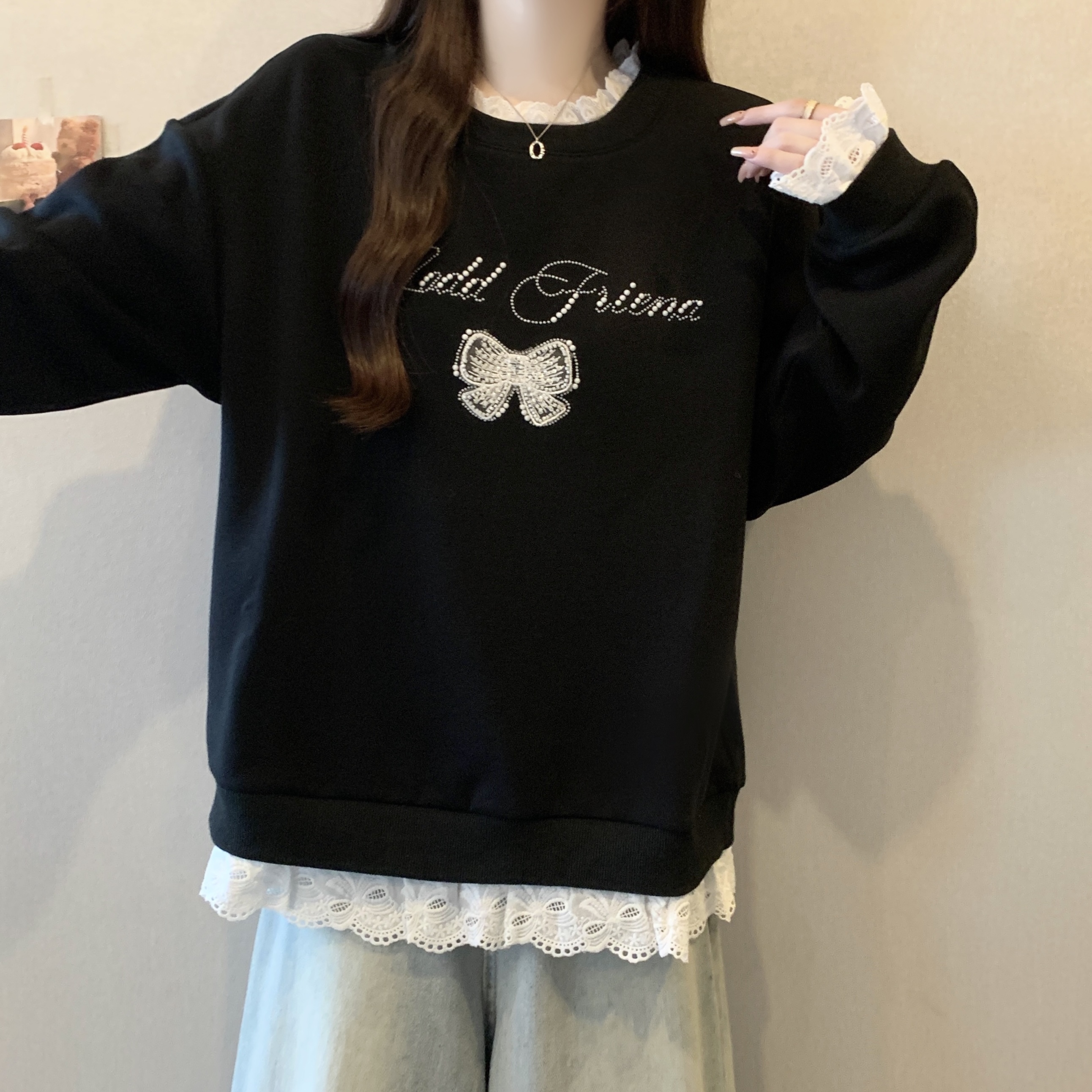 FA47349# 新款大码胖MM秋款设计感拼接蕾丝假两件宽松百搭显瘦卫衣 服裝批發女裝批發服飾貨源