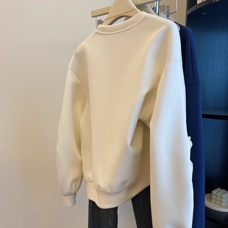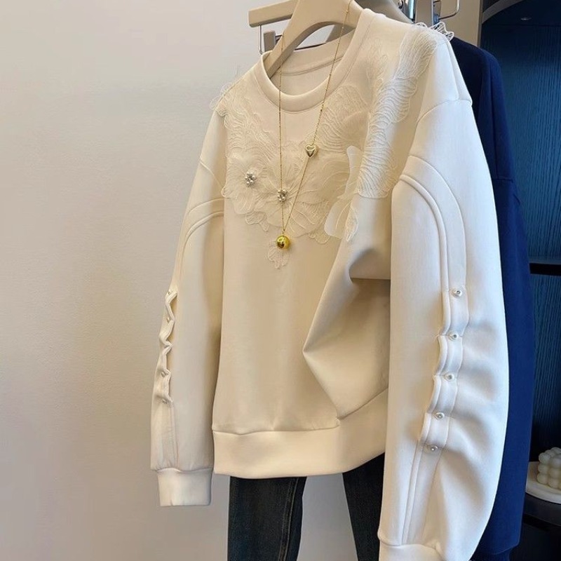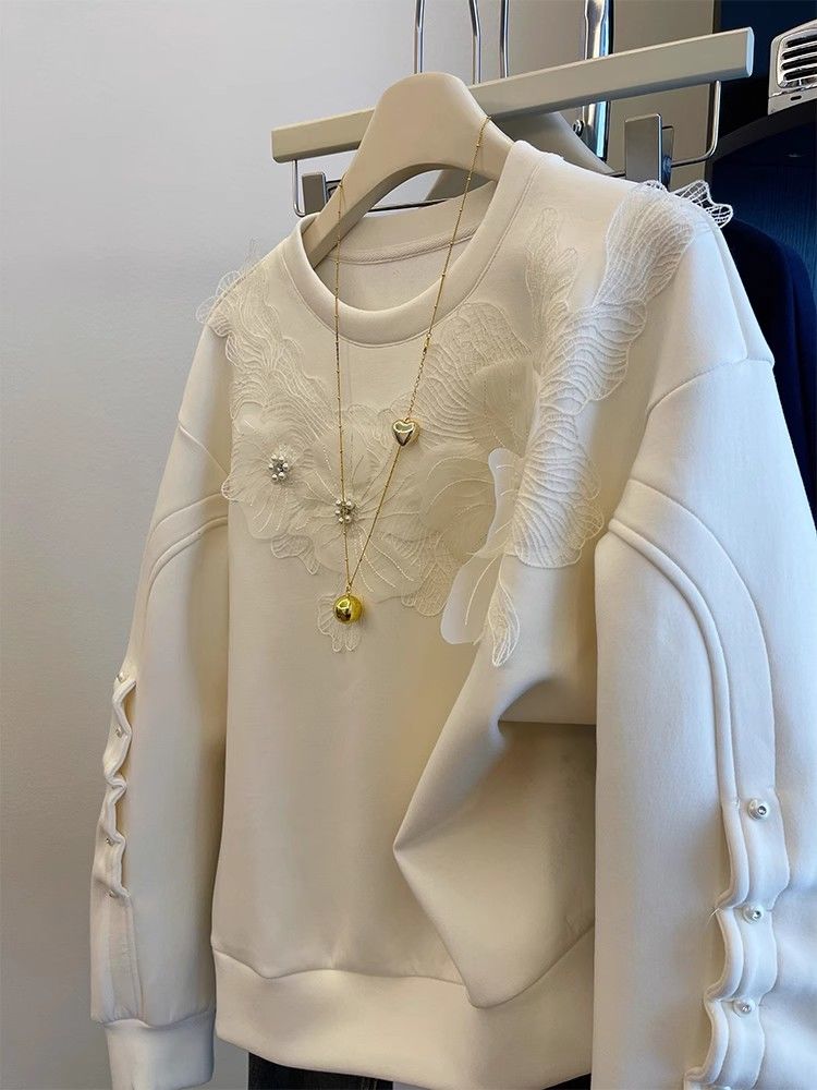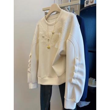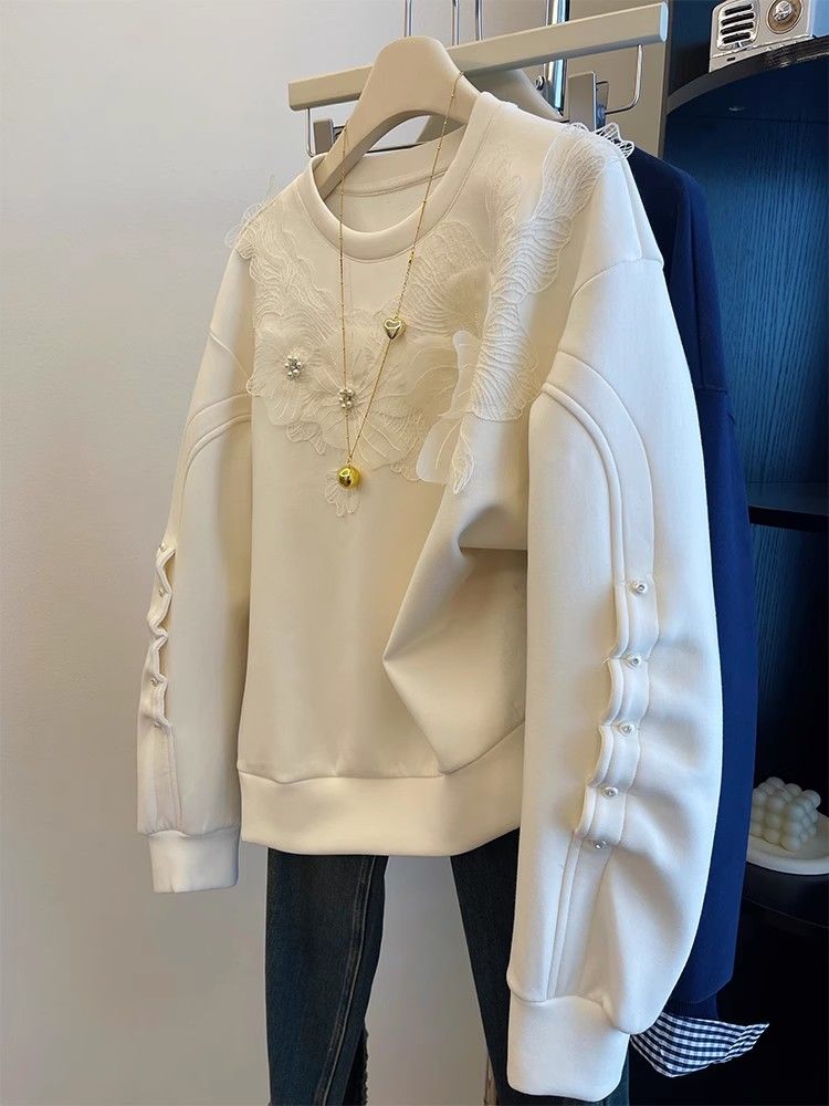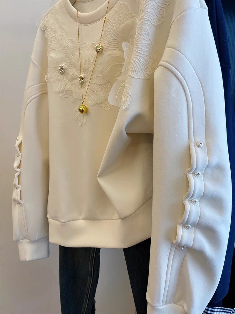 FA47352# 设计感重工珍珠花朵装饰无帽套头卫衣女冬季新款加绒加厚上衣 服裝批發女裝批發服飾貨源