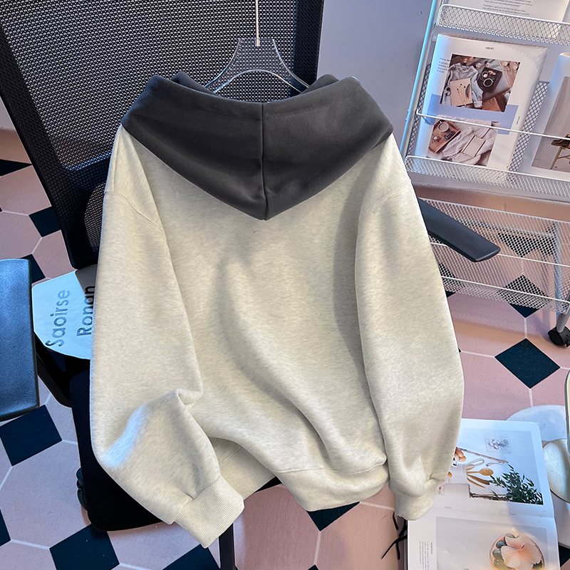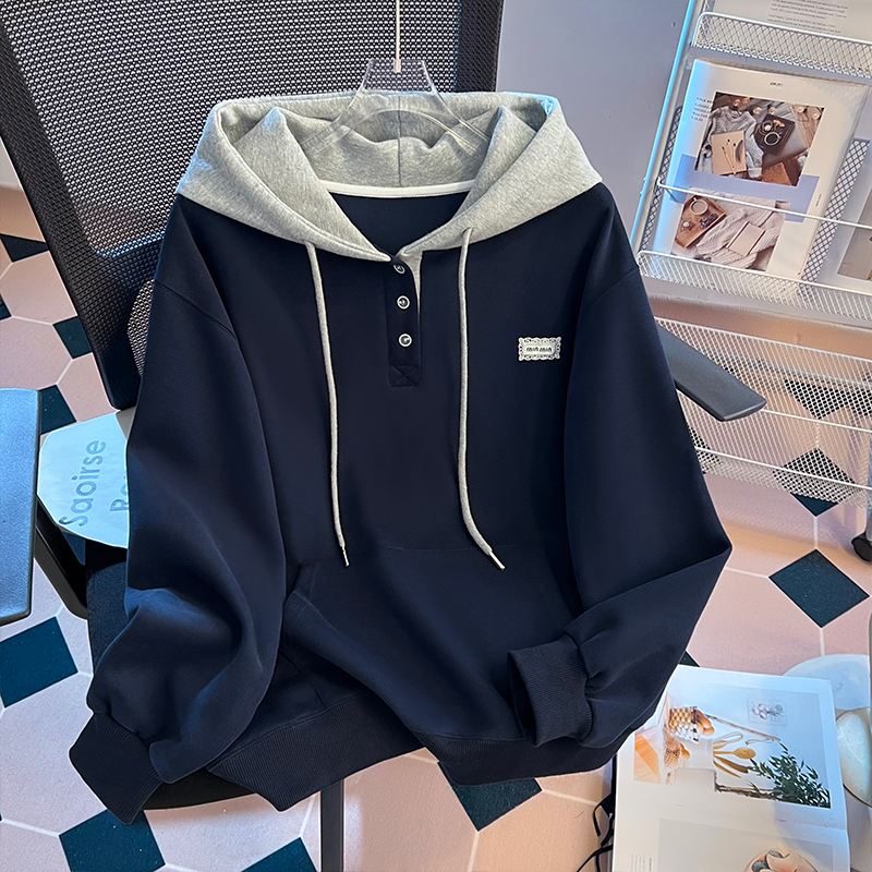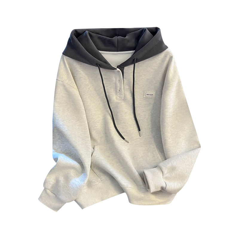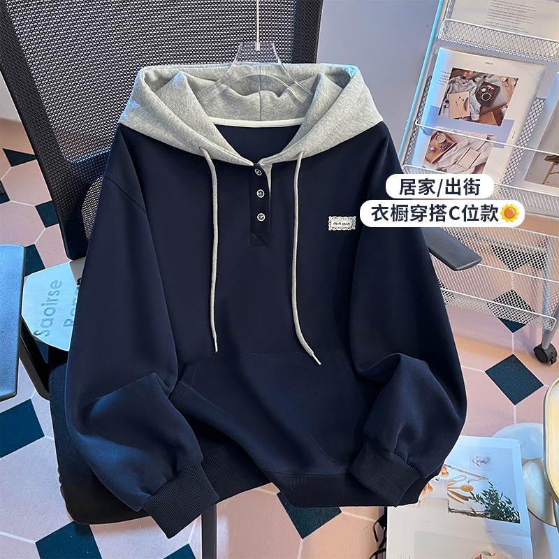 FA47357# 秋冬新款韩版慵懒宽松显瘦单排扣设计感撞色连帽卫衣女 服裝批發女裝批發服飾貨源