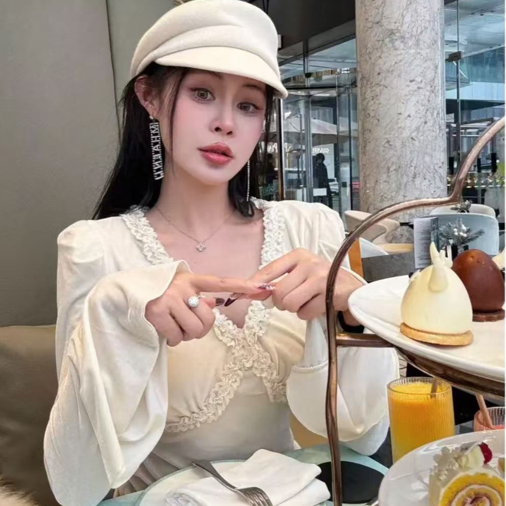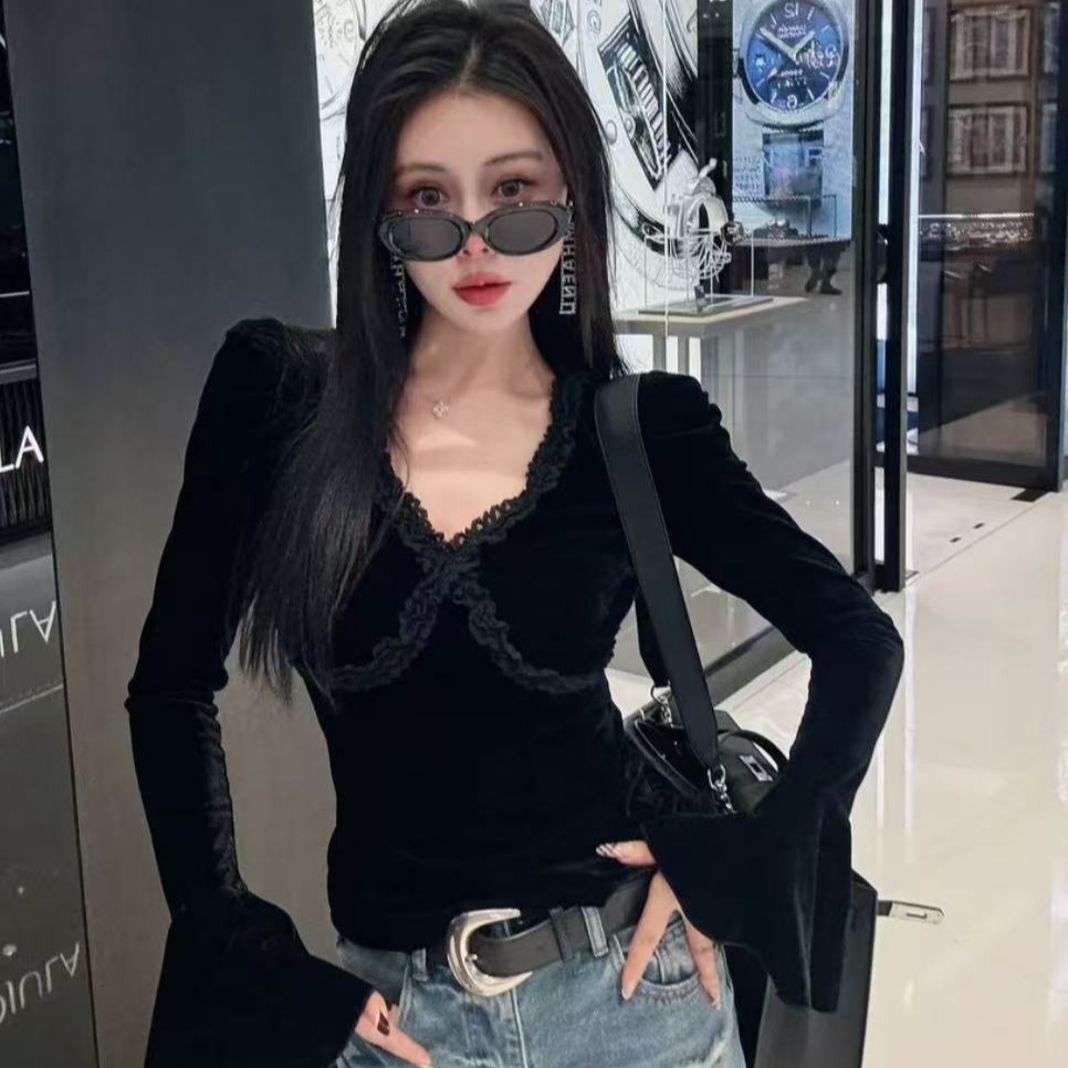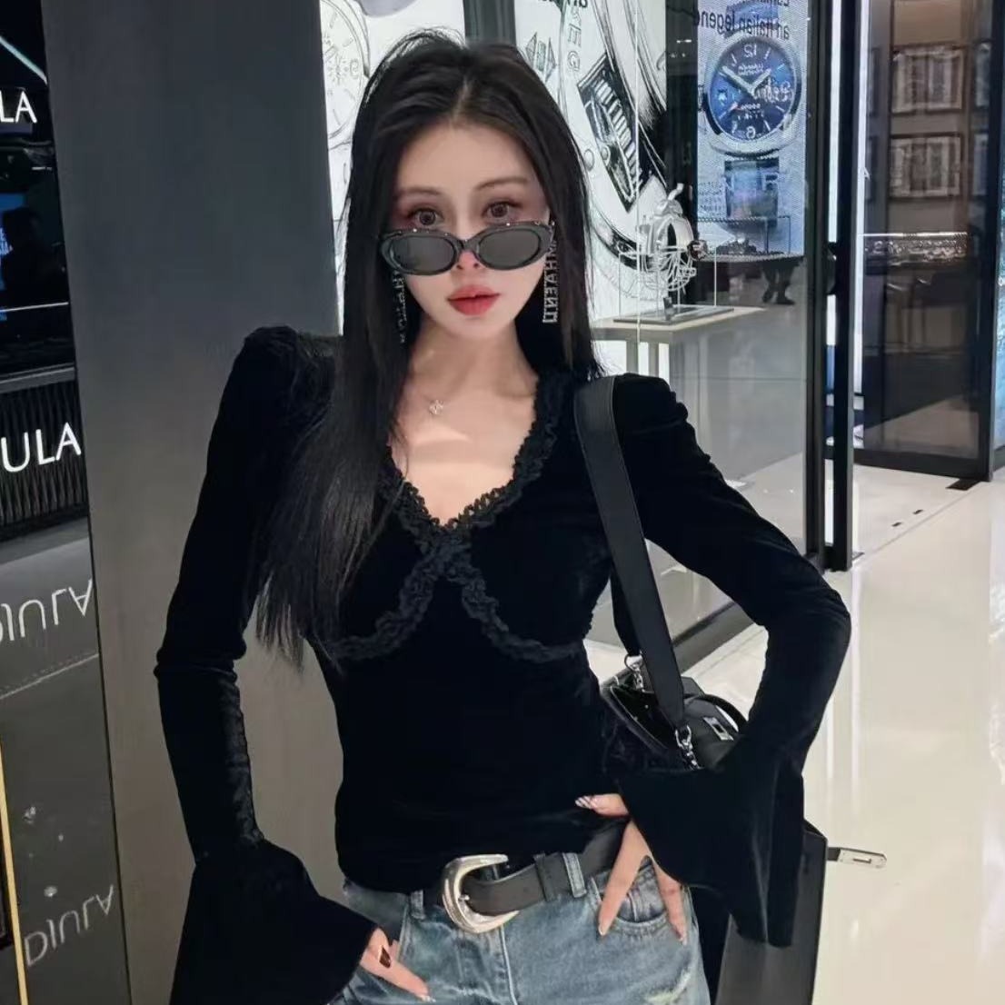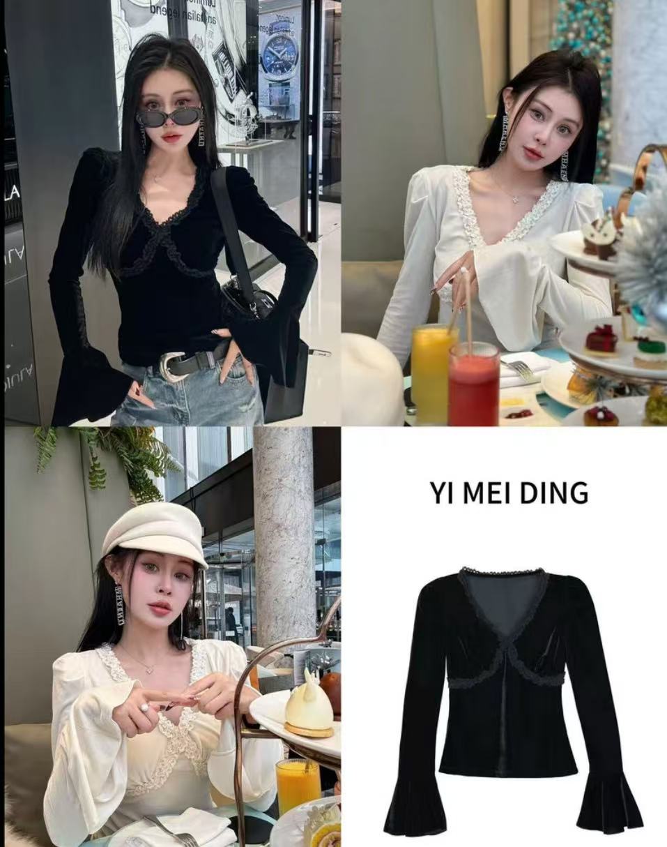 FA47525# 依美丁时尚气质喇叭袖蕾丝花边V领丝绒上衣 服裝批發女裝批發服飾貨源