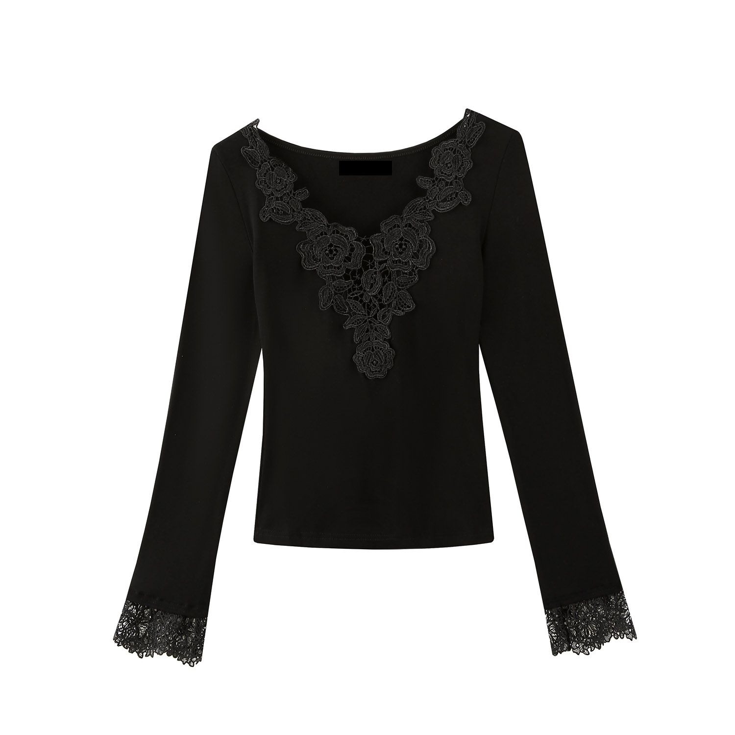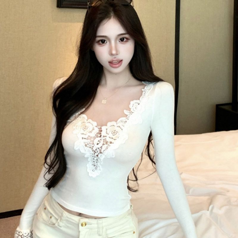 FA47624# 仿棉设计感拼接v领长袖T恤女秋修身内搭纯欲风打底上衣 服裝批發女裝批發服飾貨源
