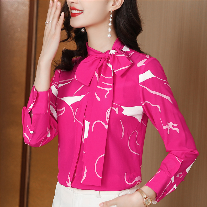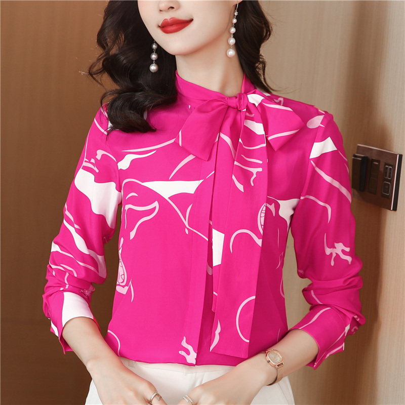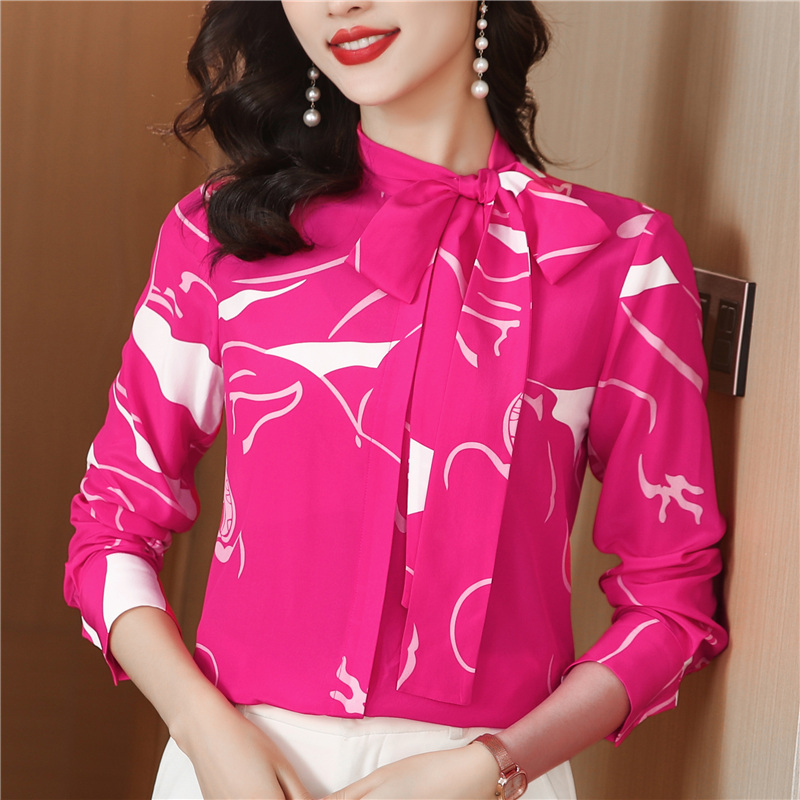 FA47654# 优雅柜单谁穿谁美气质侧边系带蝴蝶结印花双绉真丝衬衫女长袖 服裝批發女裝批發服飾貨源