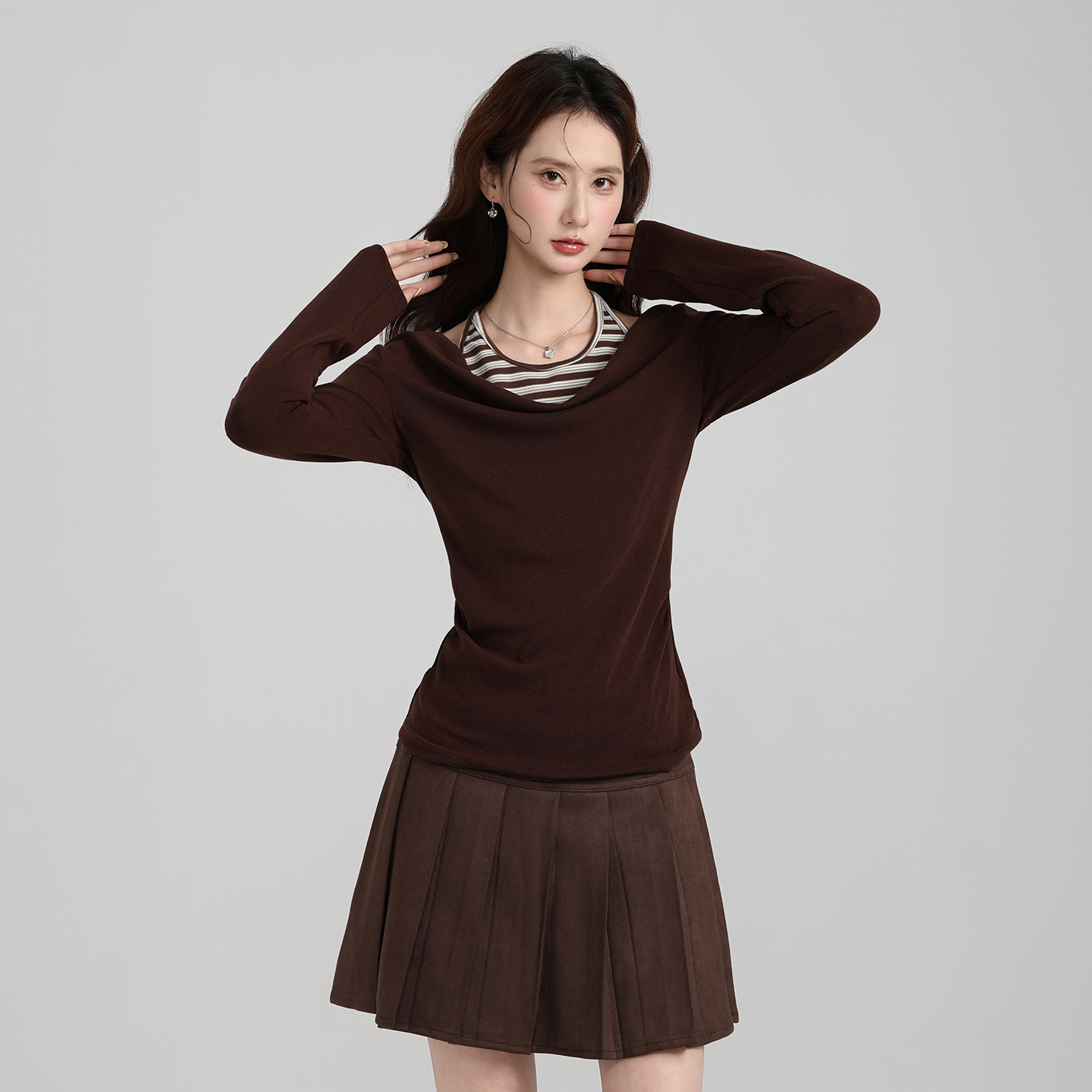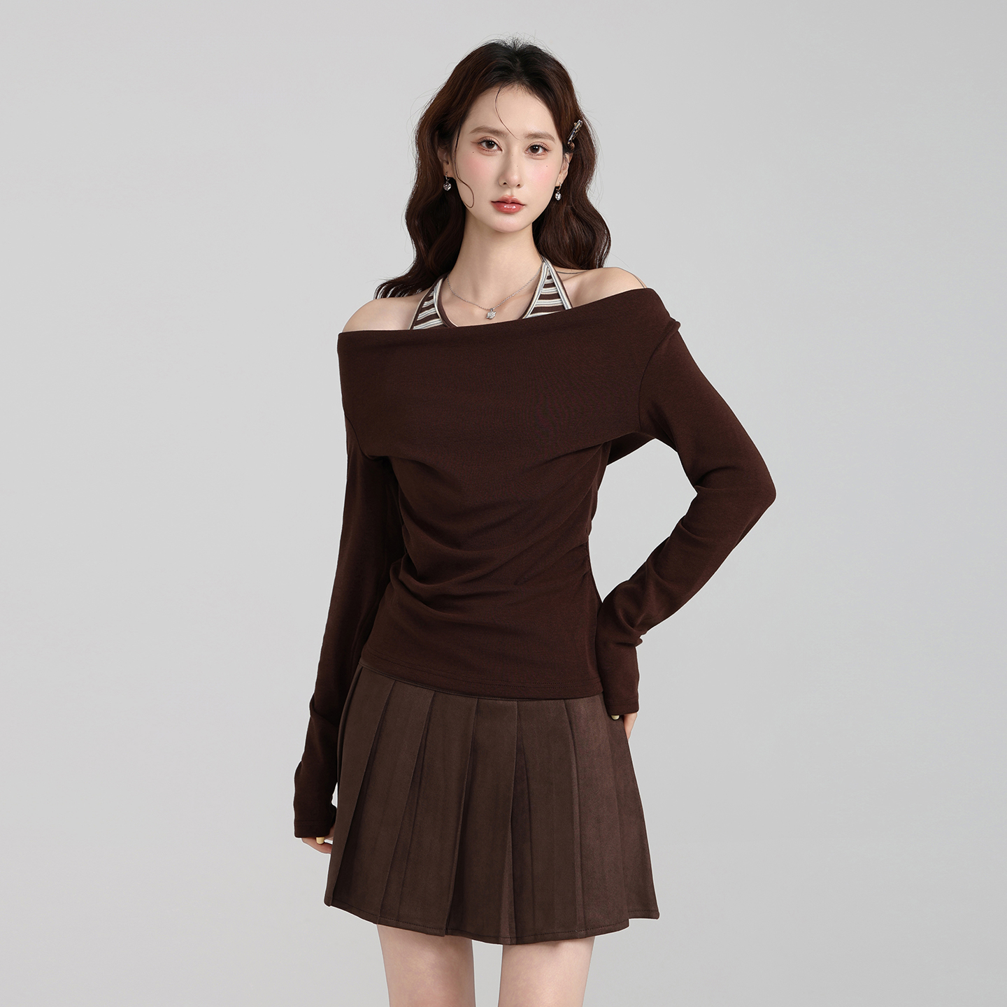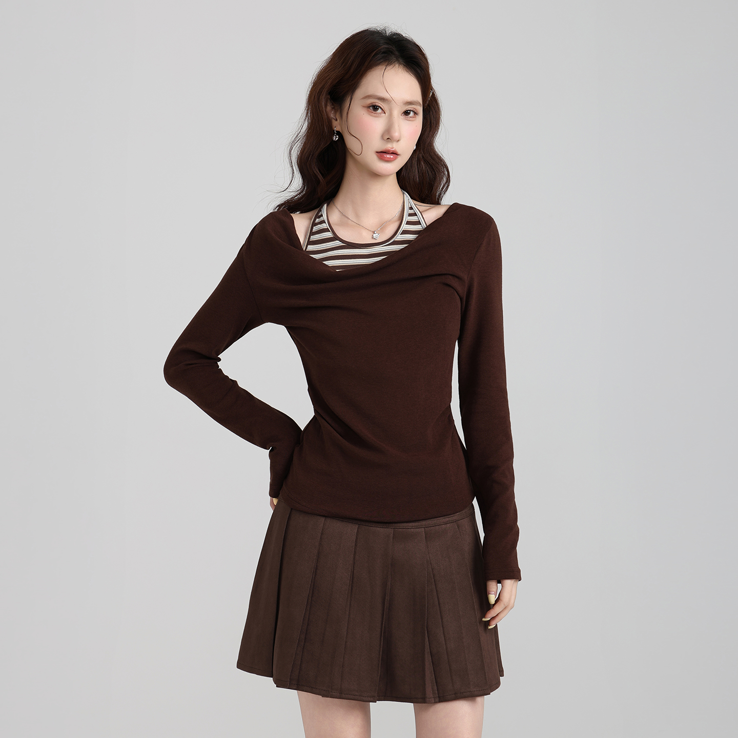 FA47660# 韩系荡领挂脖吊带假两件长袖T恤女秋季显瘦打底内搭上衣 服裝批發女裝批發服飾貨源