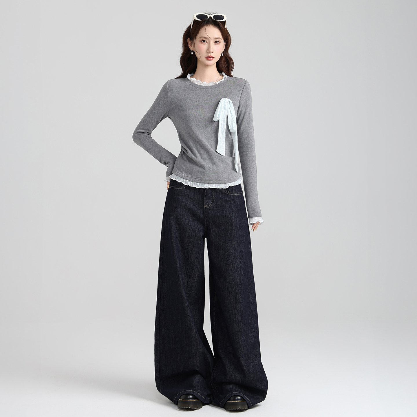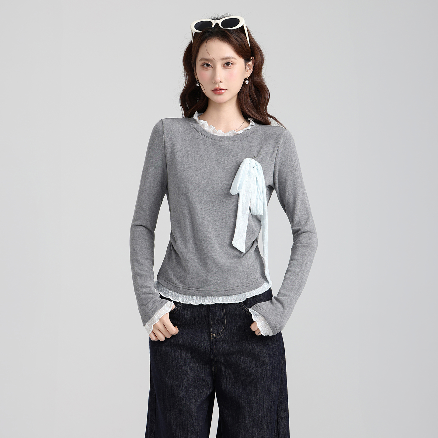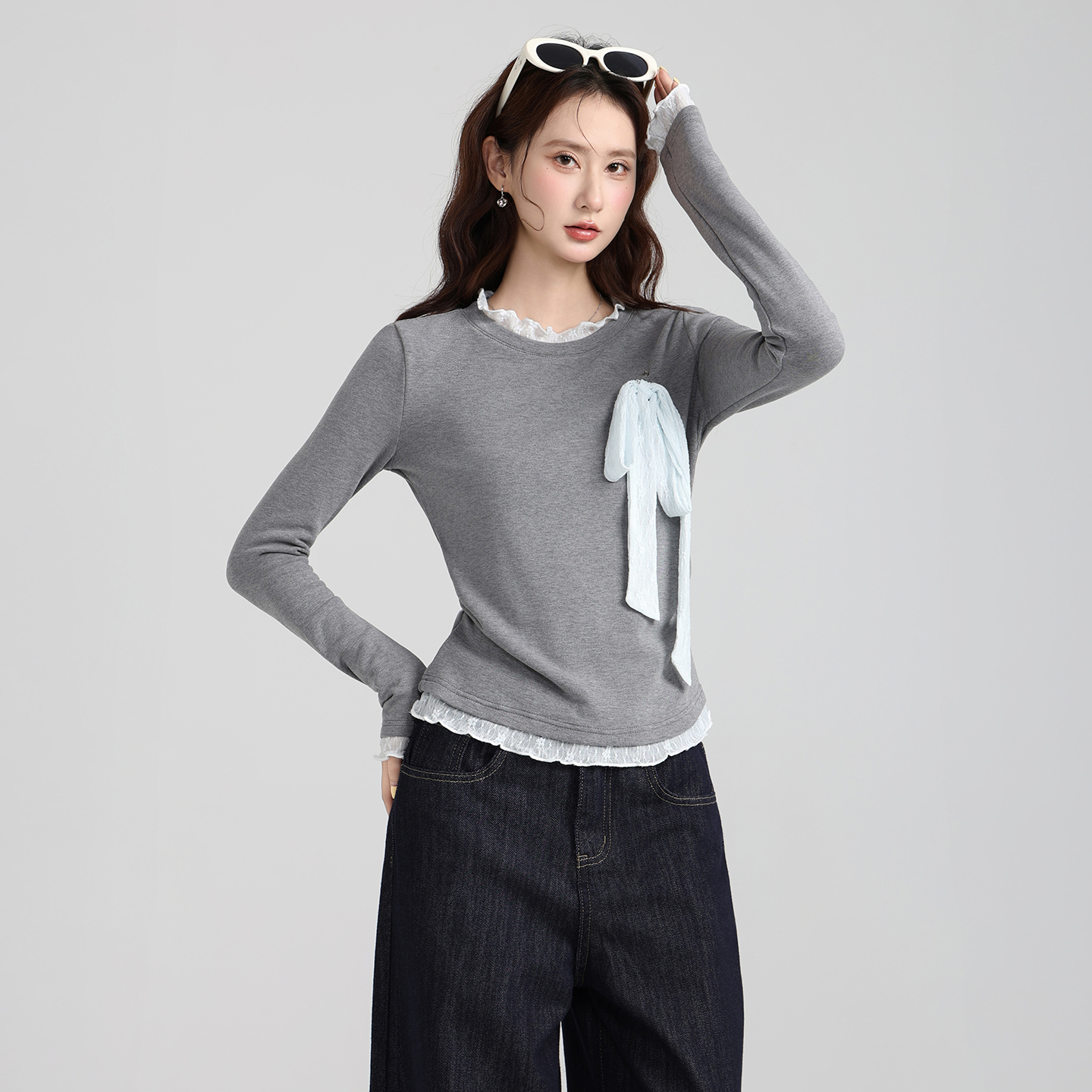 FA47662# 假两件拼接蕾丝蝴蝶结绑带褶皱长袖打底衫秋冬修身上衣女 服裝批發女裝批發服飾貨源