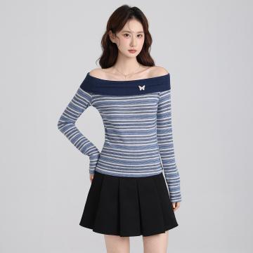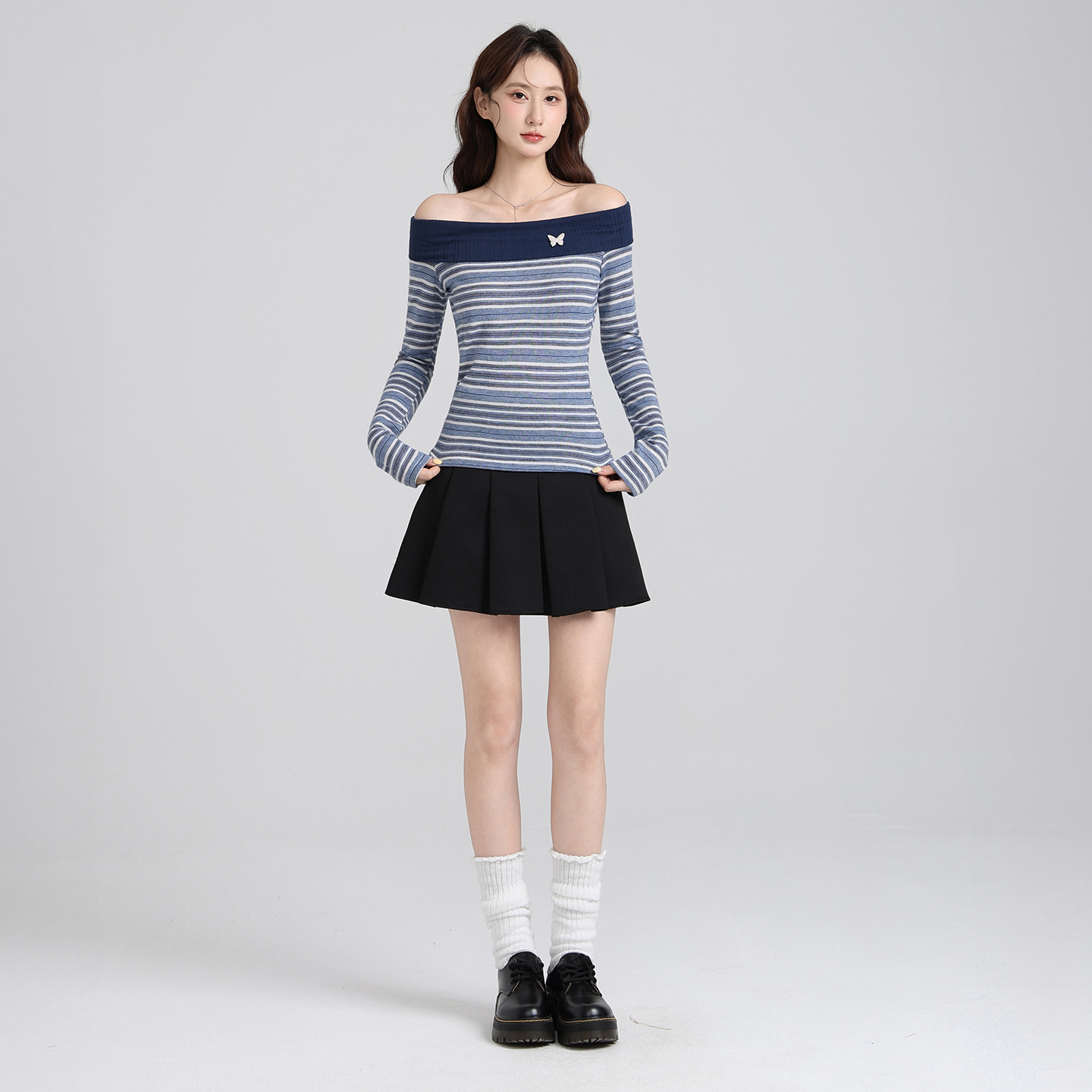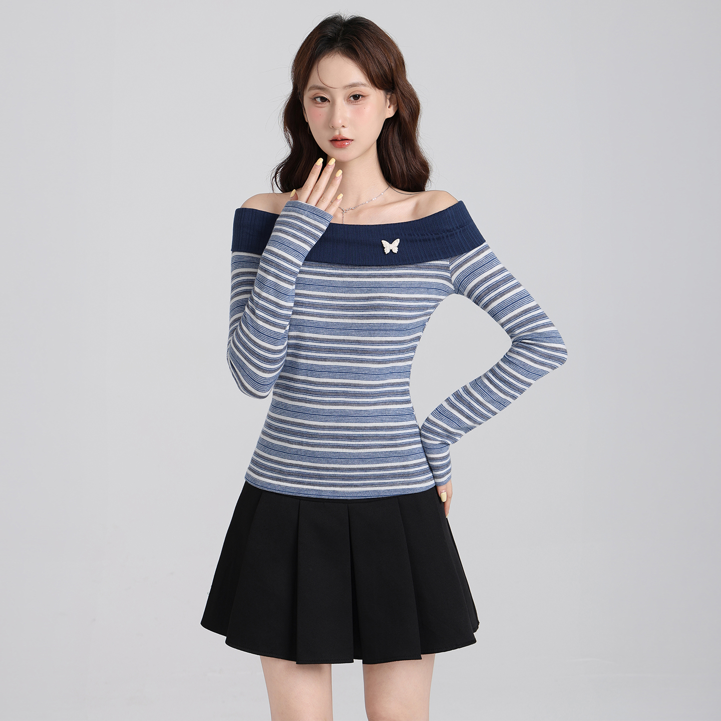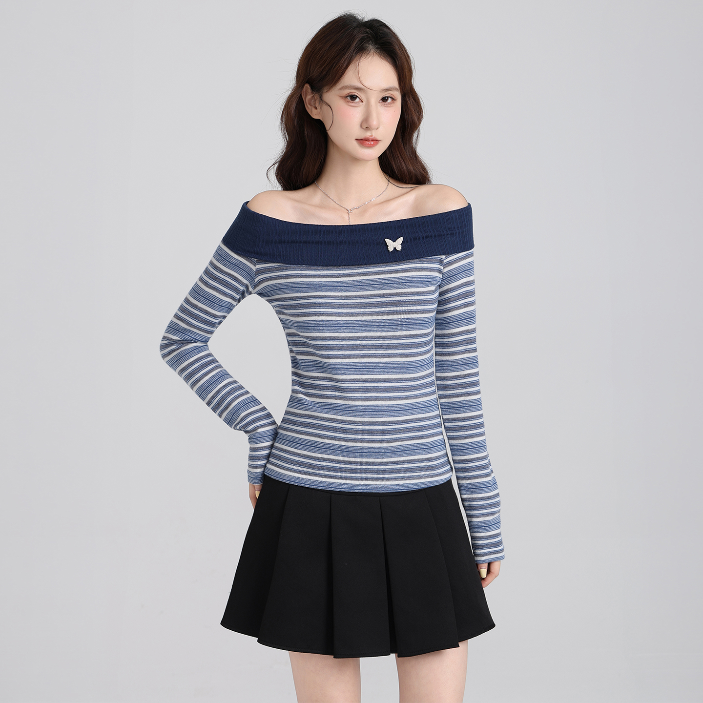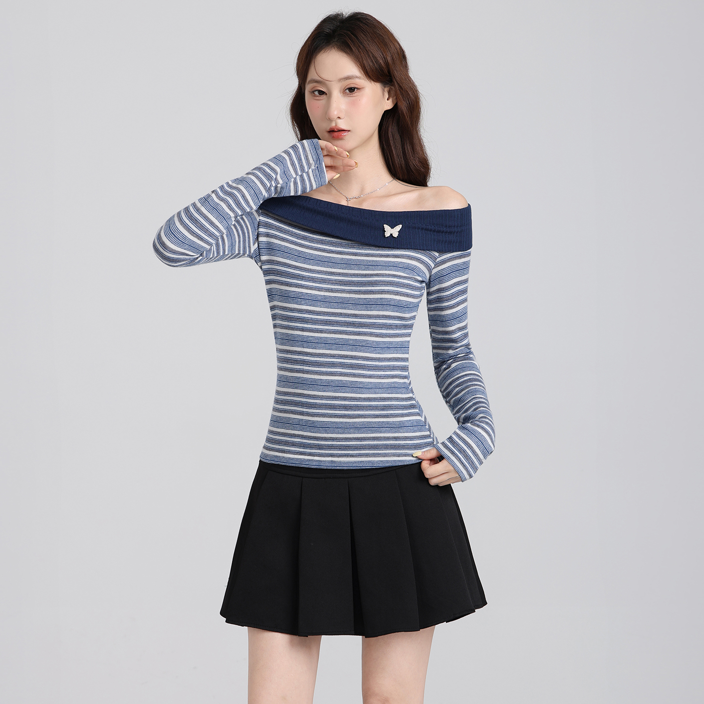FA47665# 美式设计感一字肩条纹T恤女秋别致小衫修身显瘦长袖上衣 服裝批發女裝批發服飾貨源
