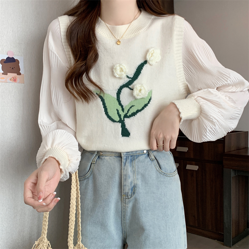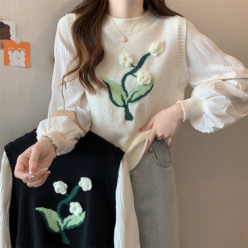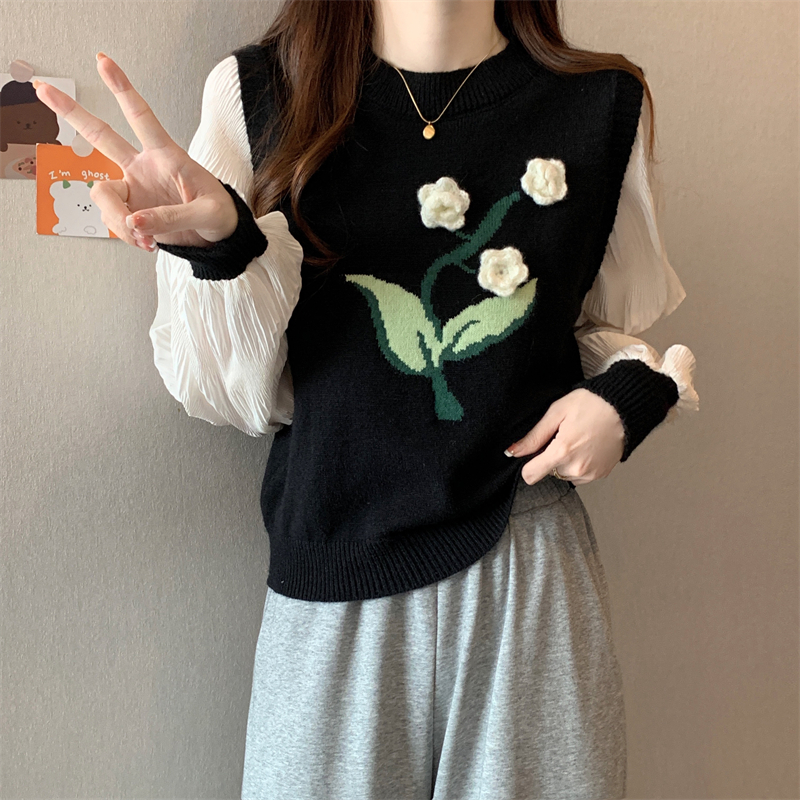 FA47807# ~大码假两件针织衫女甜美立体花朵设计感拼接别致长袖上衣 服裝批發女裝批發服飾貨源