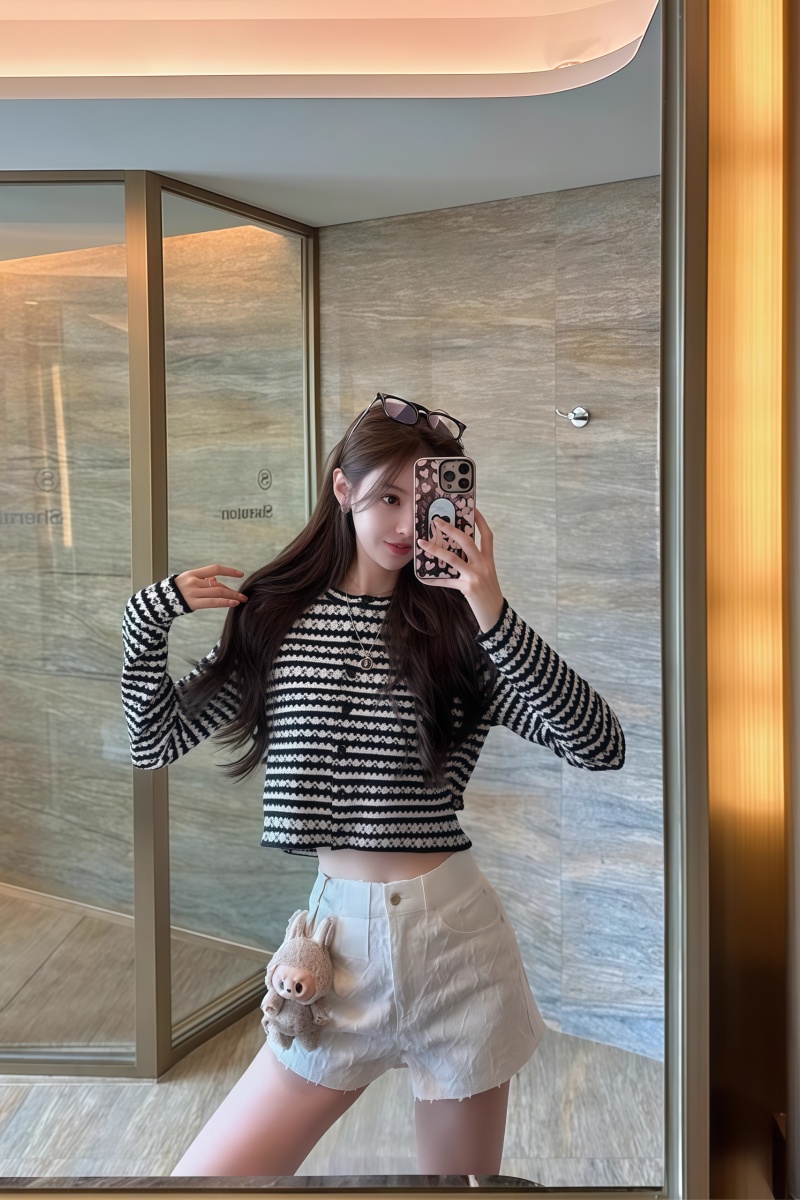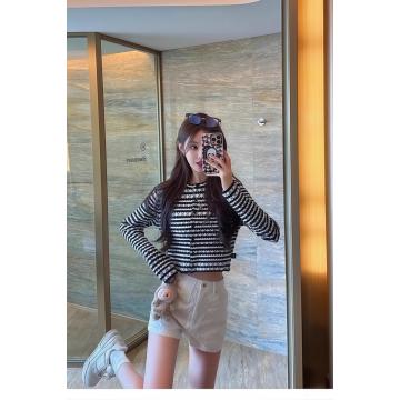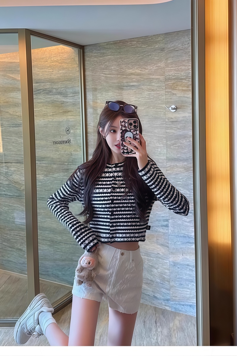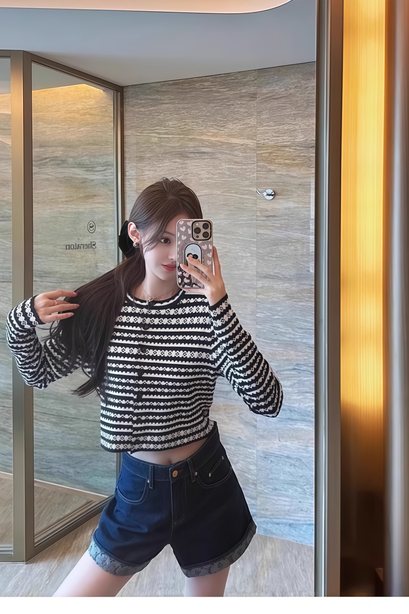 FA47830# 法式条纹圆领针织开衫女早秋新款设计感小众气质短款外套上衣 服裝批發女裝批發服飾貨源