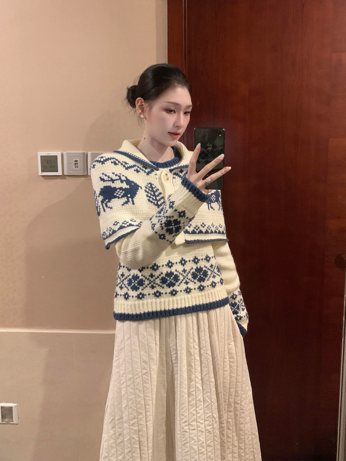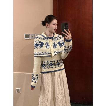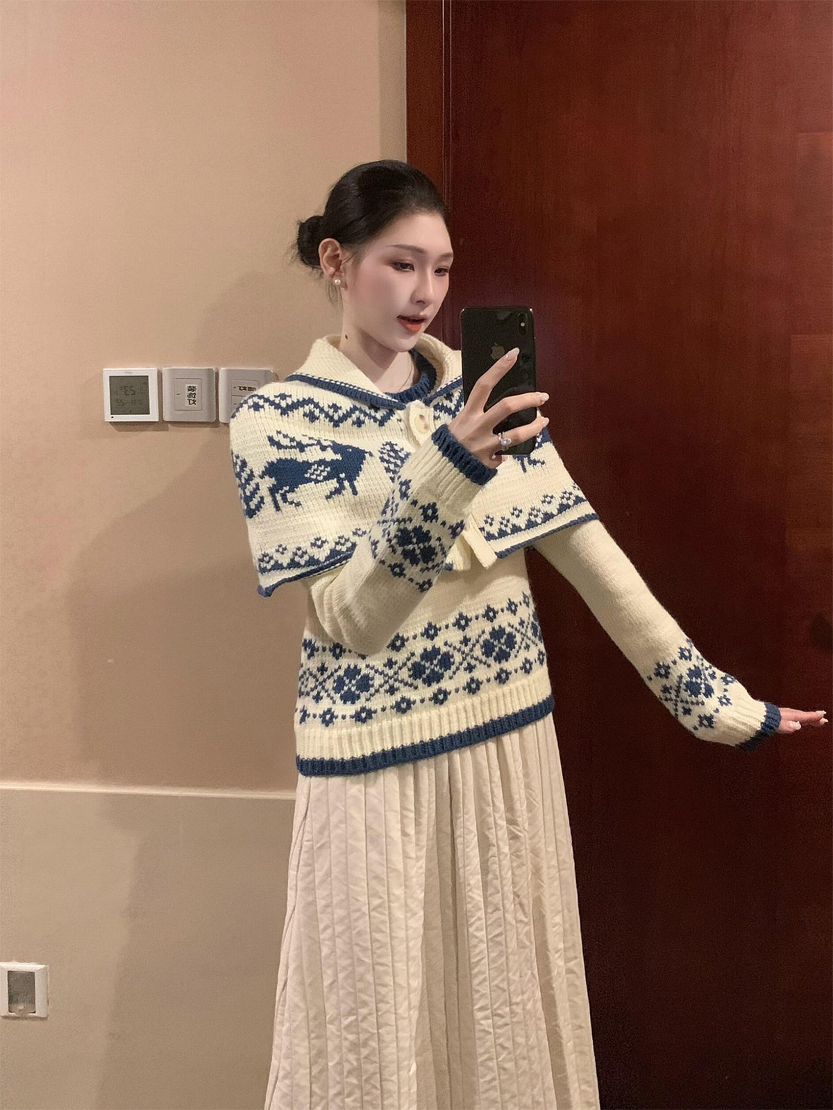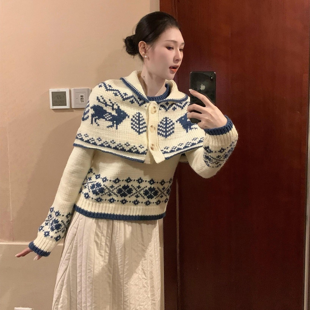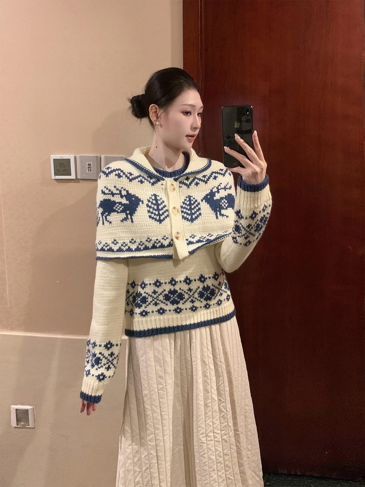 FA47838# 韩系复古米白色提花费尔岛毛衣外套冬季氛围感短款斗篷针织上衣女 服裝批發女裝批發服飾貨源