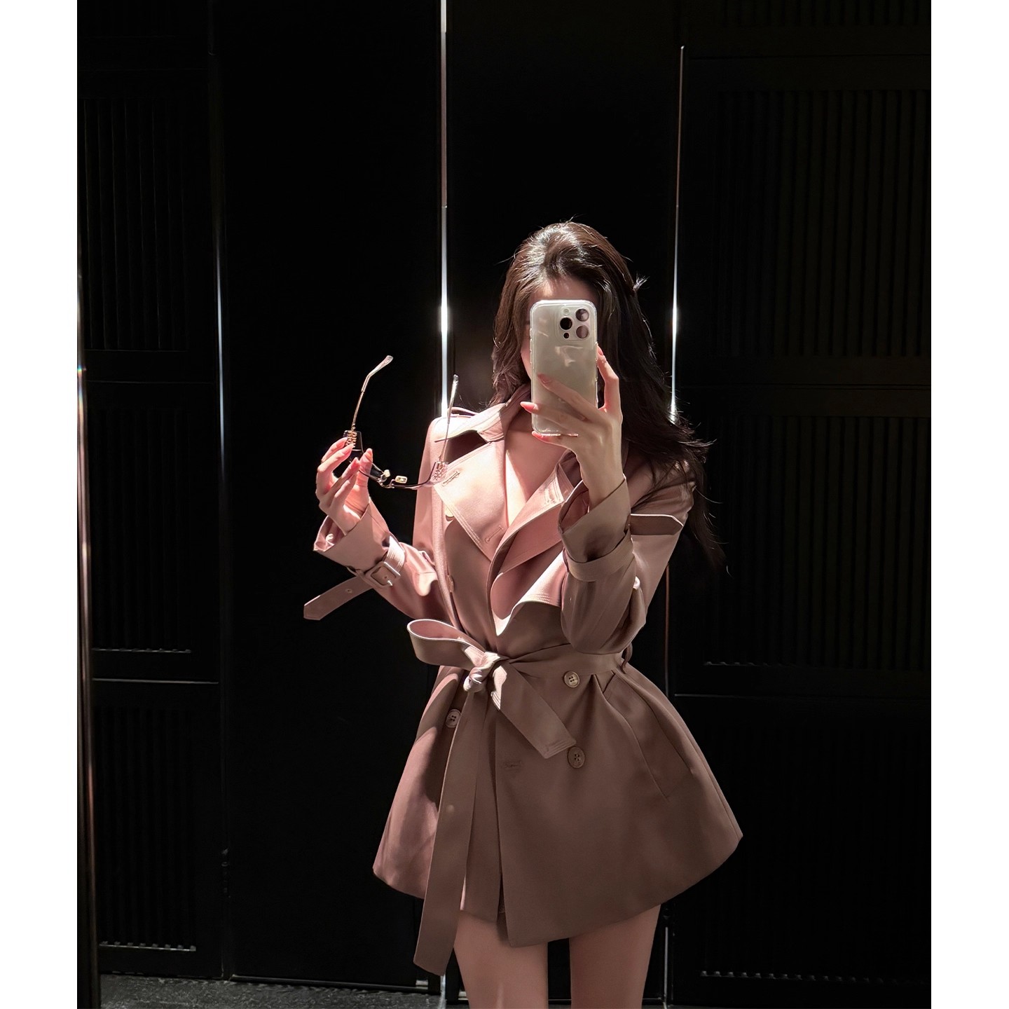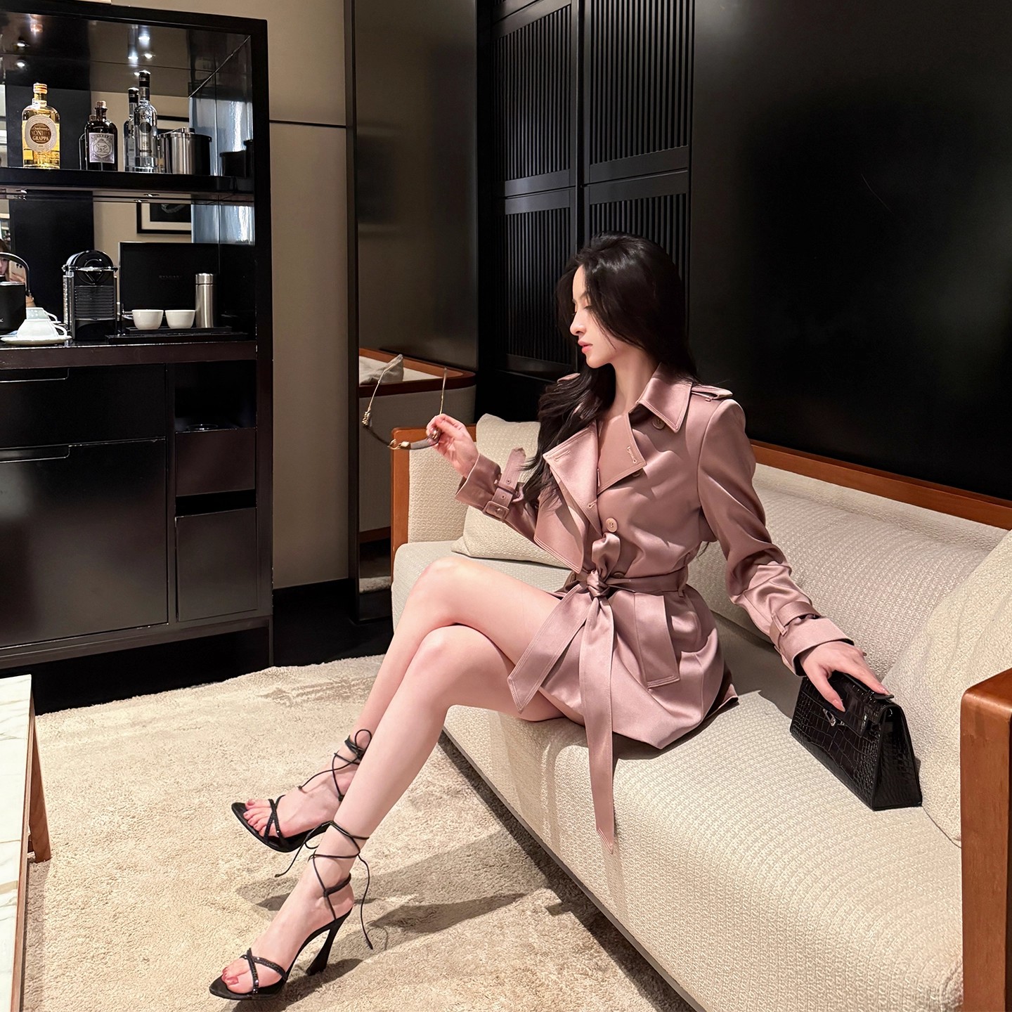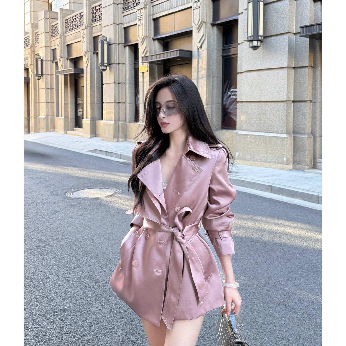FA47924# 豆沙玫瑰高质感缎面大翻领双排扣系带收腰中长款风衣外套 服裝批發女裝批發服飾貨源