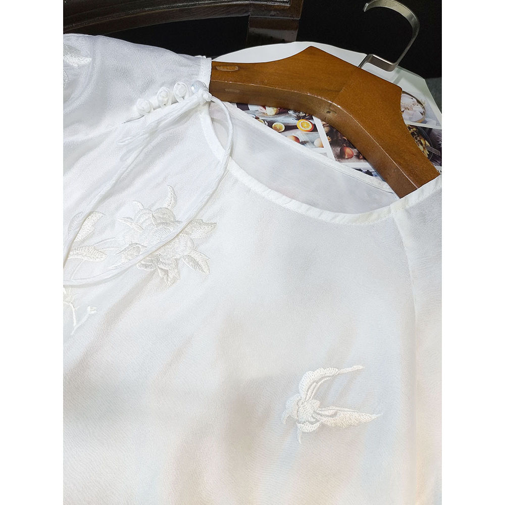 LN76378# 白色中式圆领绣花衬衫女秋季新款时髦百搭休闲国风上衣潮