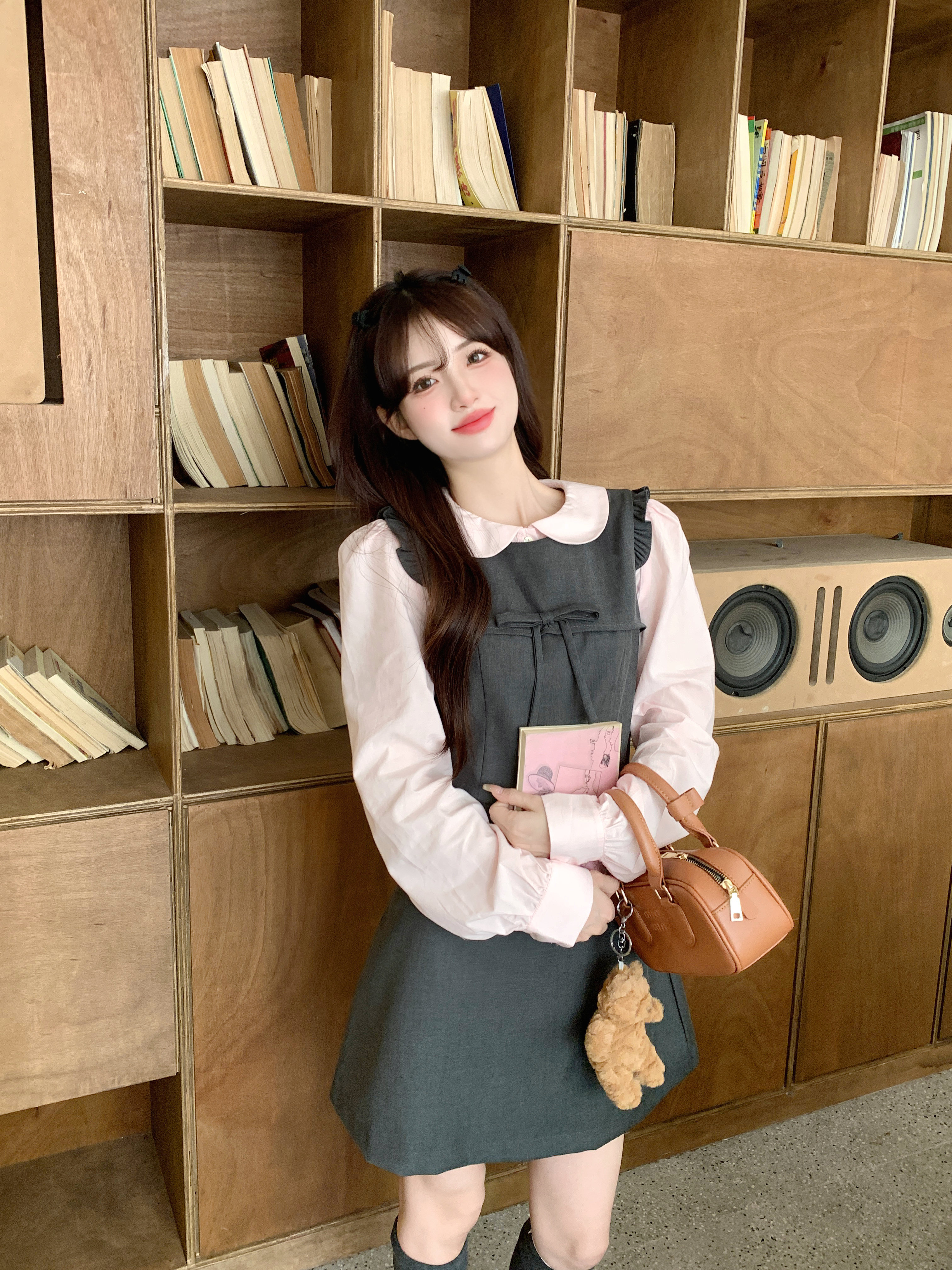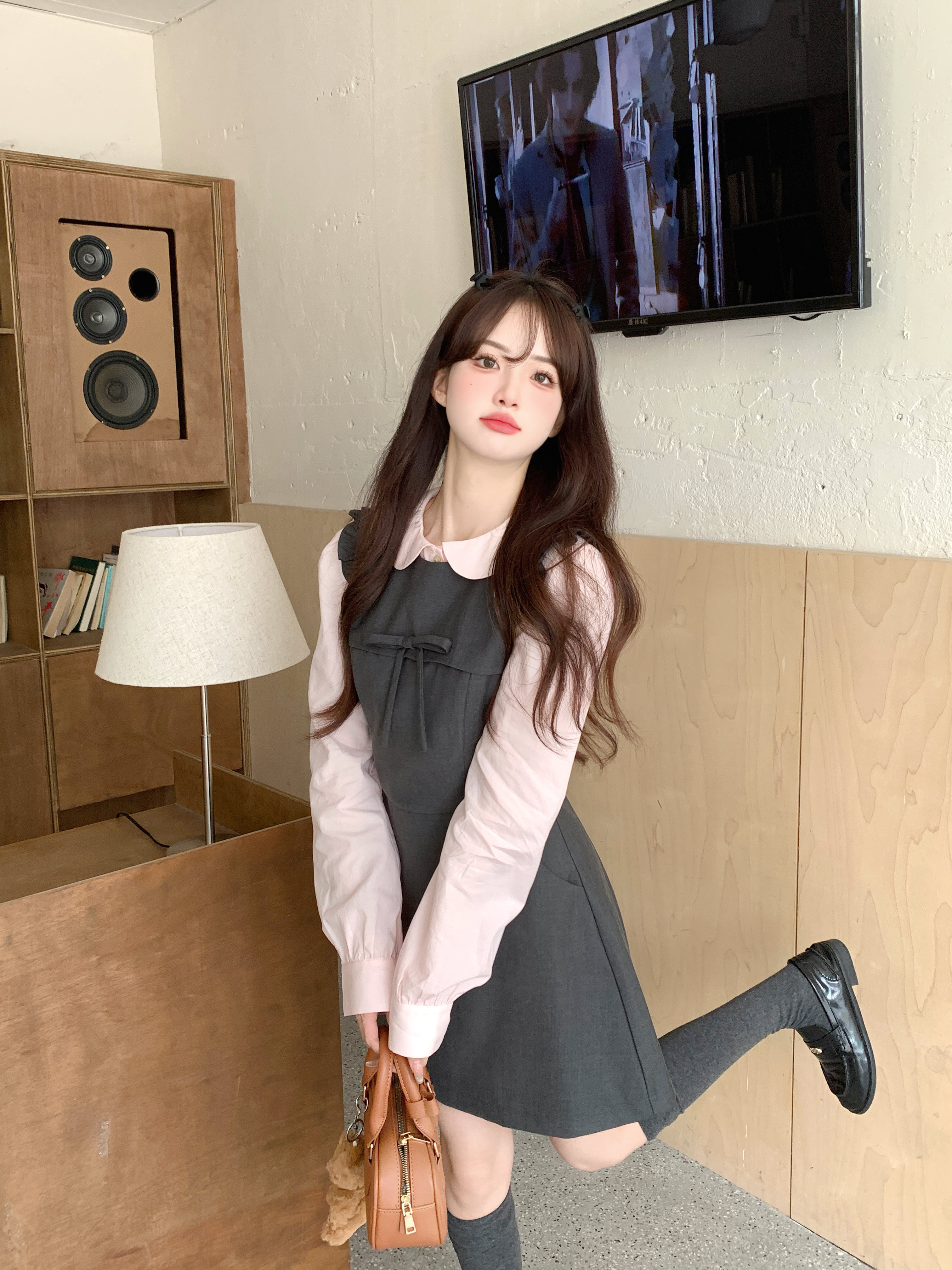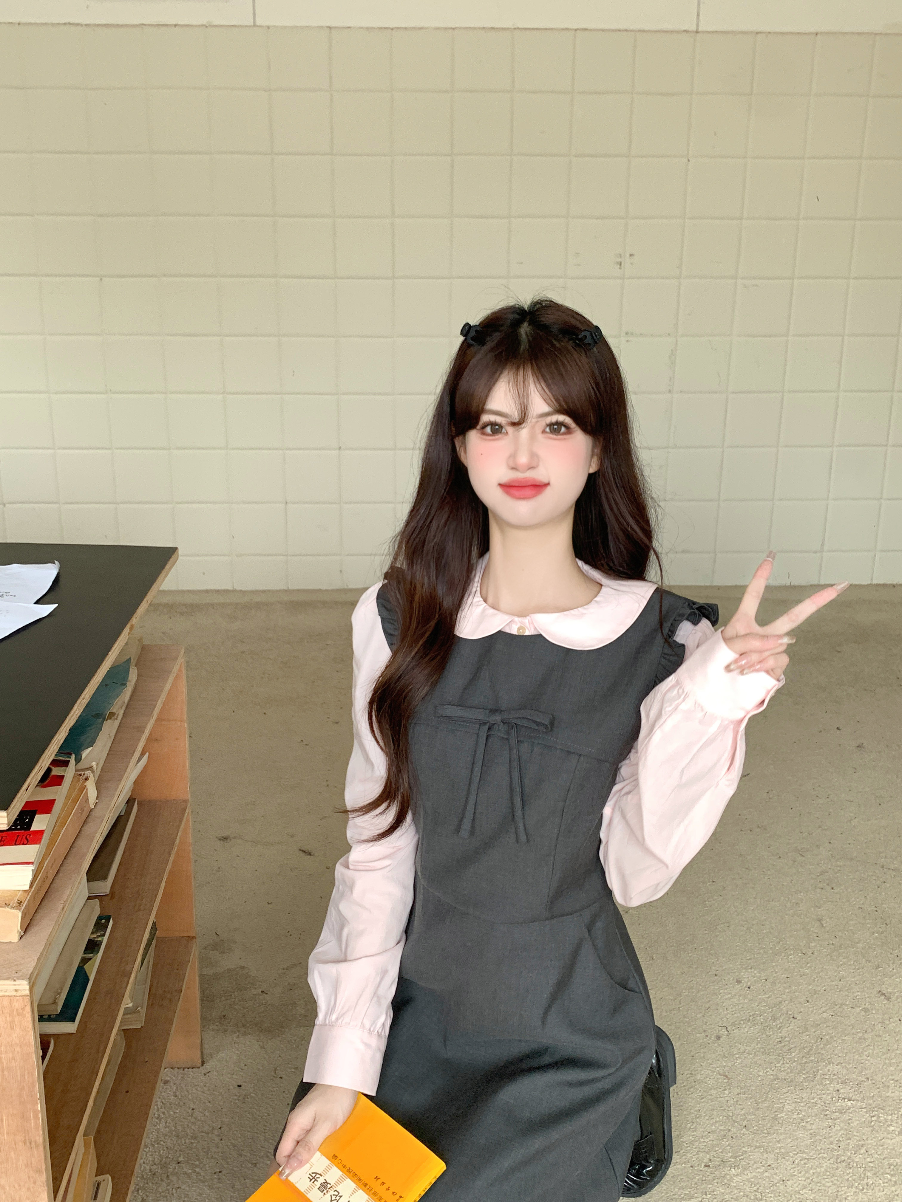 FA48351# 秋季大码连衣裙秋甜美可爱套头假两件修身娃娃领拼色A字裙 服裝批發女裝批發服飾貨源