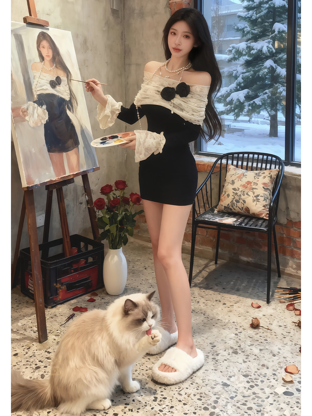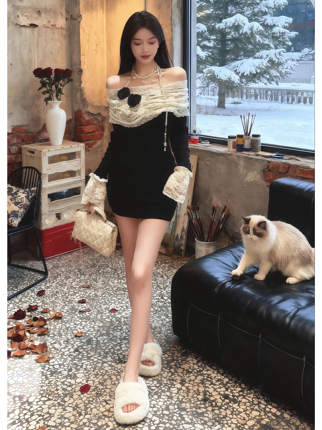 FA48440# 千金穿搭巨好看一字肩气质连衣裙特别漂亮掐腰小裙子秋 服裝批發女裝批發服飾貨源