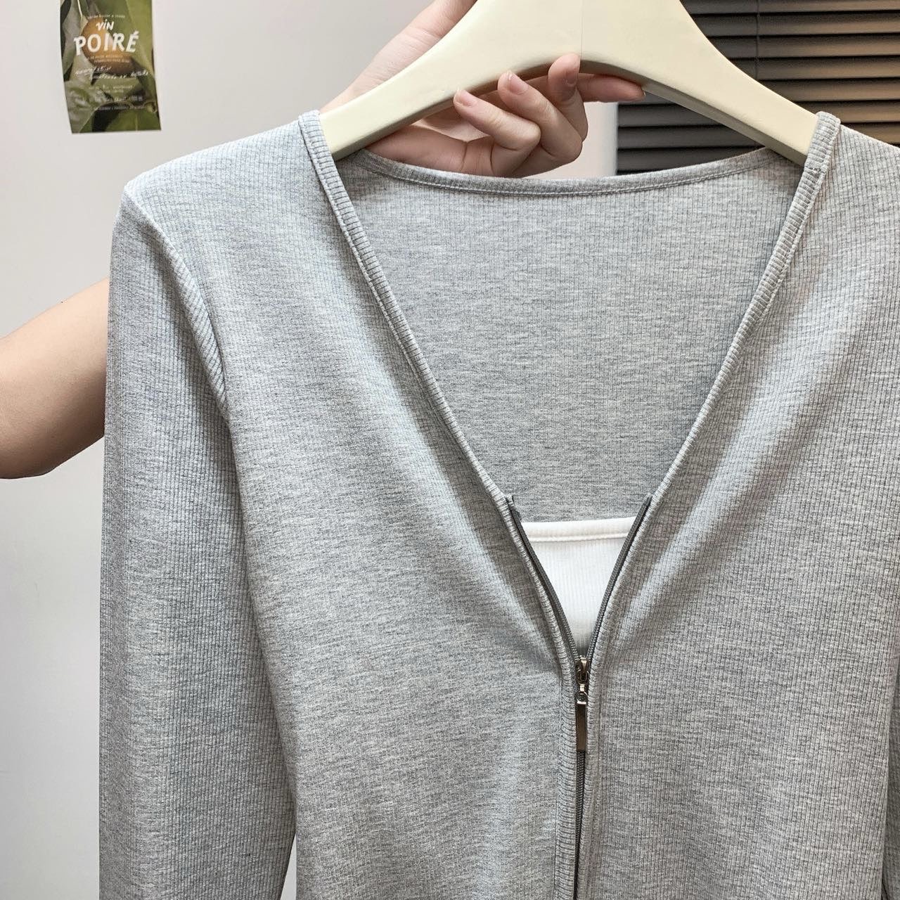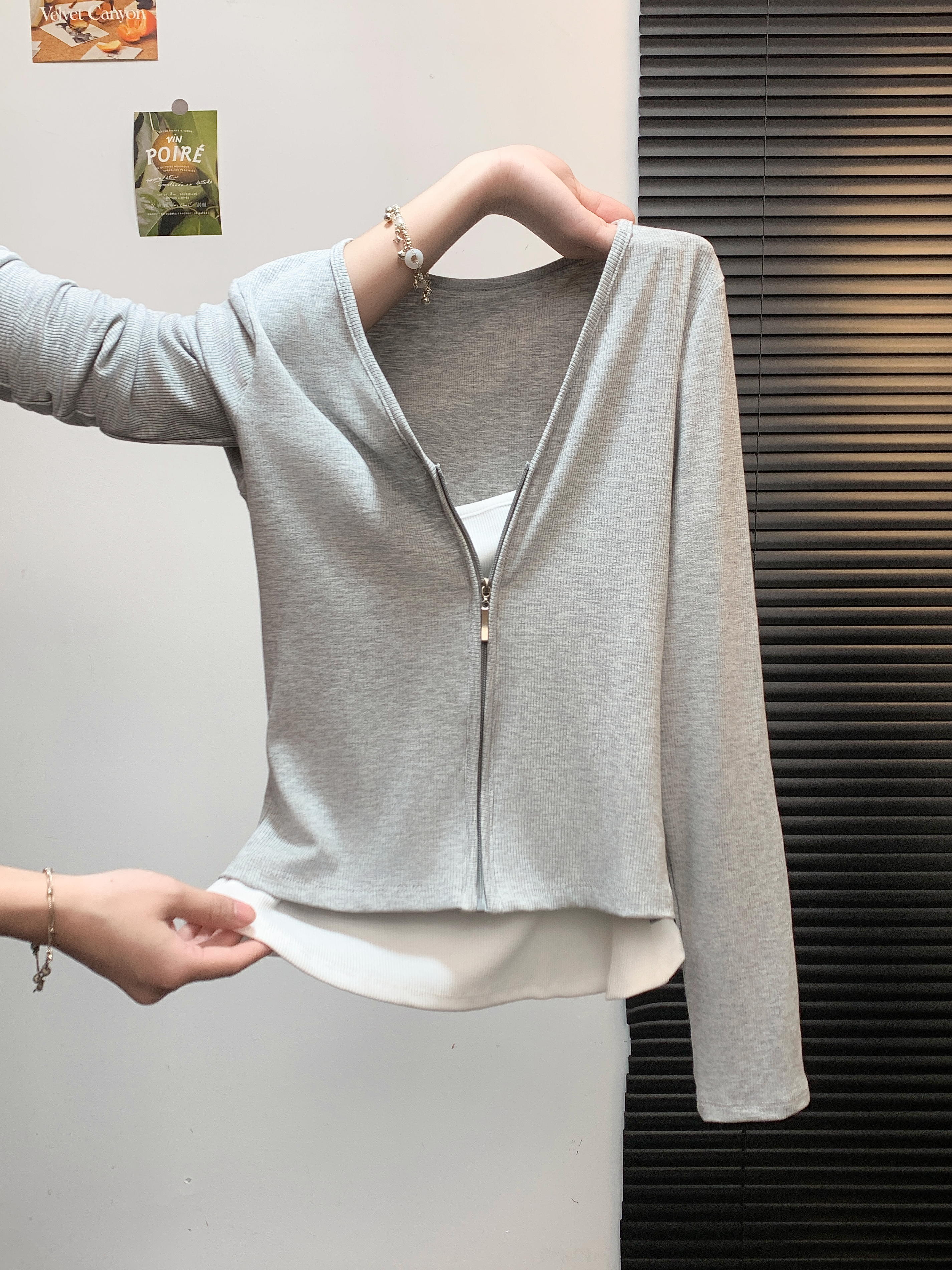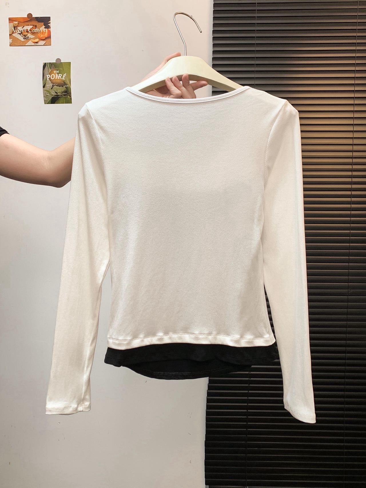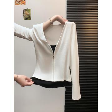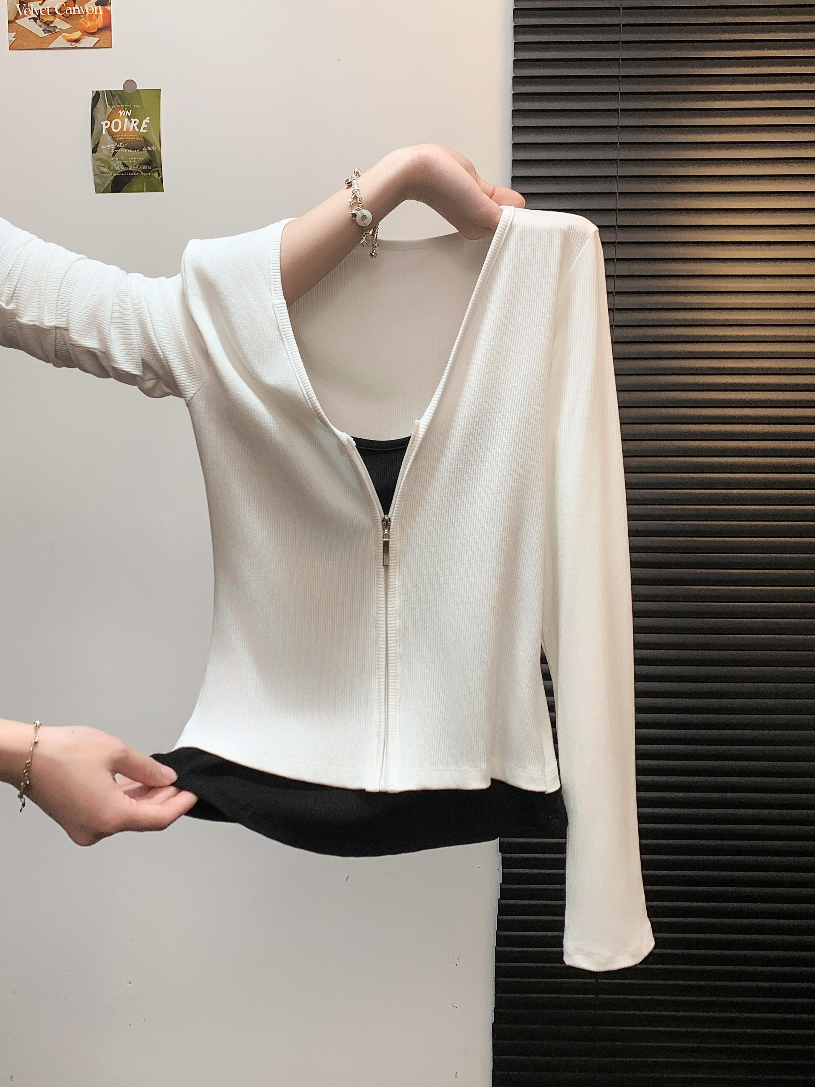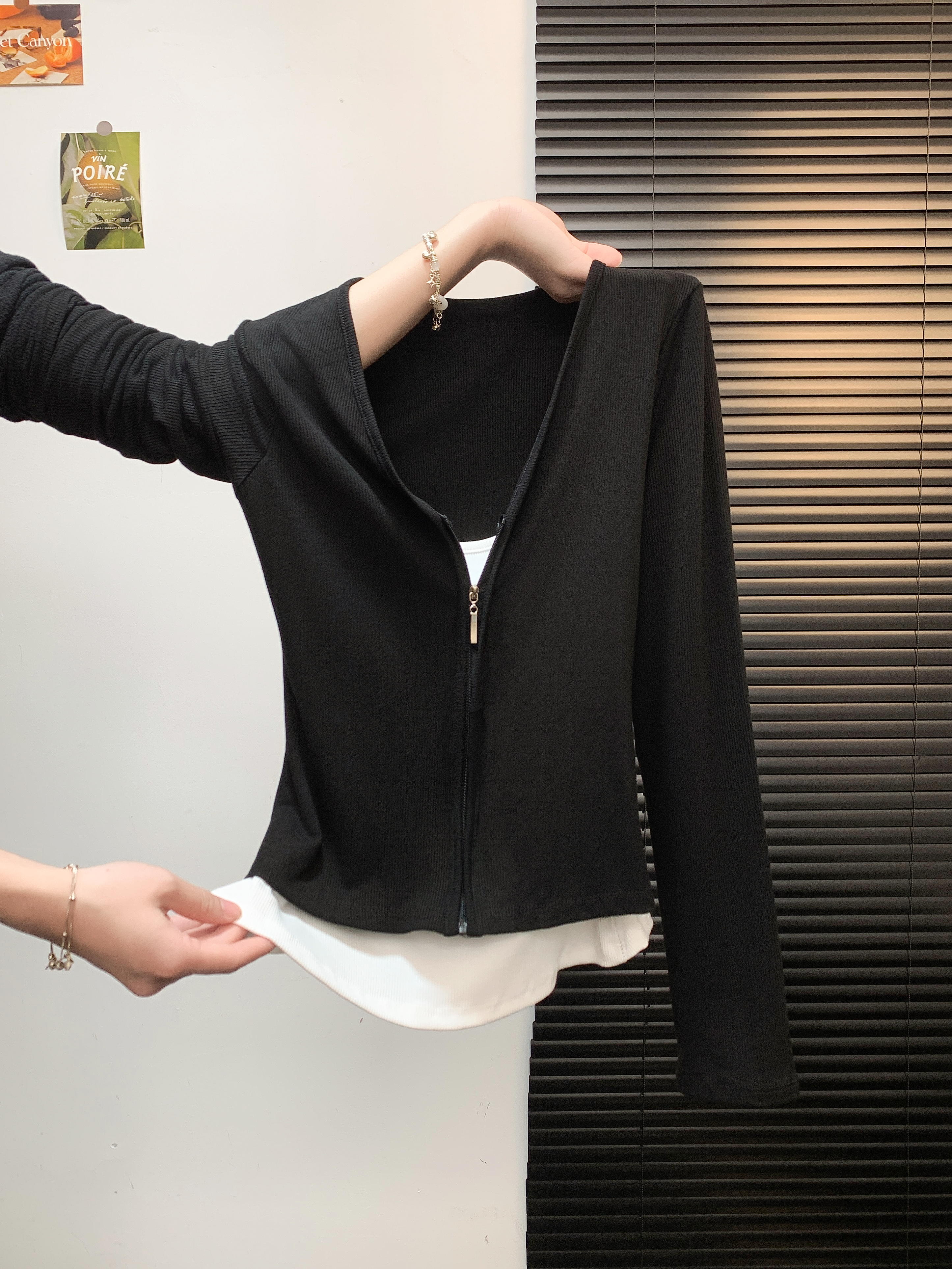 FA48459# 韩系港味休闲外搭短款修身开衫百搭假两件上衣黑色打底衫女 服裝批發女裝批發服飾貨源
