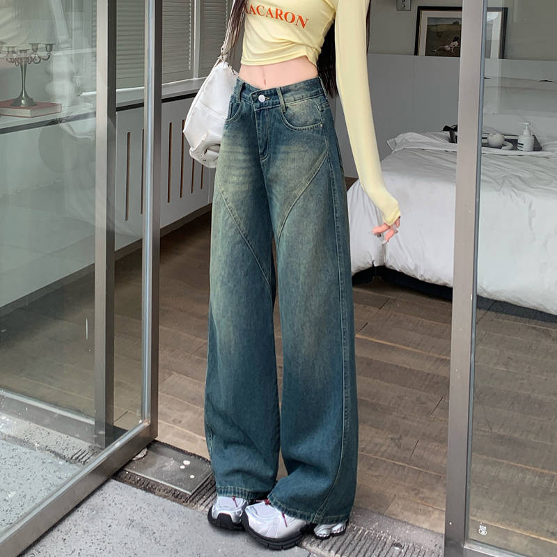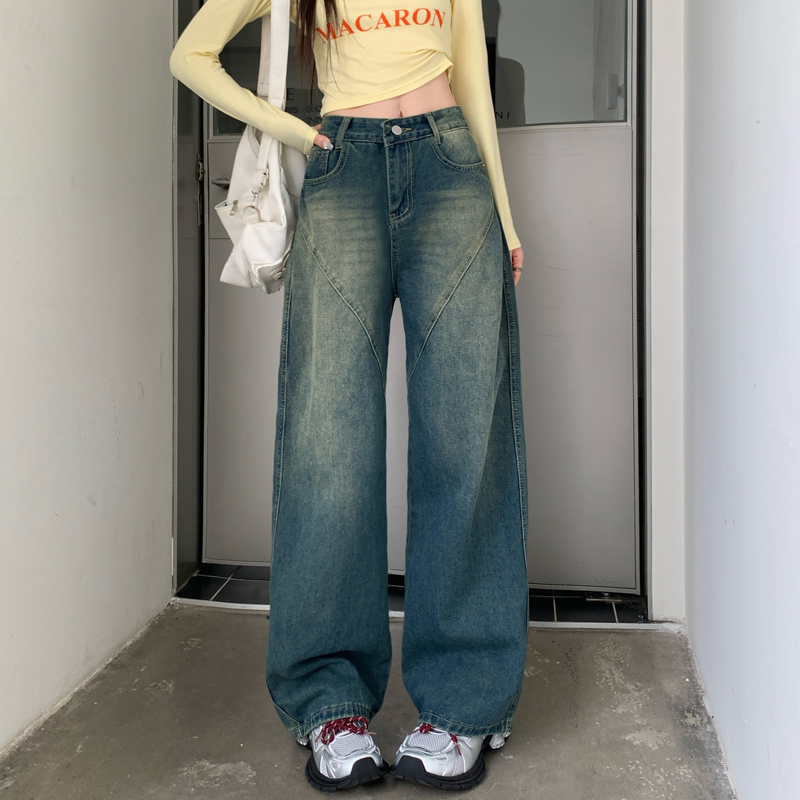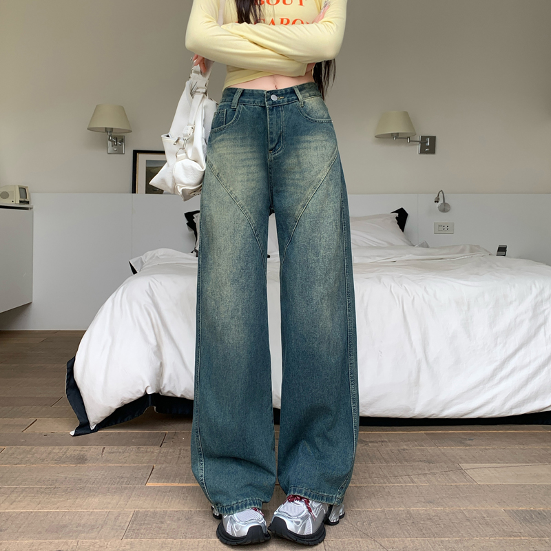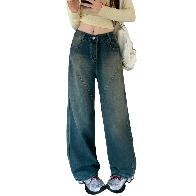 FA48501# -美式拼接复古牛仔裤女设计高腰宽松大码胖mm阔腿直筒拖地裤 服裝批發女裝批發服飾貨源