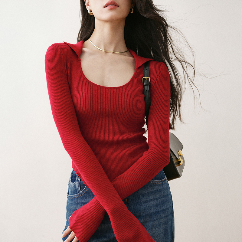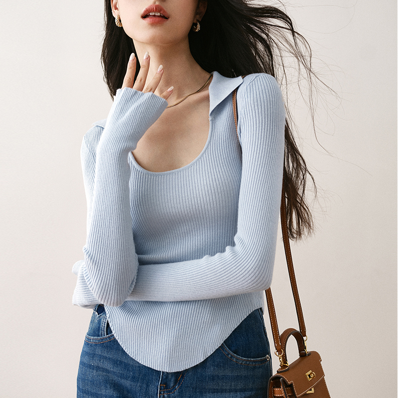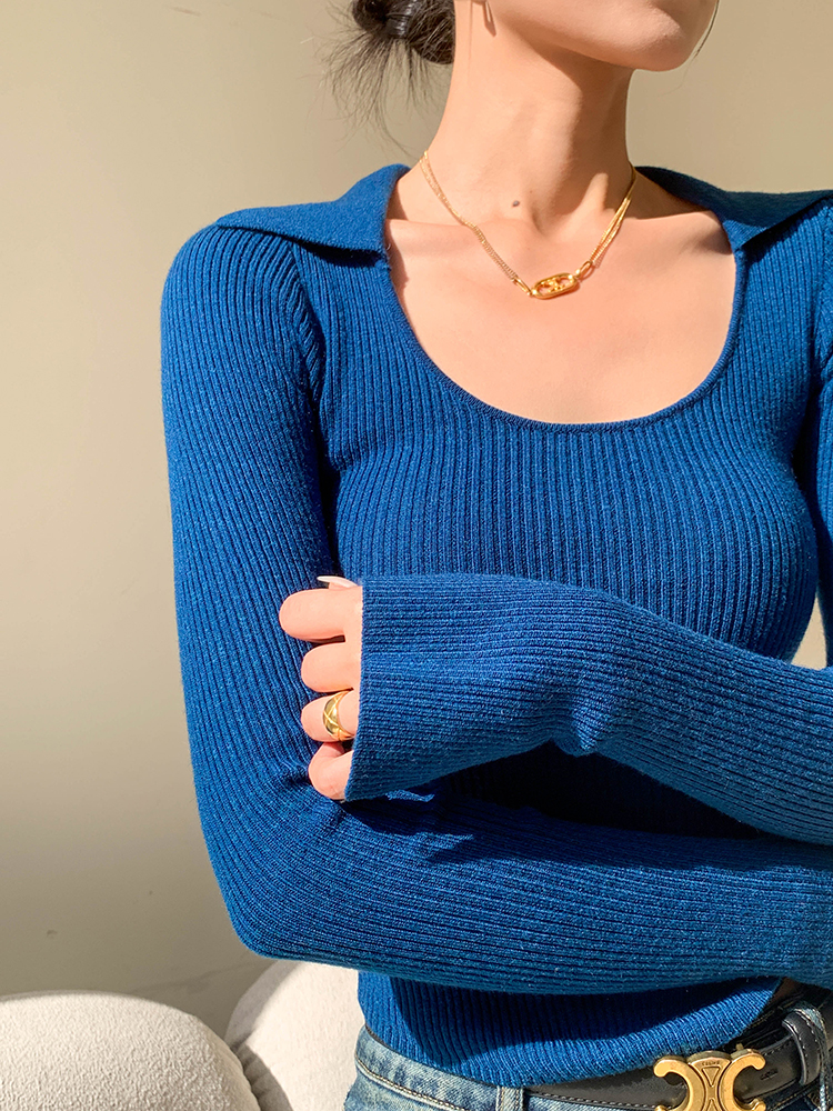 FA48781# 蓝色圆领长袖针织衫女早秋新款修身显瘦打底内搭上衣 服裝批發女裝批發服飾貨源