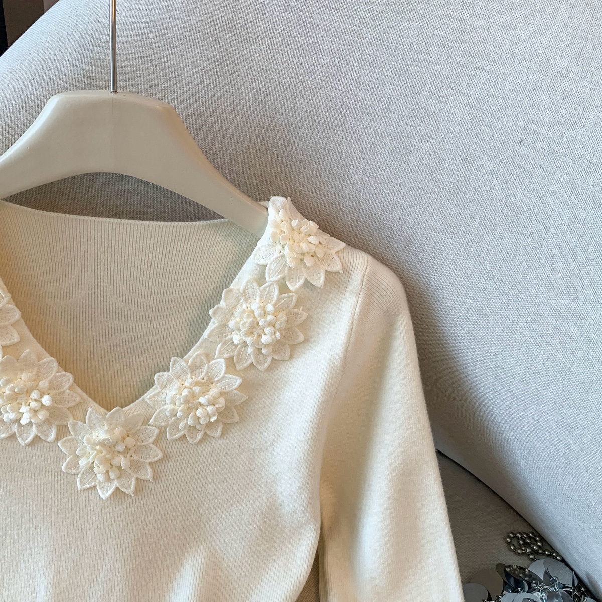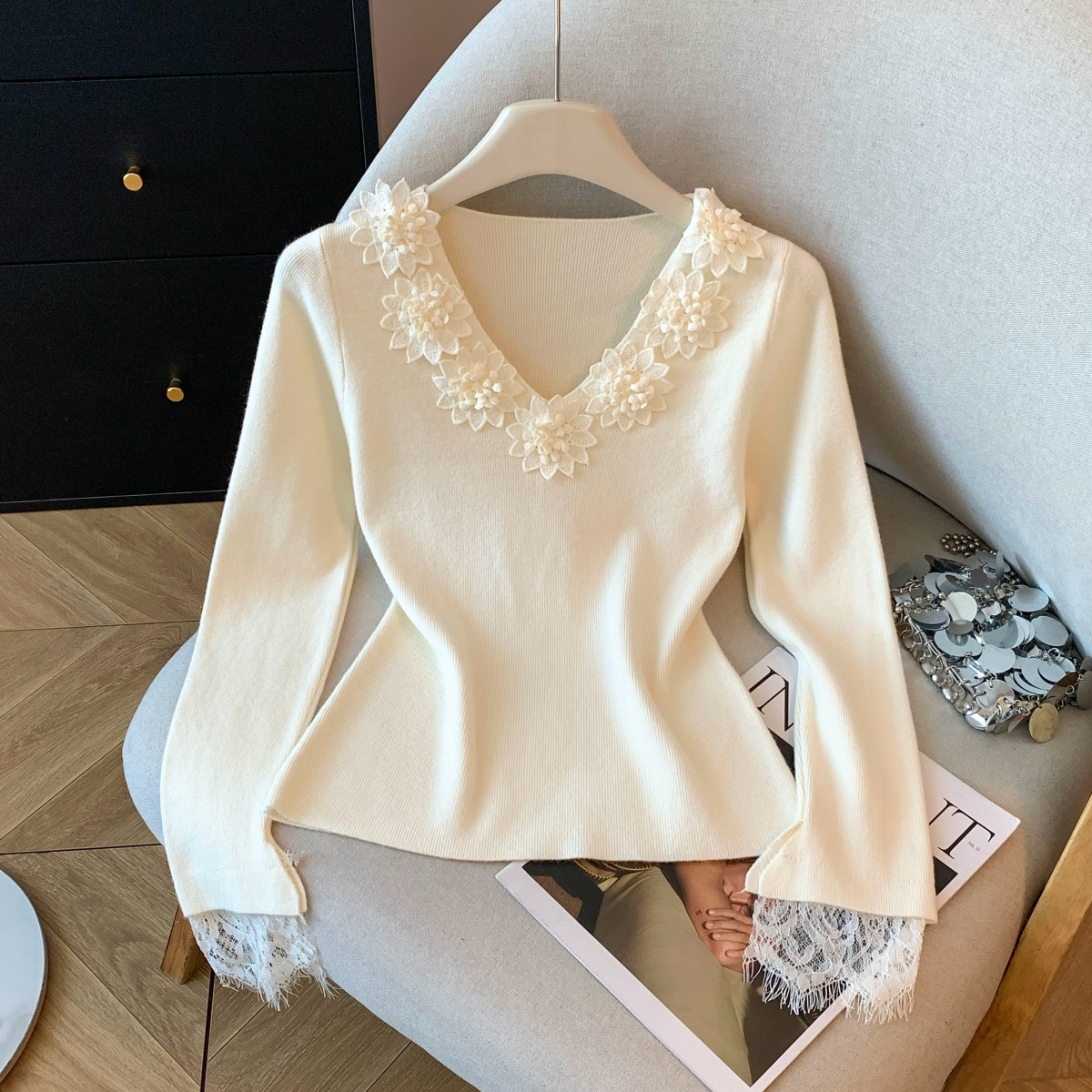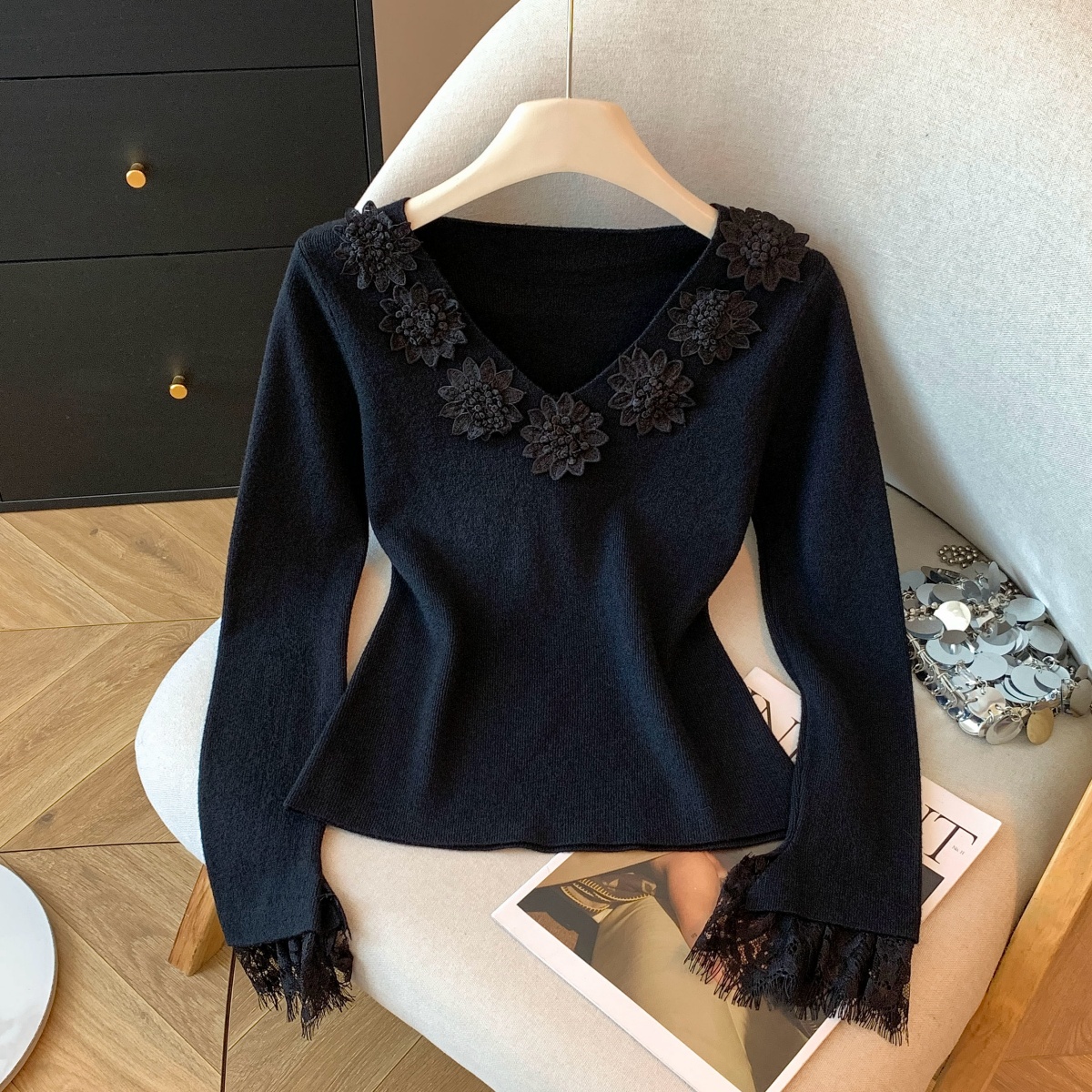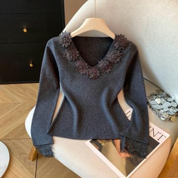 FA48789# 秋冬新款法式立领花朵V领针织衫女蕾丝拼接长袖毛衣 服裝批發女裝批發服飾貨源