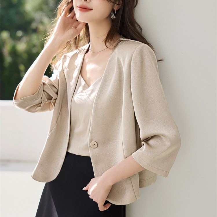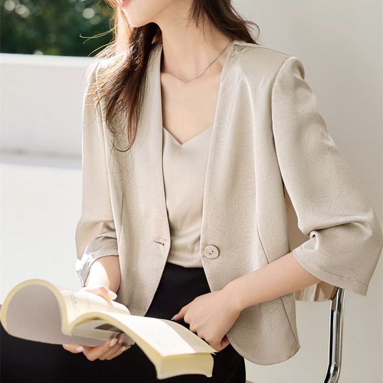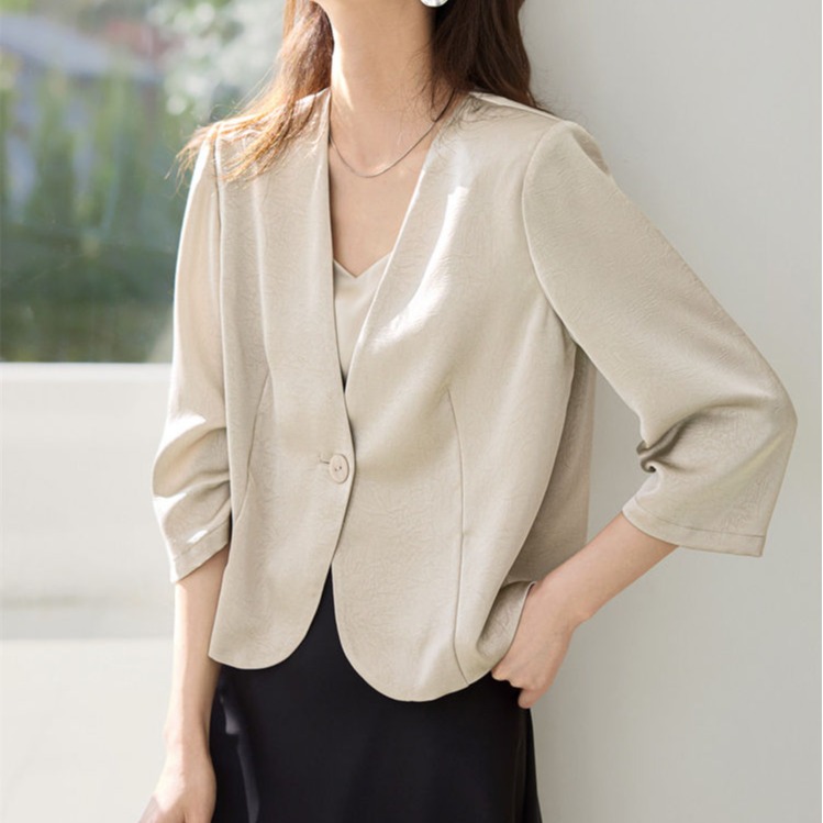FA49019# 气质简约通勤微皱缎面七分袖v领外套女秋新款上衣 服裝批發女裝批發服飾貨源