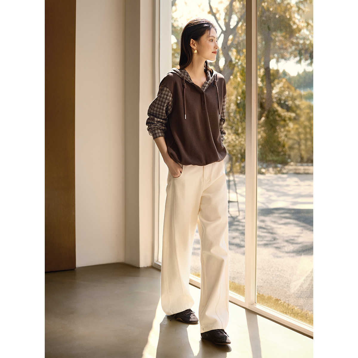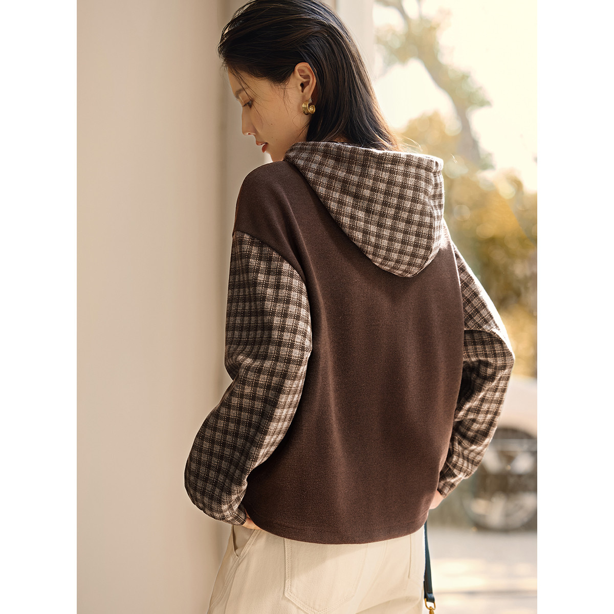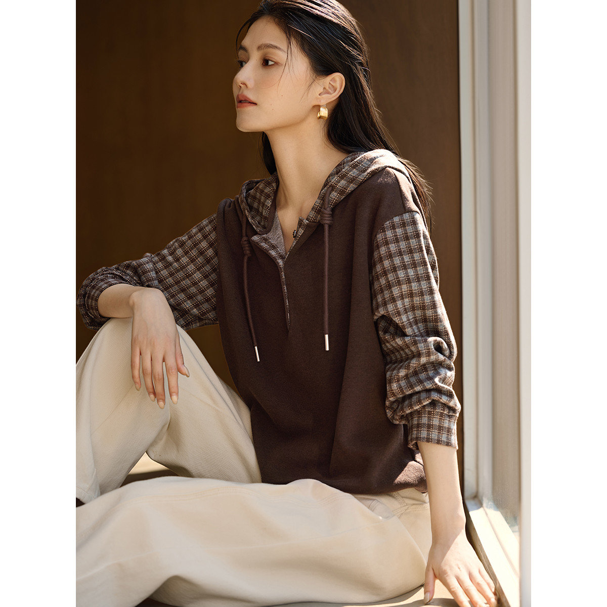 FA49027# XWI复古格纹拼接卫衣秋冬磨毛松弛感显瘦假两件连帽卫衣 服裝批發女裝批發服飾貨源