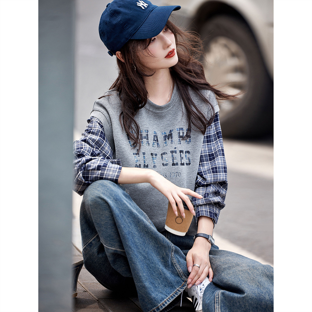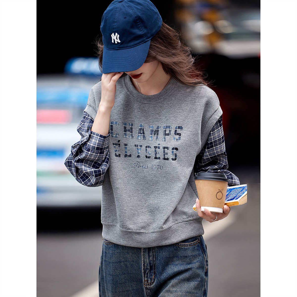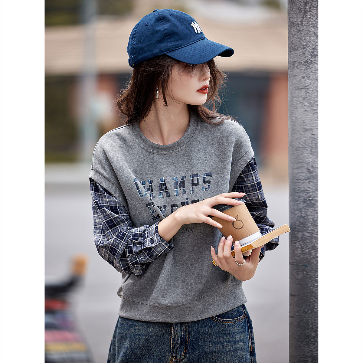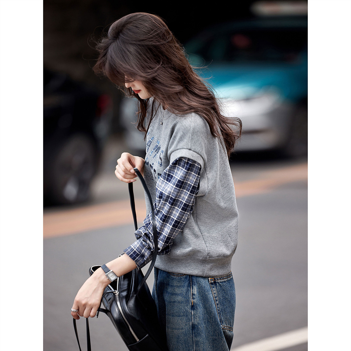 FA49034# 假两件秋季减龄气质格纹宽松拼接套头拼色卫衣 服裝批發女裝批發服飾貨源
