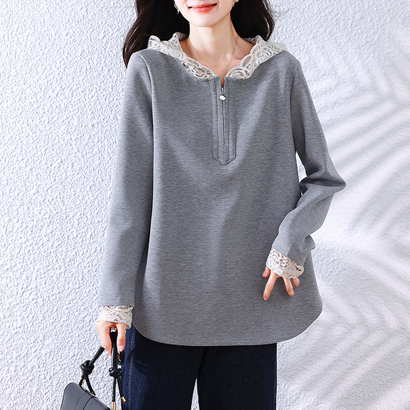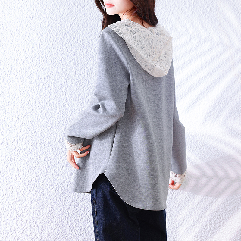 FA49038# 秋季新款宽松显瘦重工蕾丝拼接套头百搭时尚长袖连帽卫衣 服裝批發女裝批發服飾貨源