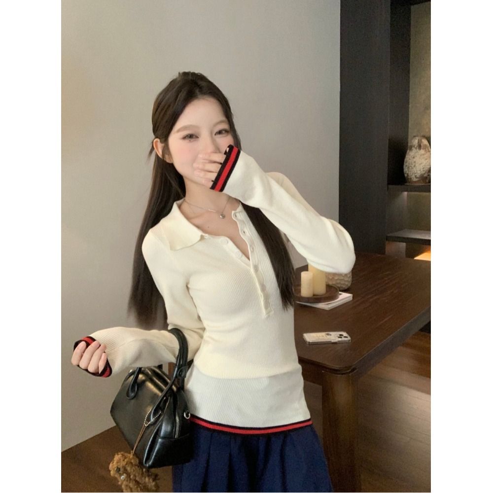 FA54283# 复古撞色条纹Polo领针织衫女秋冬修身显瘦长袖上衣毛衣女 服裝批發女裝批發服飾貨源