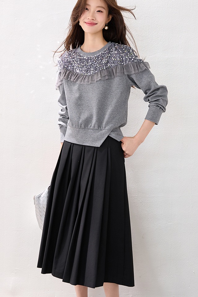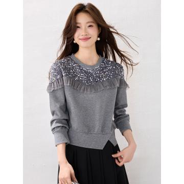 FA54979# 春装新款圆领套头珠片荷叶边打底衫上衣时尚百搭卫衣女 服裝批發女裝批發服飾貨源